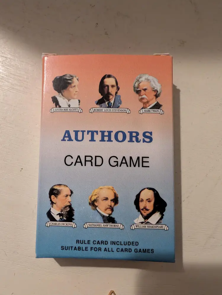 Classic vintage card game featuring famous authors like Louisa May Alcott and William Shakespeare. This set is in great condition and includes a rule card, making it perfect for literary enthusiasts and collectors. Enjoy a nostalgic game night with this charming piece of history.