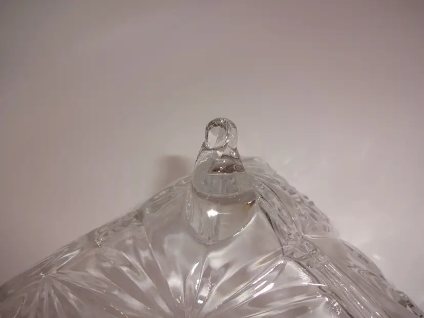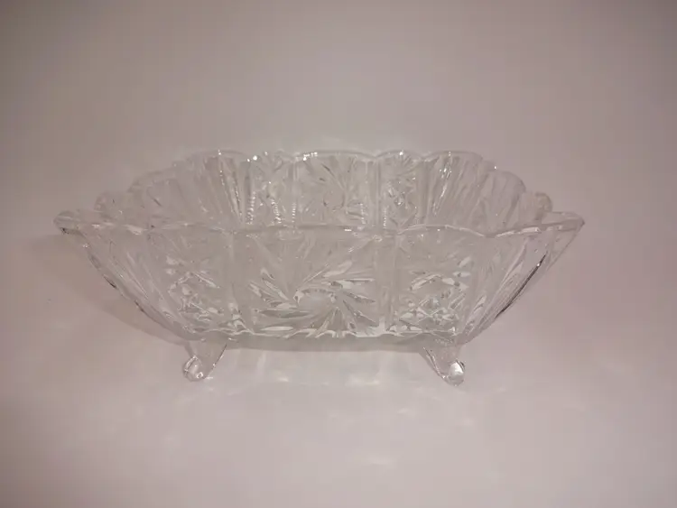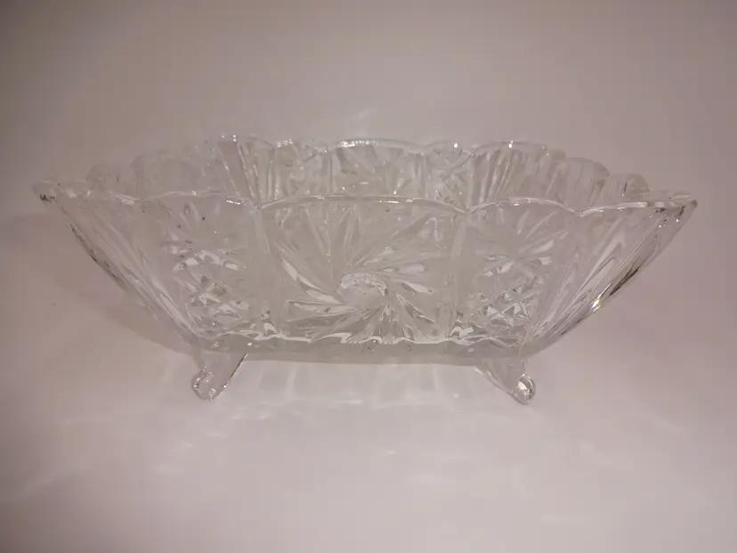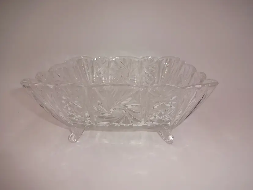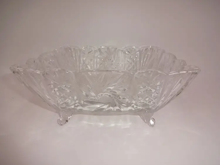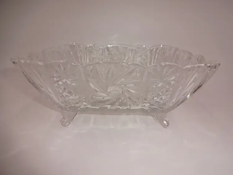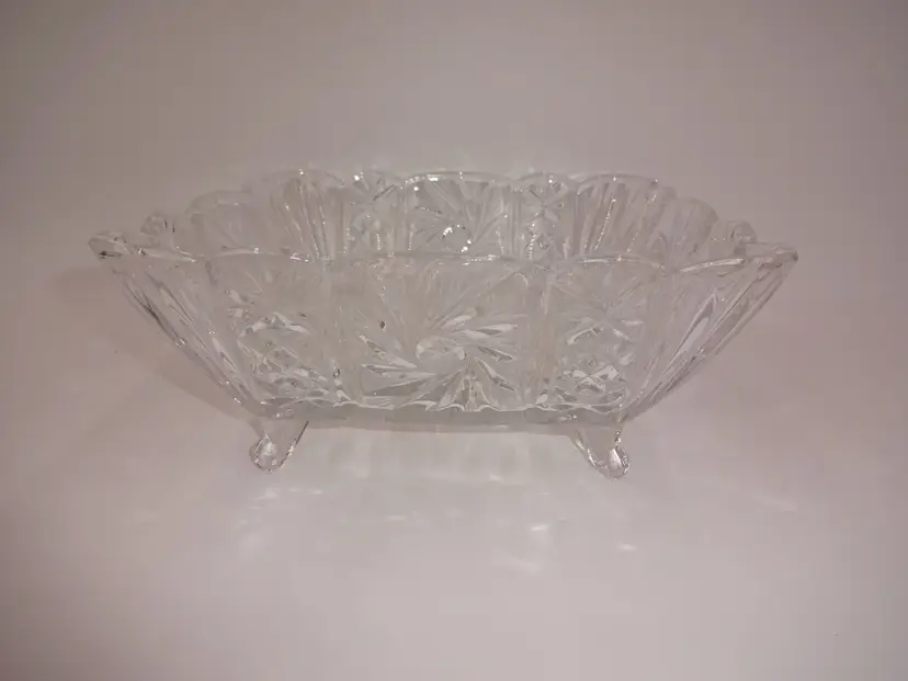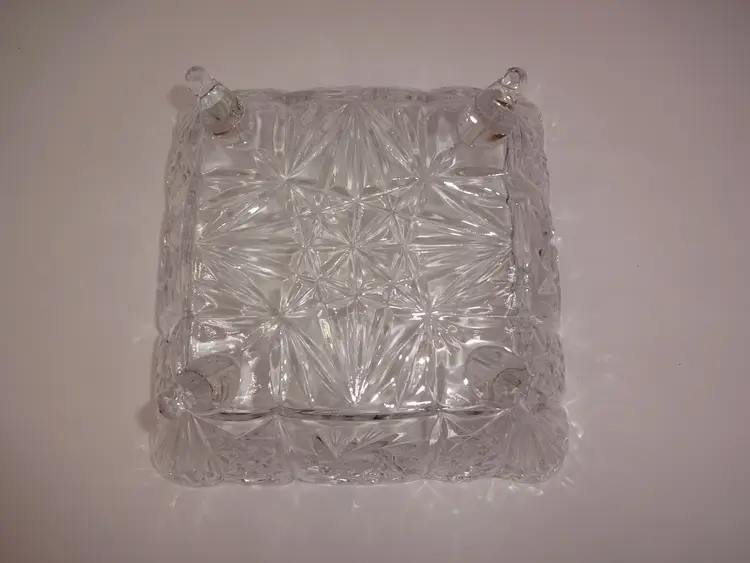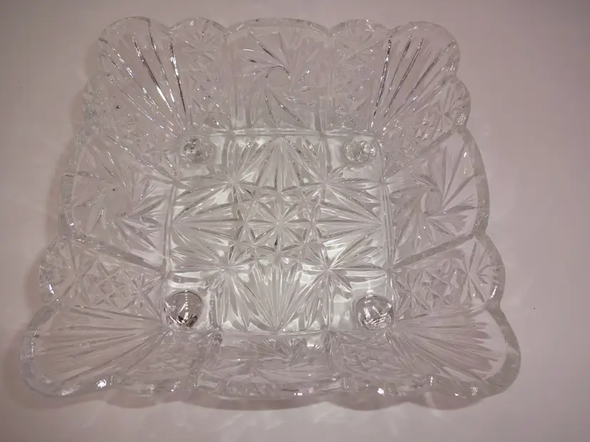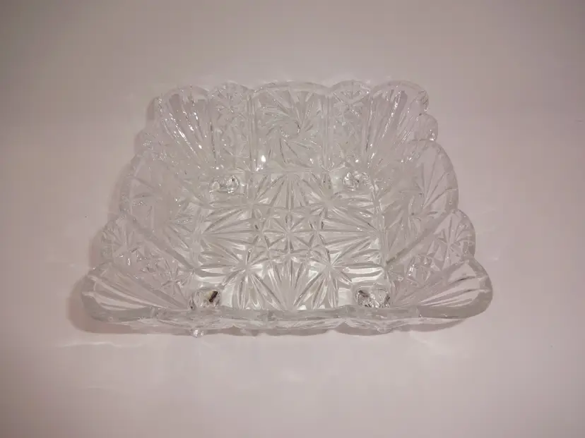 Good pre-owned condition. A square, clear, hand-cut crystal, four footed bowl or dish with scalloped edges and featuring pinwheels and stars. Approximate measurements (widest/tallest points): 8" x 3-1/2". No cracks or stains. One chipped foot (still stands even).