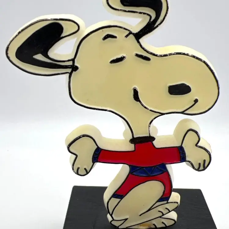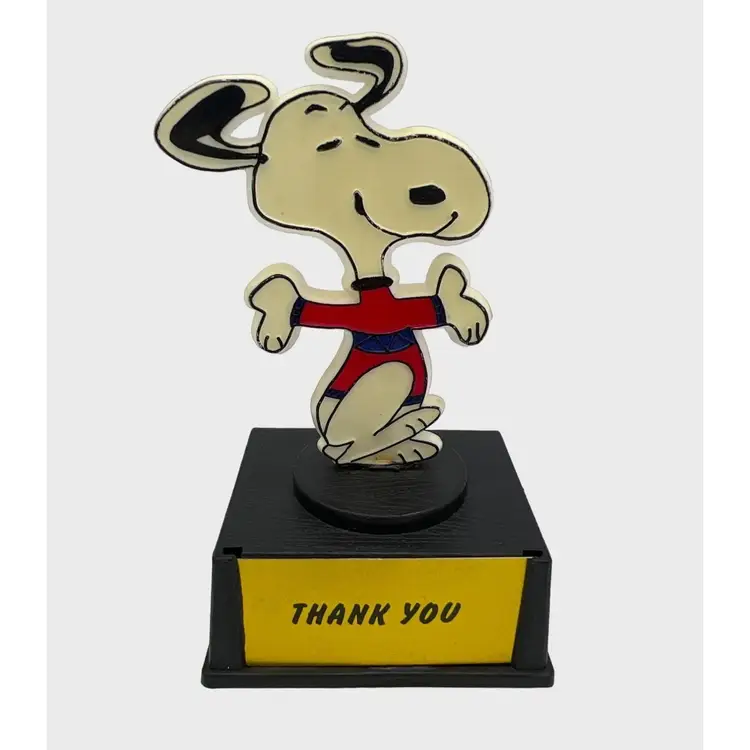Vintage Snoopy "Thank You" gift trophy / figurine. It features Snoopy from the Peanuts gang doing a dance. It was made in Hong Kong by Aviva. This is most likely from the 1970s. The item measures approximately 5" tall.
