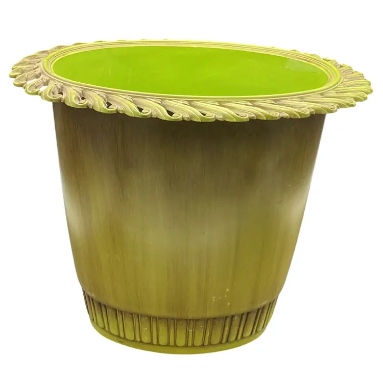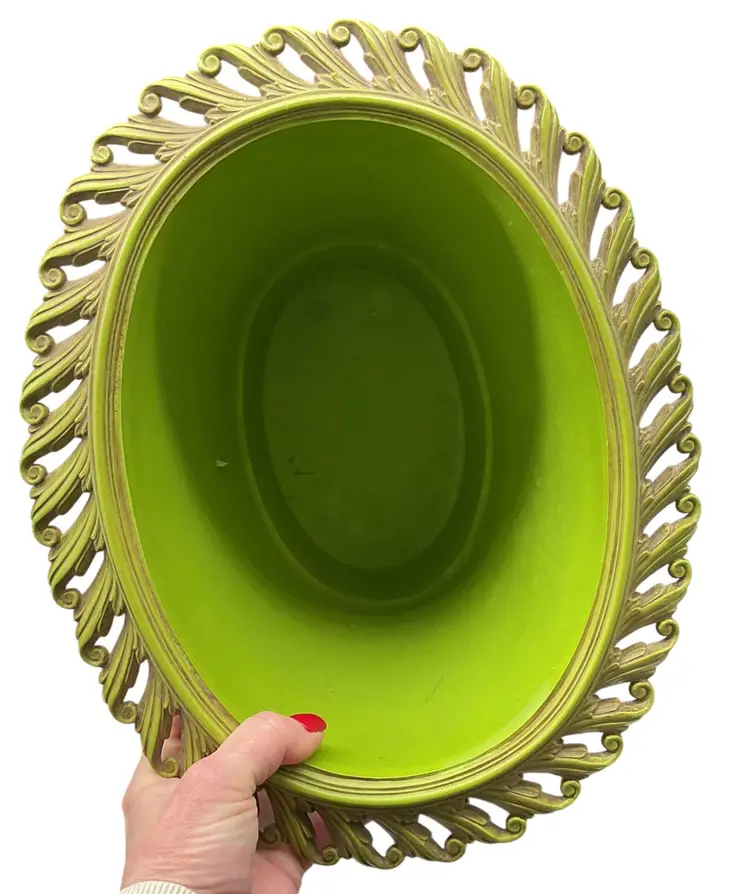 • Durable plastic material • Dimensions: 11.5" height x 13" width • Ornate scrollwork rim design • Retro avocado green finish • Made in the USA