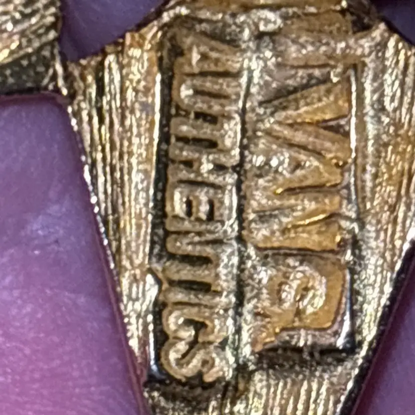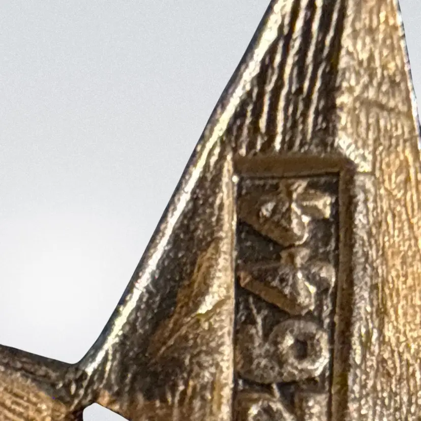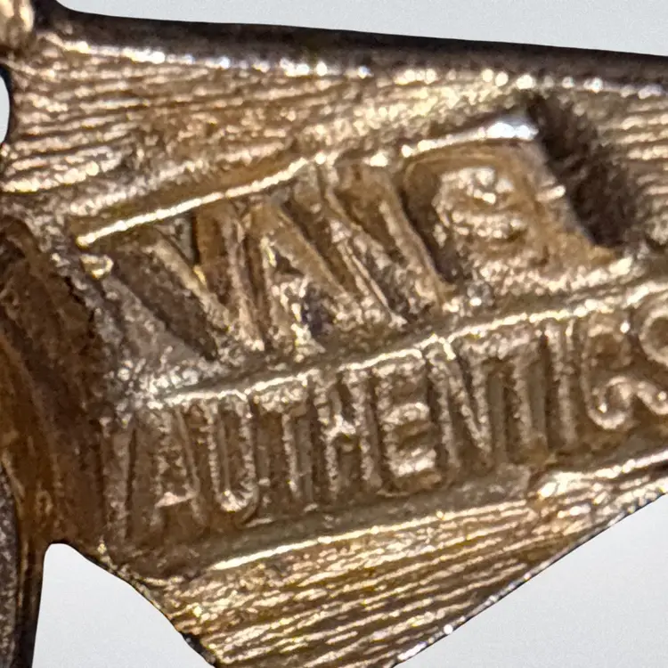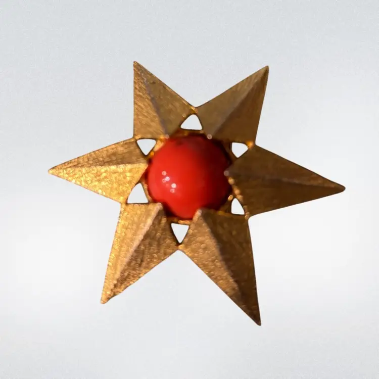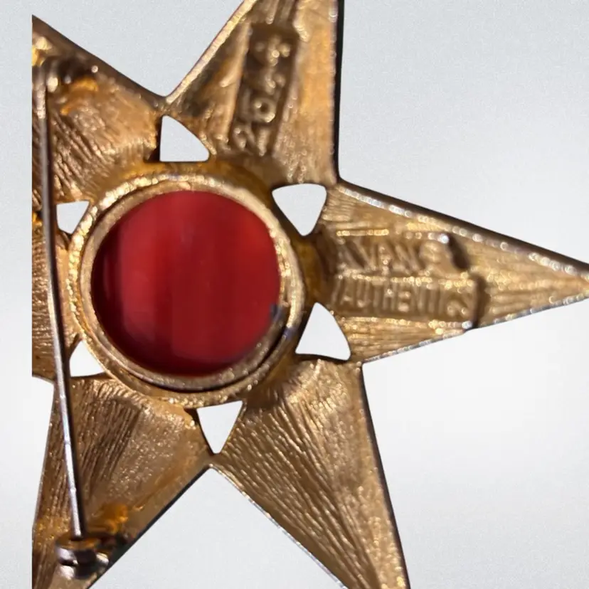 Bold Mid-Century Modern starburst brooch by Avon, from their early “Authentics” line. Features a dimensional six-pointed textured gold-tone star design with a vivid red cabochon center. Marked Avon Authentics on the reverse. • Size: approx. 2” across • Materials: gold-tone metal, resin cabochon • Condition: Very good vintage condition; minimal surface wear