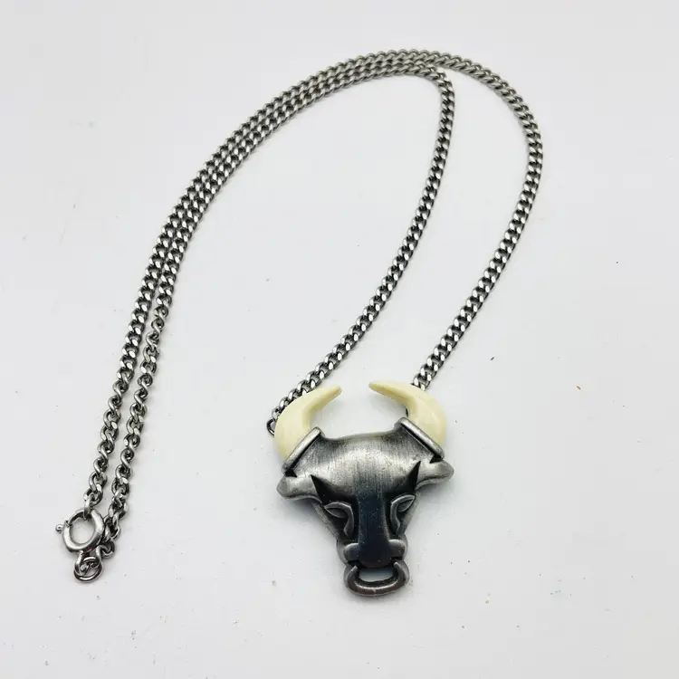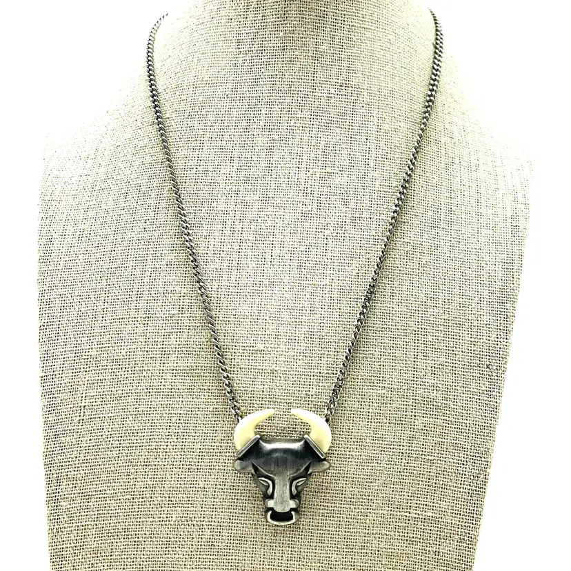 Features a distinctive bull or steer head pendant with cream colored plastic horns