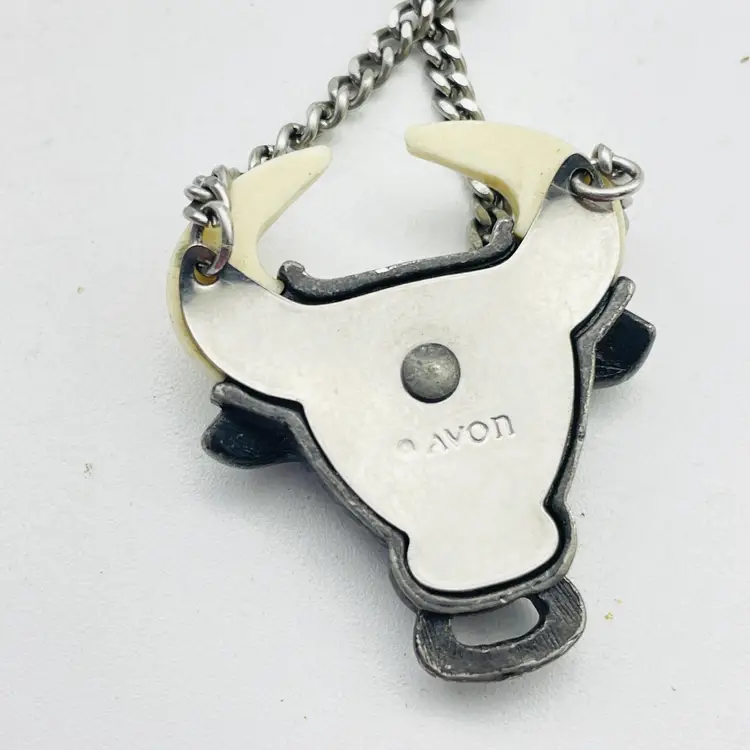 Pendant and chain are silver tone metal, chain measures approximately 20 inches long Back of pendant is stamped "Avon" (see photo) Western, Southwestern, cowboy, or rodeo inspired style – unique statement piece Spring ring clasp for secure closure Perfect for collectors, costume, or everyday wear Condition: Good vintage condition with light wear from age, no major flaws noted. See all pictures for close-up details.