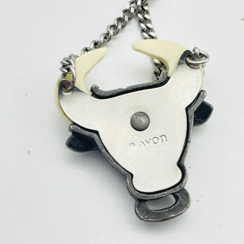 Vintage Avon Bull Head Pendant Necklace Silver Tone Chain Western Southwestern