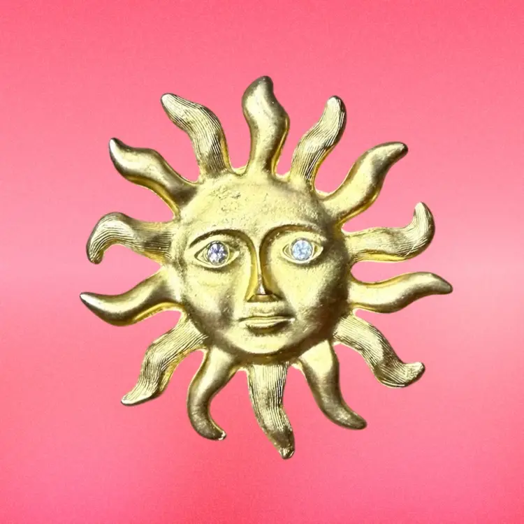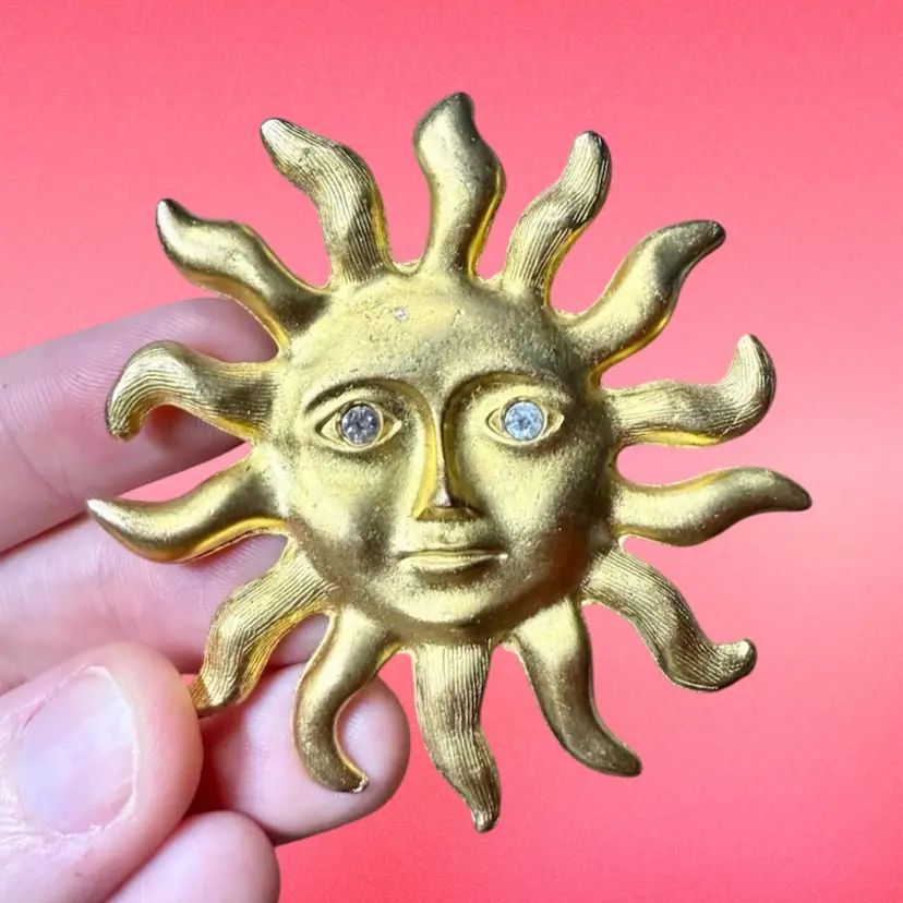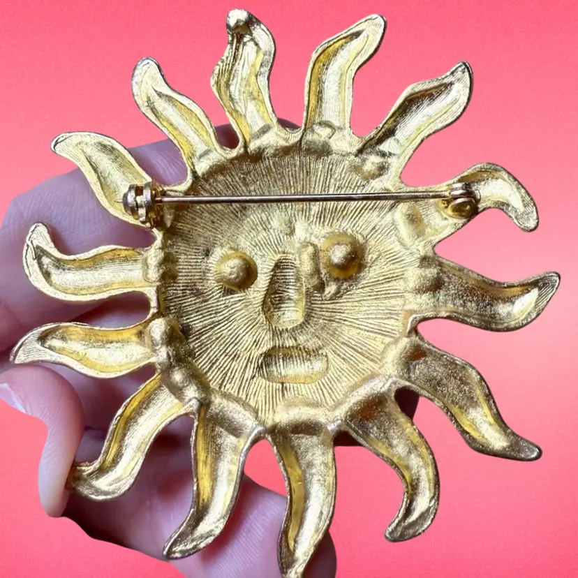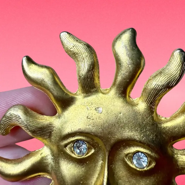 2.5”. Has some very slight wear to the gold tone. Most notably, there’s a small dent/knick on the sun face, above the eyes. See picture. Clasp is a little loose, could use a squeeze to be tightened a bit. I’m not seeing a signature anywhere on the brooch, but I’m seeing it listed everywhere as Avon.