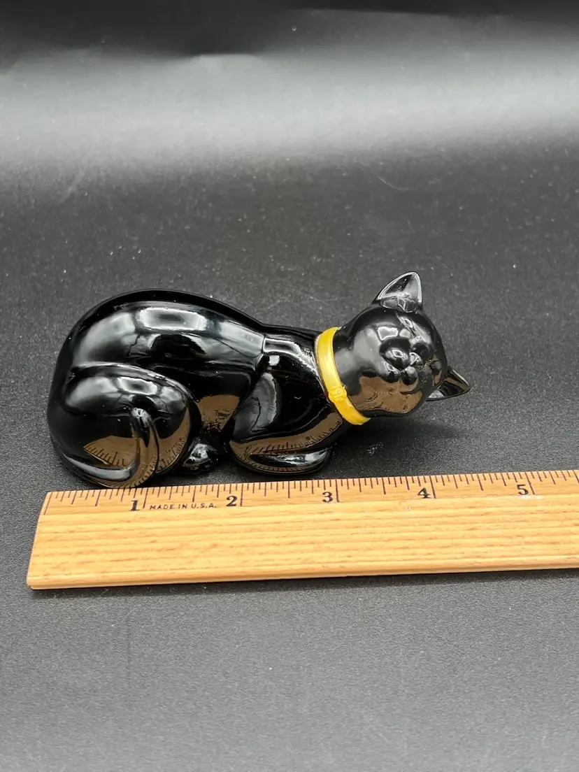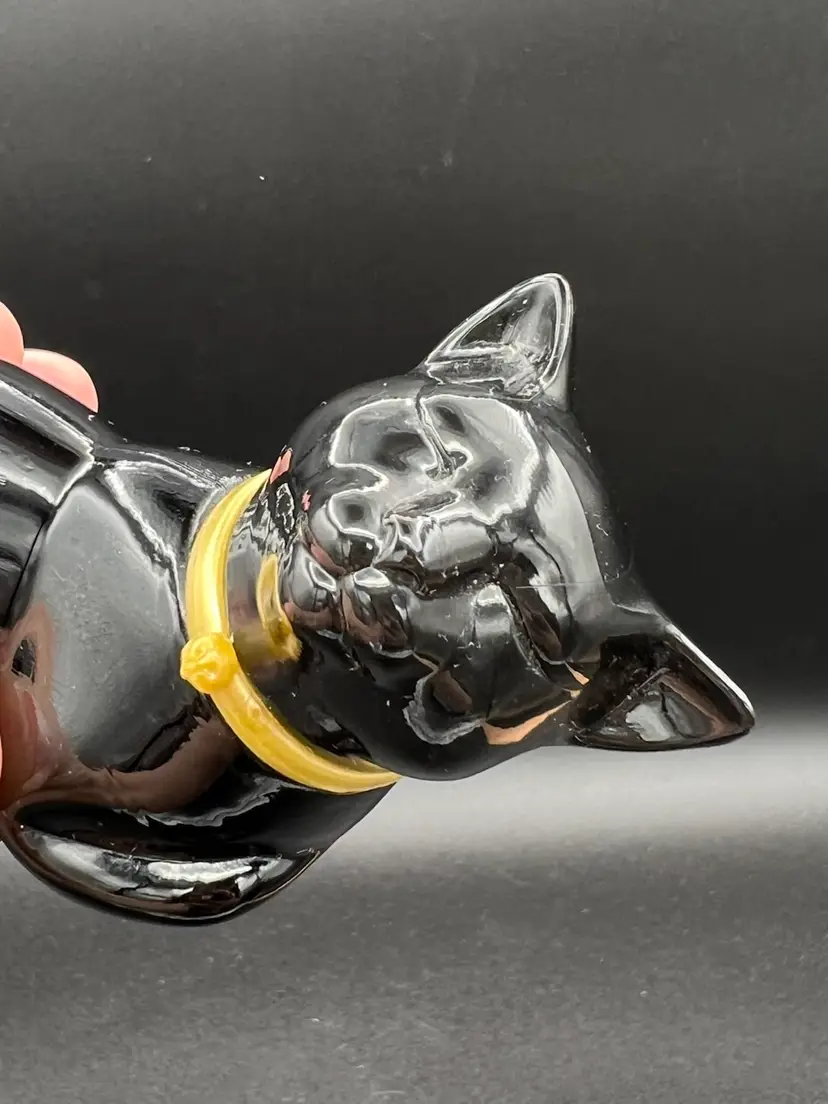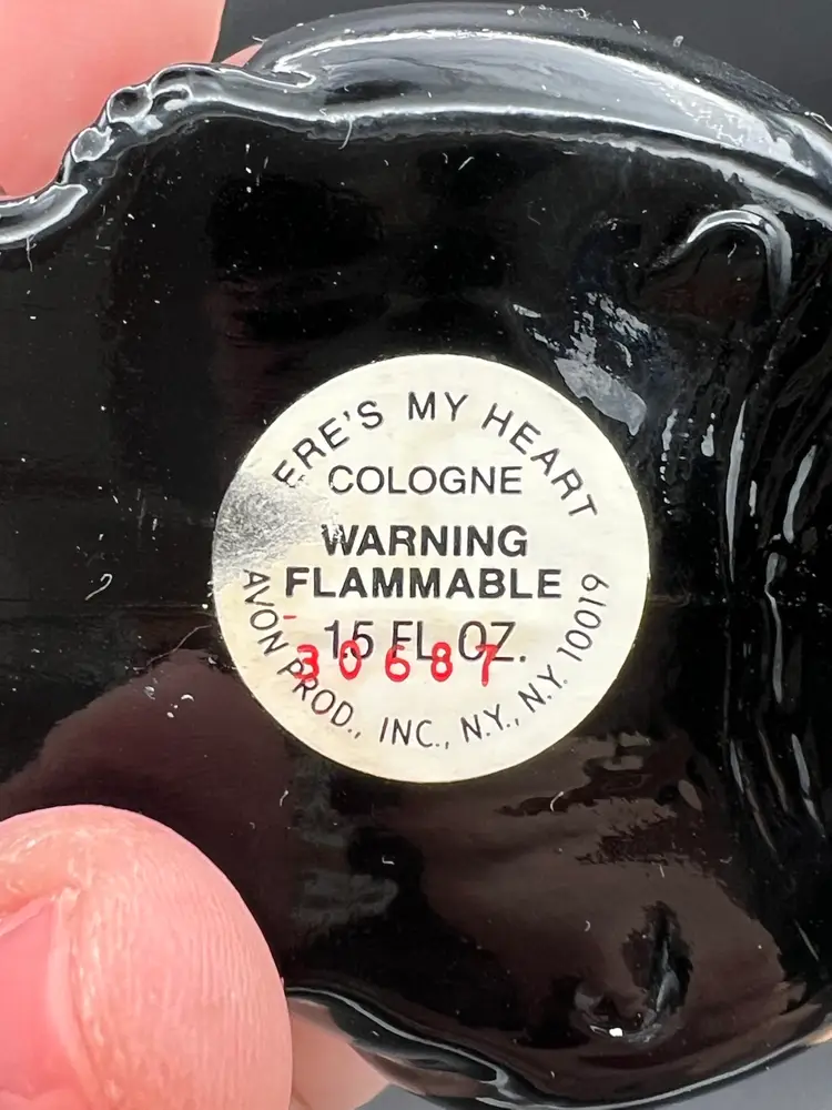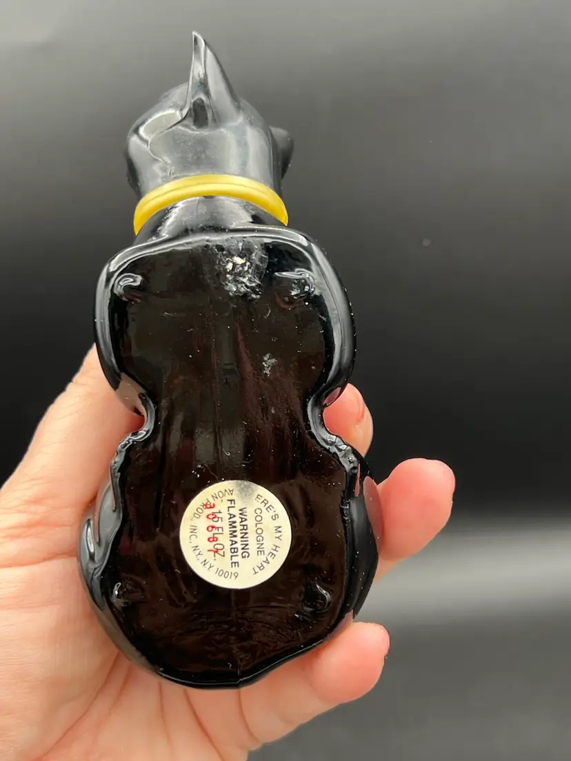 The Vintage Avon Cologne "Here's My Heart" Black Cat Bottle Figurine is a charming collectible piece featuring a heart-shaped bottle with a black cat design. Made of glass and measuring 1.5 oz, this Avon product is a nostalgic decorative item perfect for cat lovers and collectors alike. The intricate details and classic pattern make it a unique and eye-catching addition to any space, adding a touch of vintage charm with a hint of whimsy.
