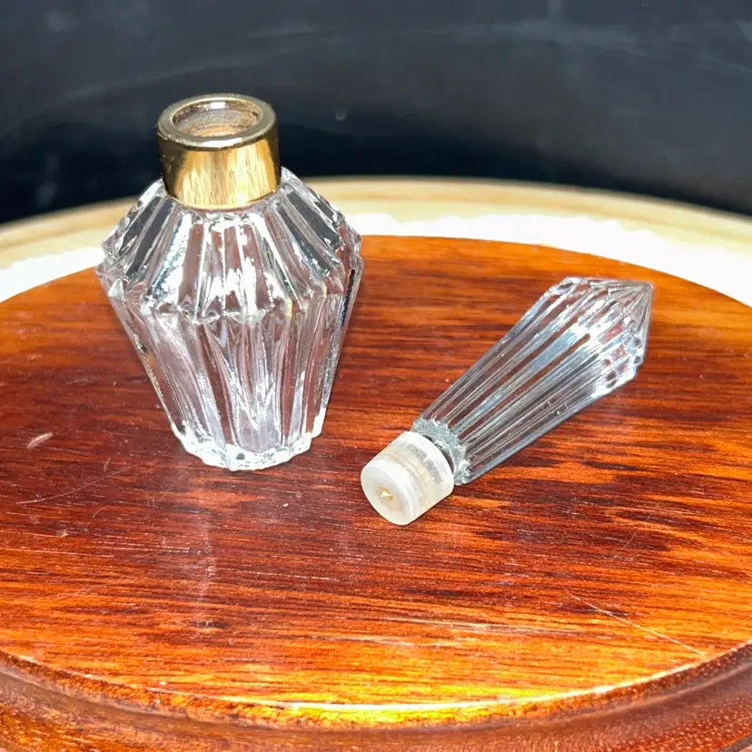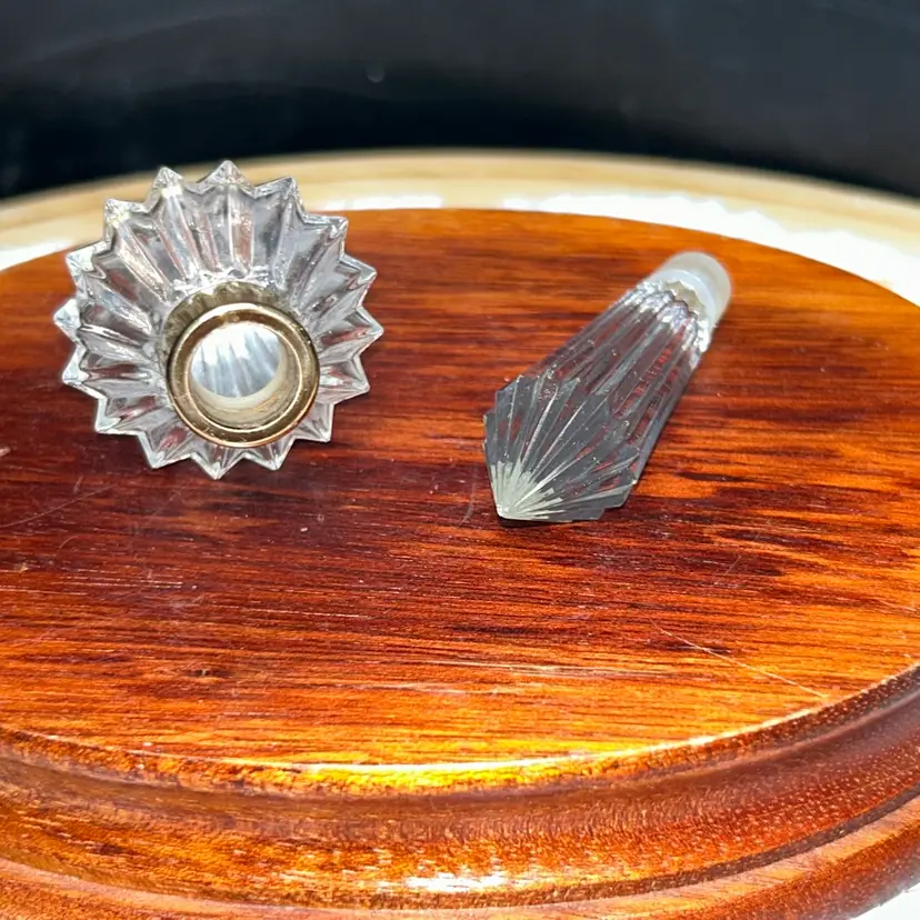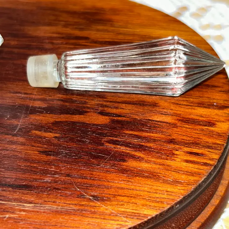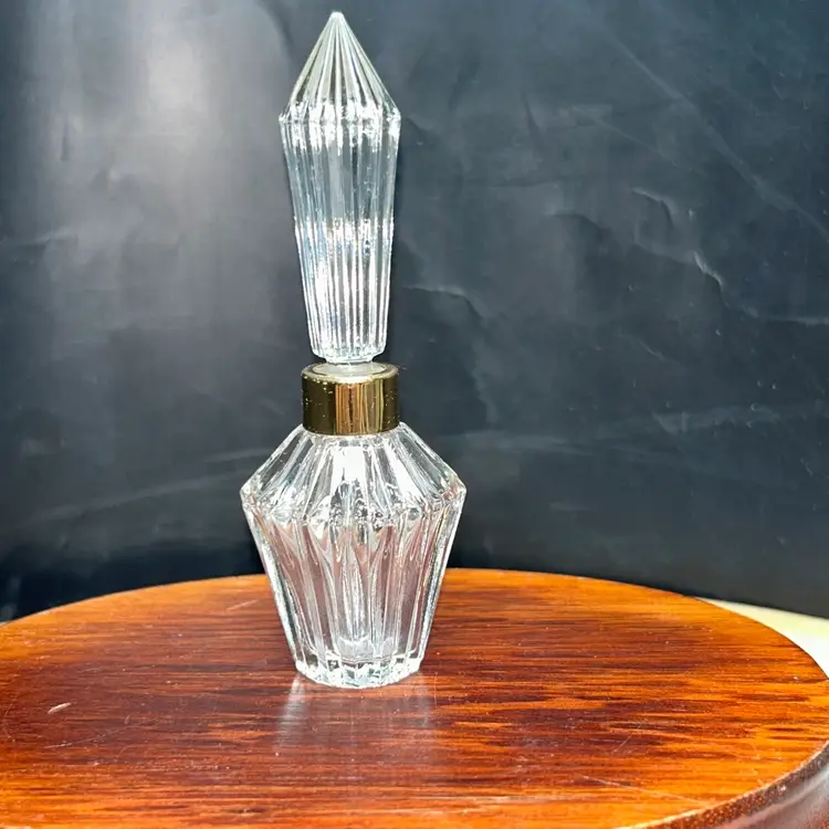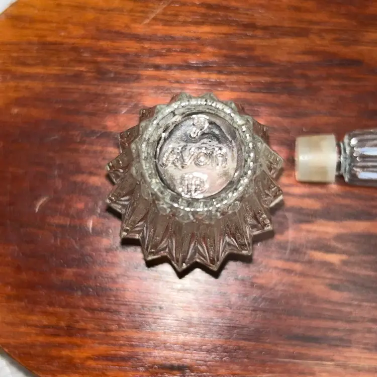 Volume is 0.5 ounces. Slightly taller than 4”. Approximately 1.5” diameter at widest, slightly less than 1” diameter at base, opening is 0.5” in diameter. Stopper had a plastic covering that slides into the opening. Marked “Avon” on bottom. Bottle and stopper are in excellent condition. No chips or scratches.