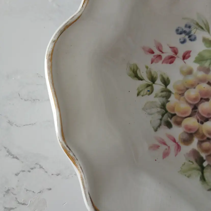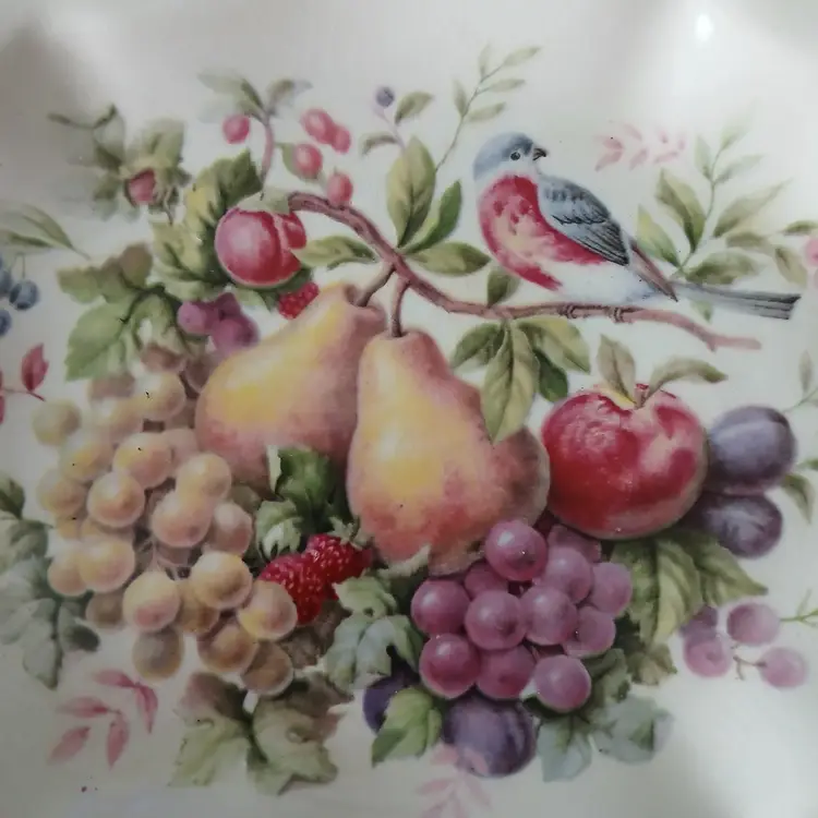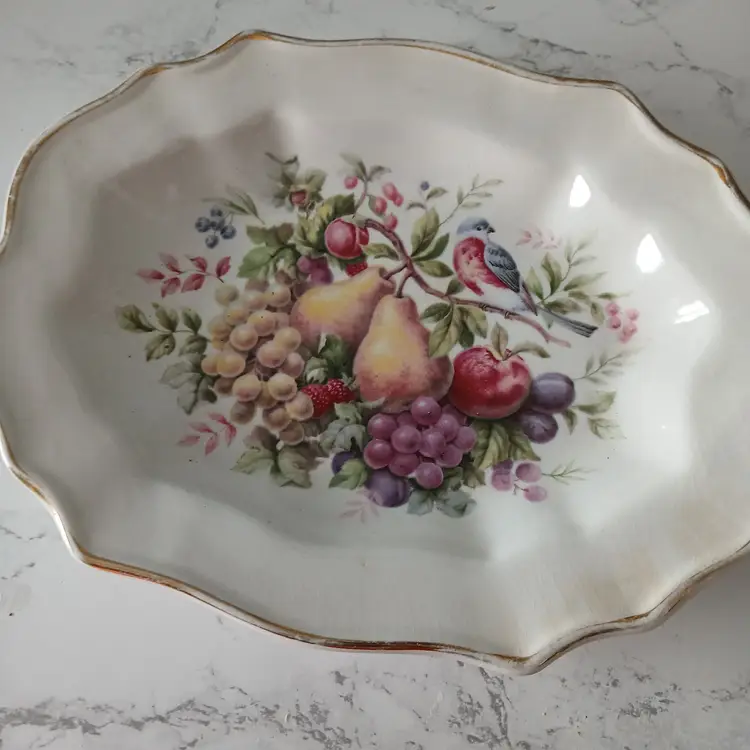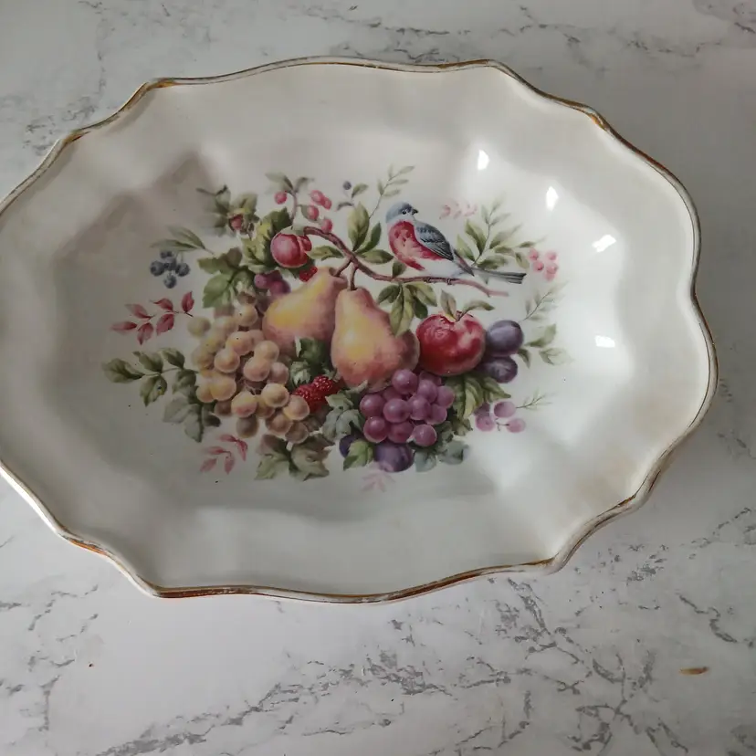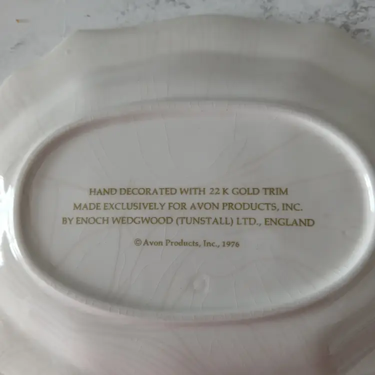 Beautiful little Vintage oval plate made around 1976 by Enoch Wedgewood Ltd. Exclusively for Avon. Has stunning floral and bird design with gold trim, the trim is a little worn here and there but still Beautiful plate for your plate wall 9" x 7"