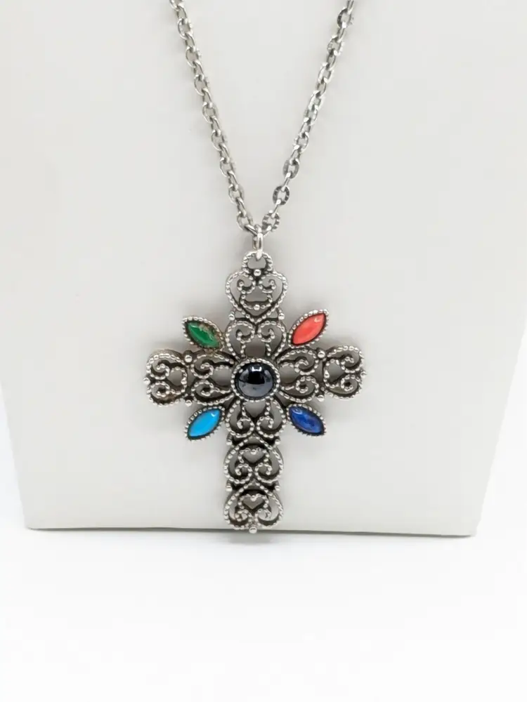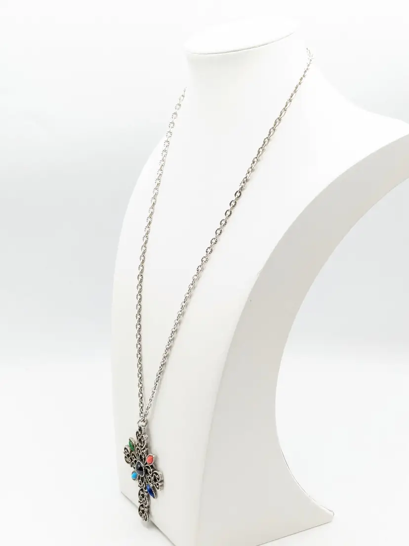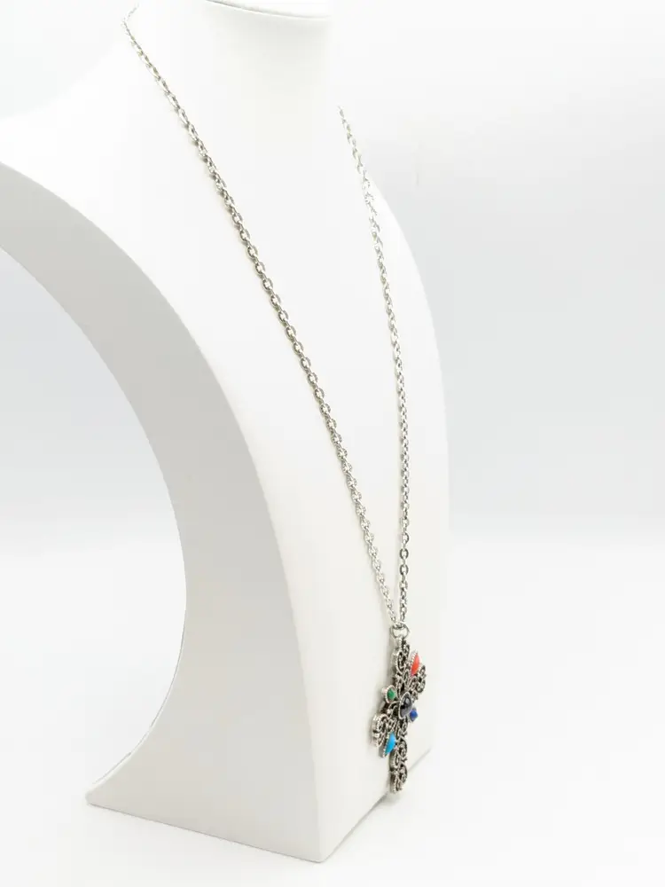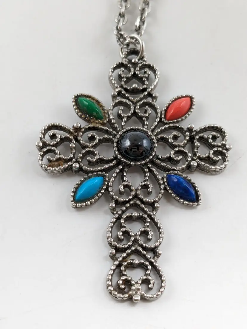 Good condition. Chain measures 24" and cross is 3" length and 2" wide.