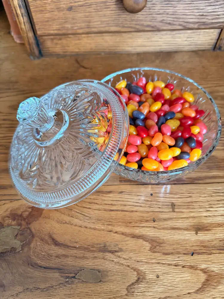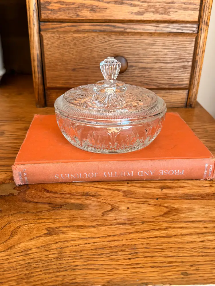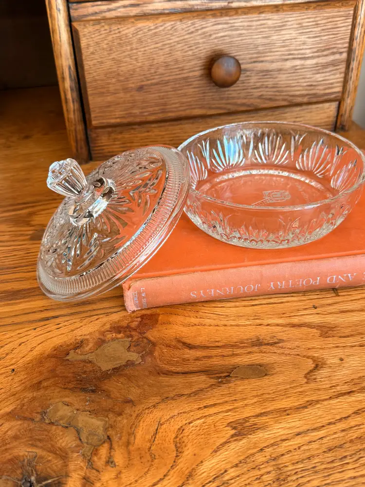 Add a touch of vintage charm to your home with this classic Avon pressed glass candy dish. Featuring a beautifully textured pattern and matching lid with a decorative knob, this timeless piece is perfect for both display and everyday use.