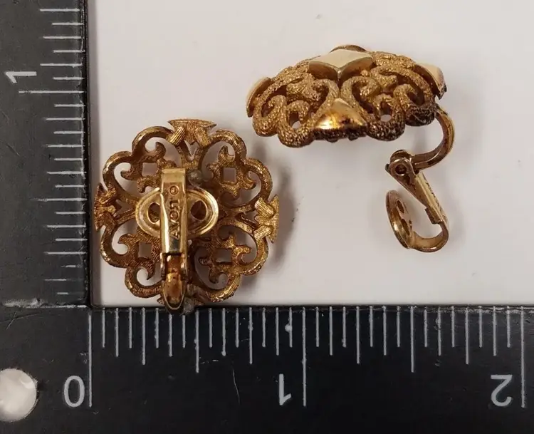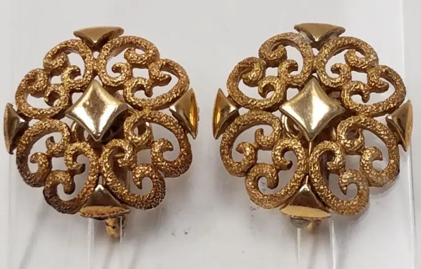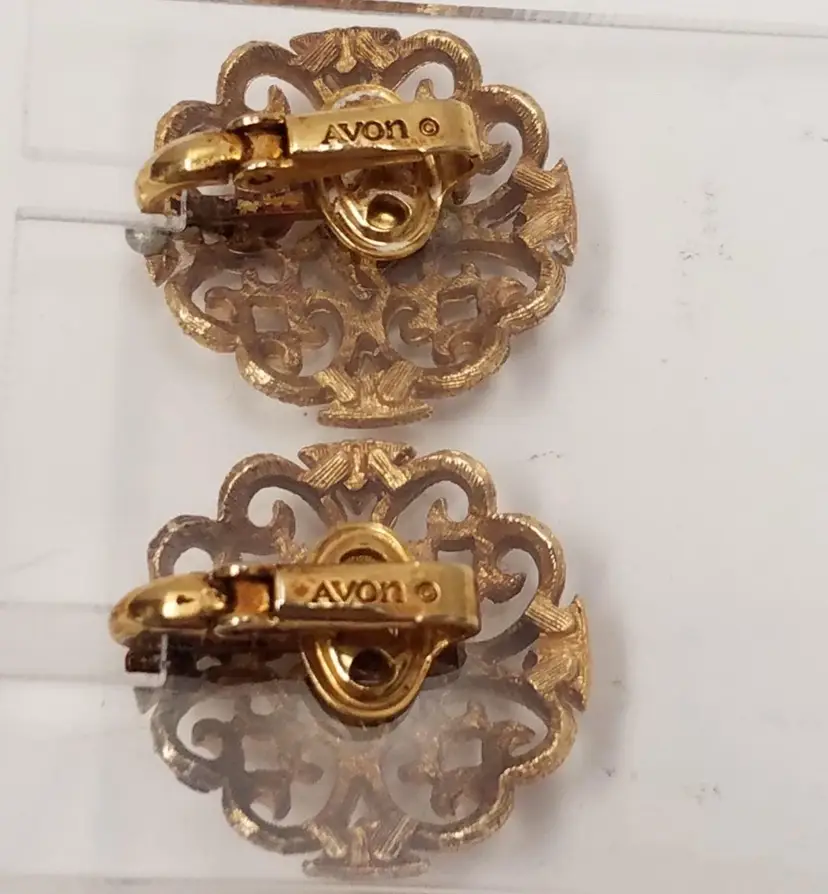• Brand: Avon (Signed on the back of the clips) • Style: Retro / Filigree / Button • Color: Rich Gold-Tone • Finish: Textured matte filigree with polished accents (center diamond and outer points) • Fastening: Secure clip-on backs • Dimensions: Approximately 1 inch in diameter (see photos for scale) Condition • Overall: Excellent vintage condition. • Metal: The gold-tone plating remains bright. Some minor, natural patina may be present on the back consistent with age. • Functionality: Clips are firm and in perfect working order.