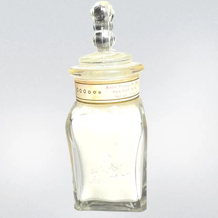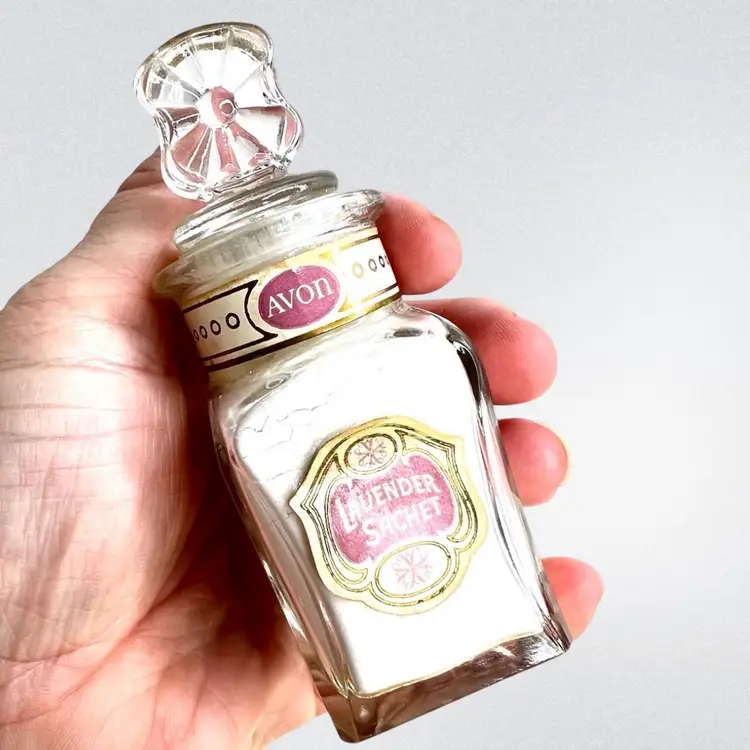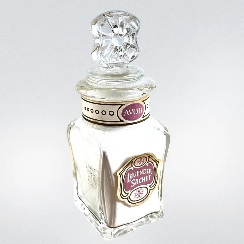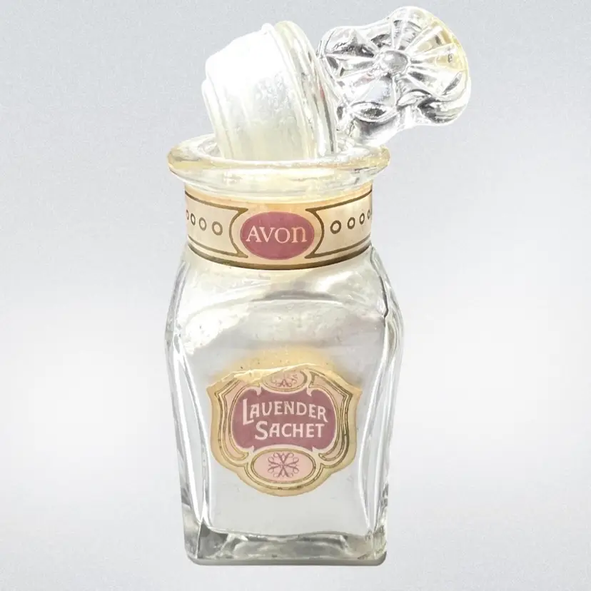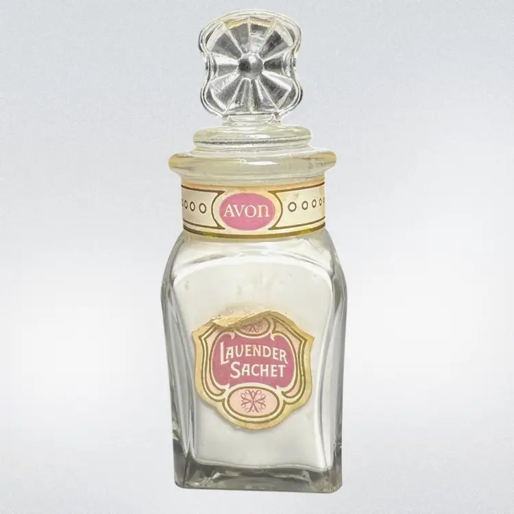 Vintage Avon ‘Lavender Sachet’ Powder. Clear Glass Apothecary Jar. Unsealed- For Display Purposes Only. Smells amazing (fine powder floated up when took stopper off for photo). The apothecary style bottle jar is certainly fantastic collectible. 4” x 1-1/2” x 1-1/2” Condition: Yellowing of the paper labels, front label coming off slightly. Stopper is snug and strong. No chips or cracks to jar.