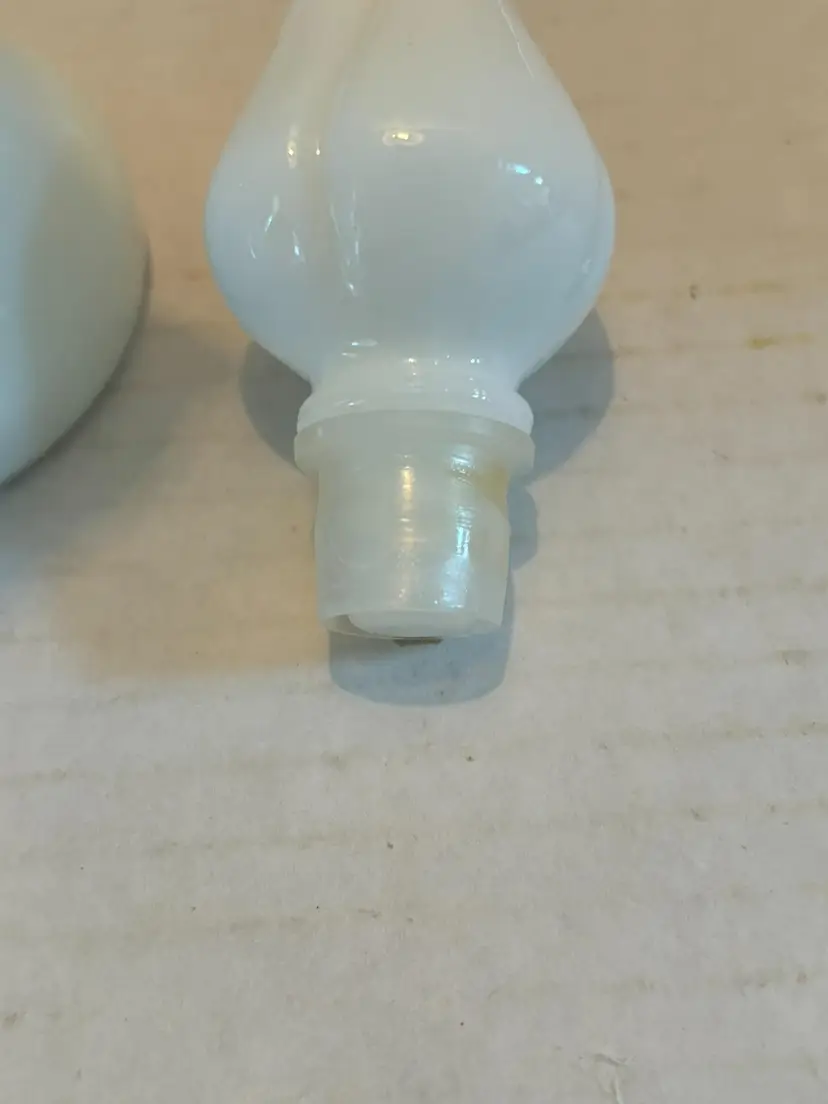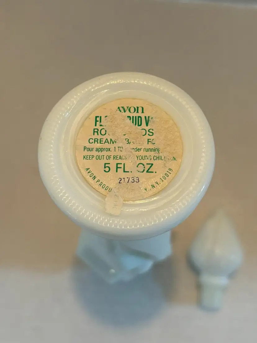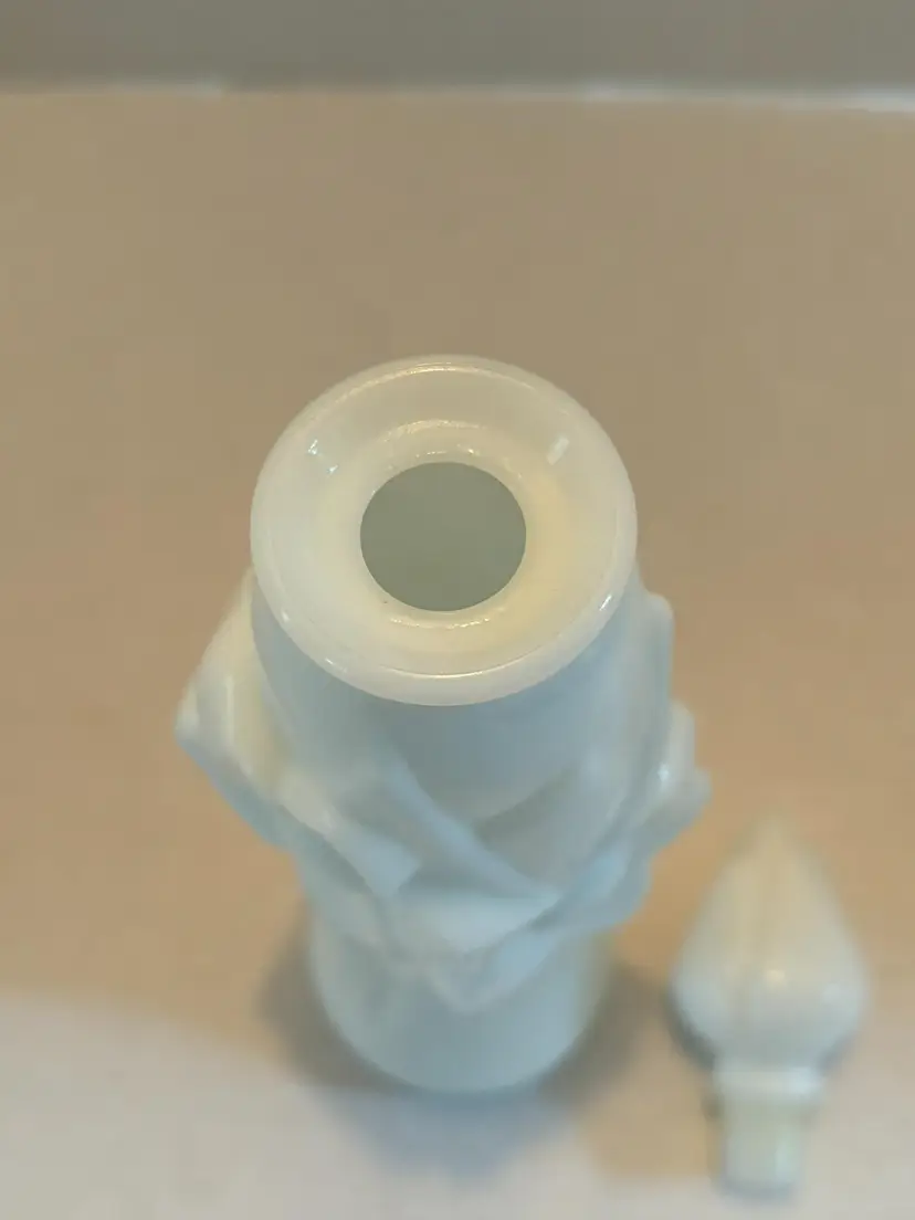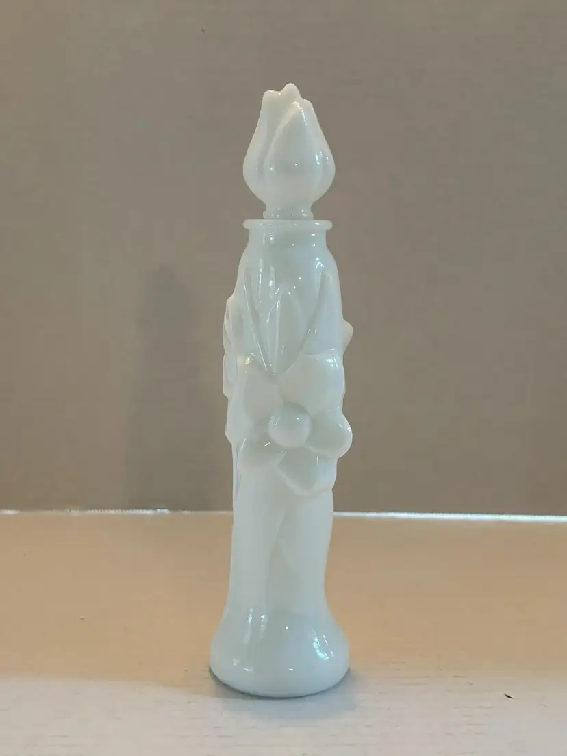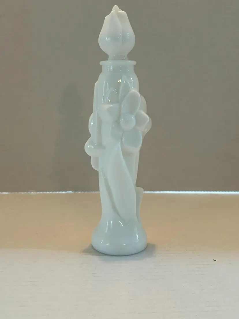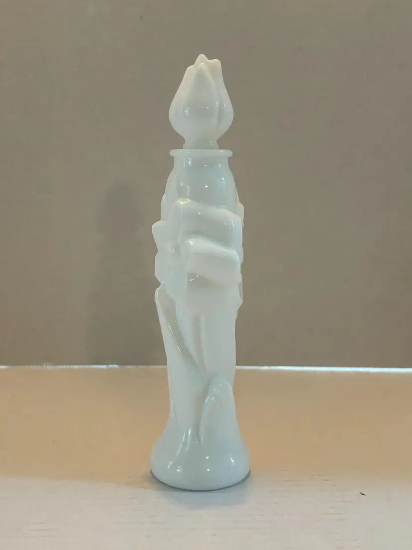 This vintage Avon milk glass bottle is a beautiful addition to any collection. The bottle is adorned with a lovely floral pattern, making it a great gift for any occasion. The original stopper is chip and crack free as well as the bottle. The bottle measures 9 1/2in tall X 3in wide