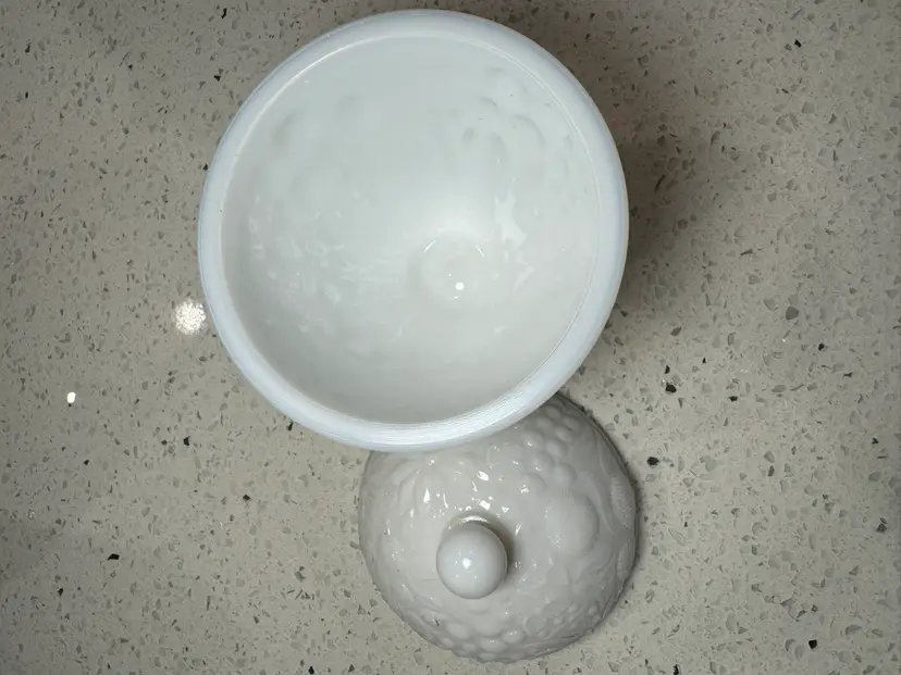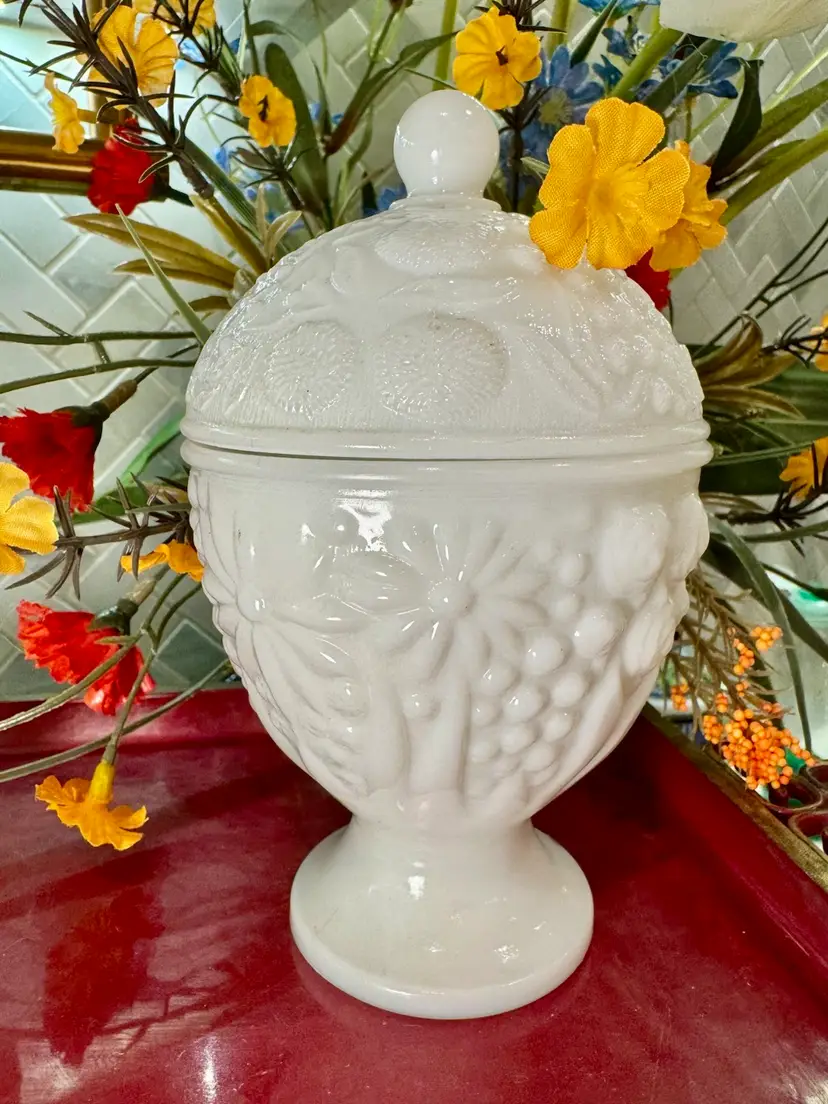 Vintage Avon milk glass lidded candy dish, embossed floral or fruit pattern. 6” tall & 4” wide