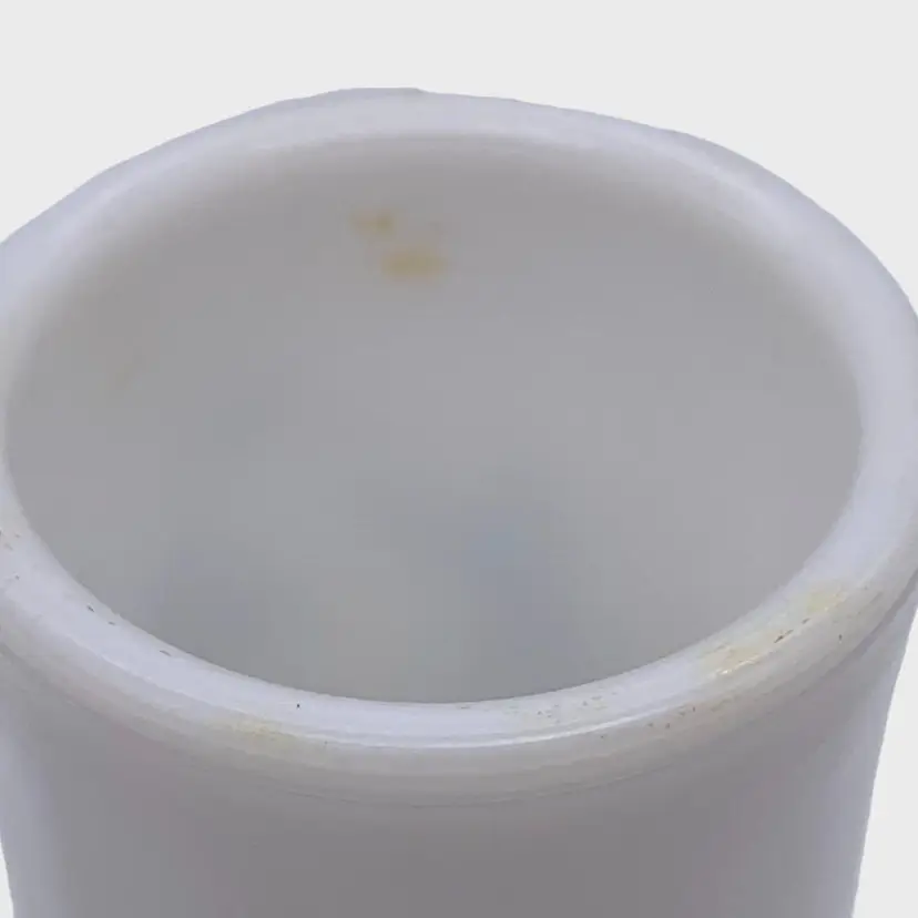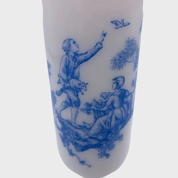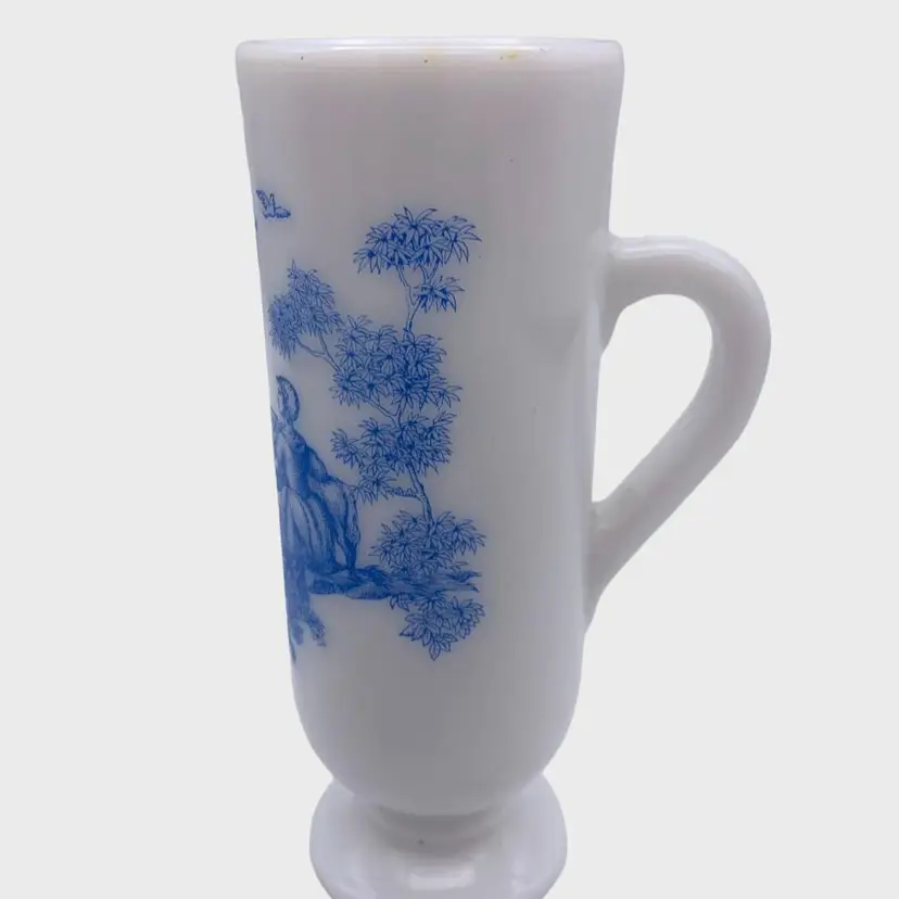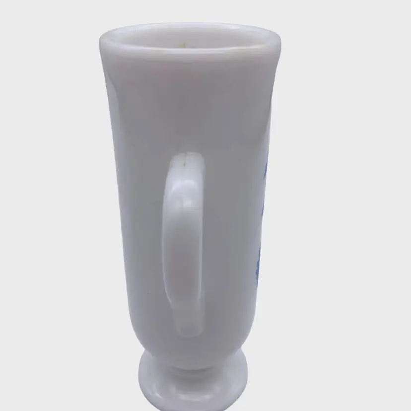 Avon milk glass liqueur glass with handle featuring an image of a Victorian courting couple. The item is approximately 5 1/4" tall.