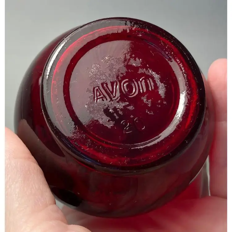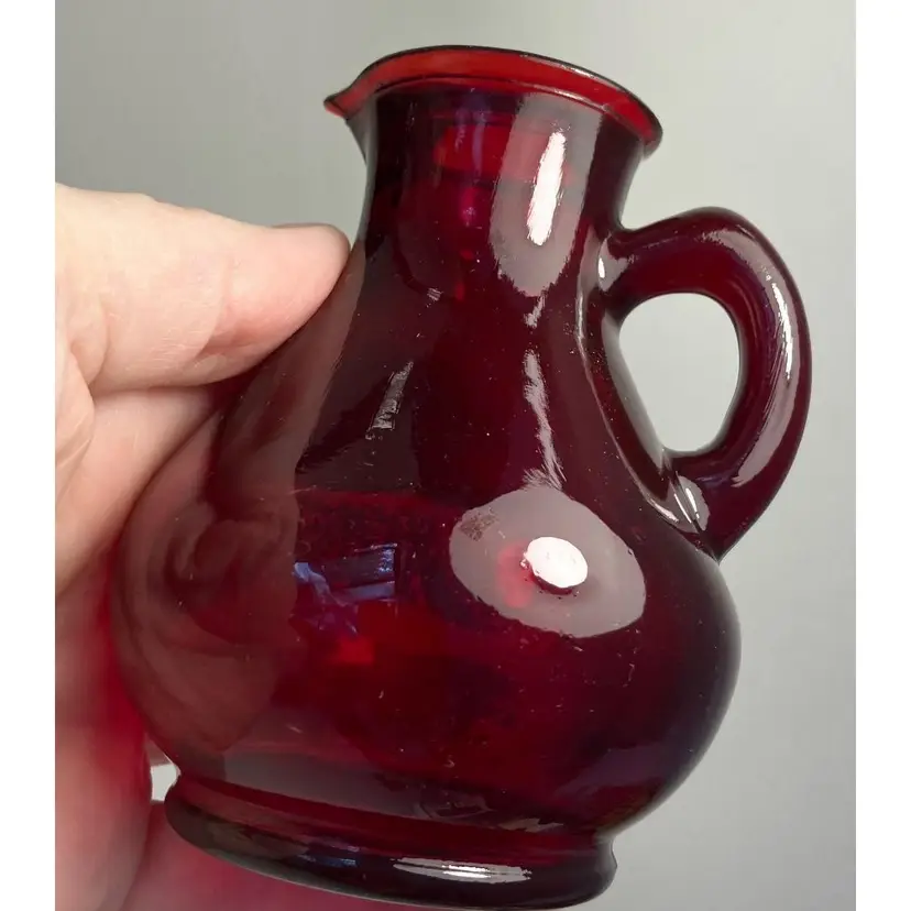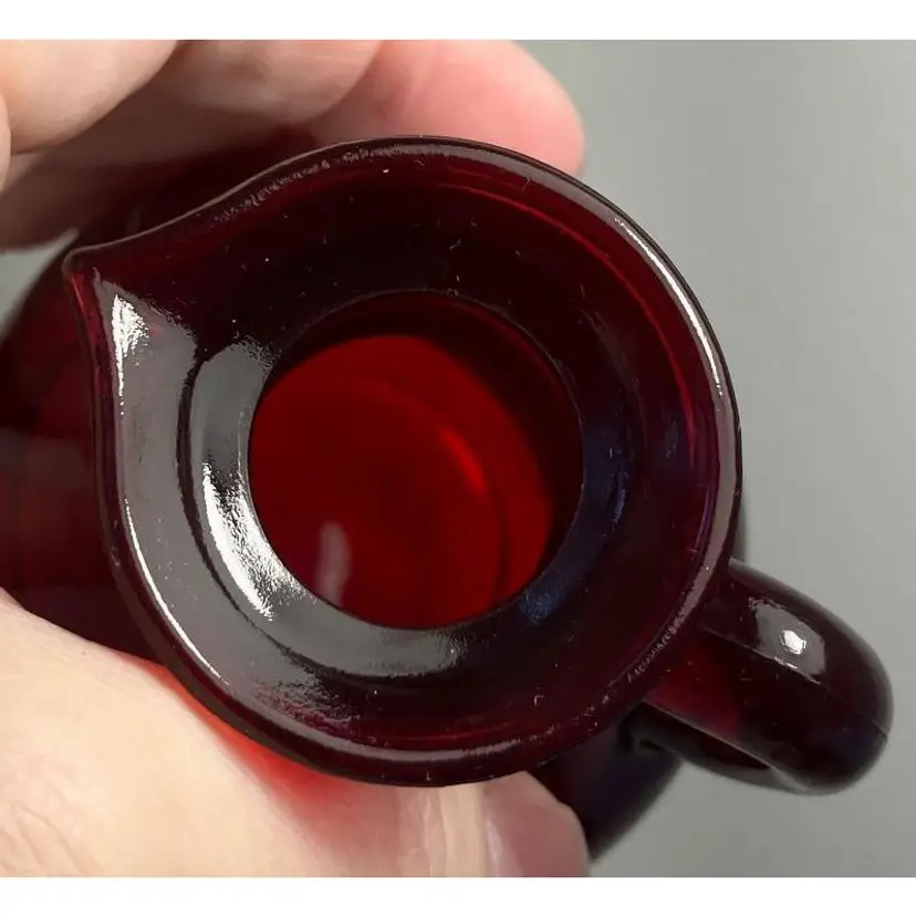 Missing the Strawberry stopper that originally came with it. But it is a beautiful red color and can be used as a creamer, pitcher, or vase. Or use it just for display. 3 1/2inches tall and 2 3/4 at its greatest width.