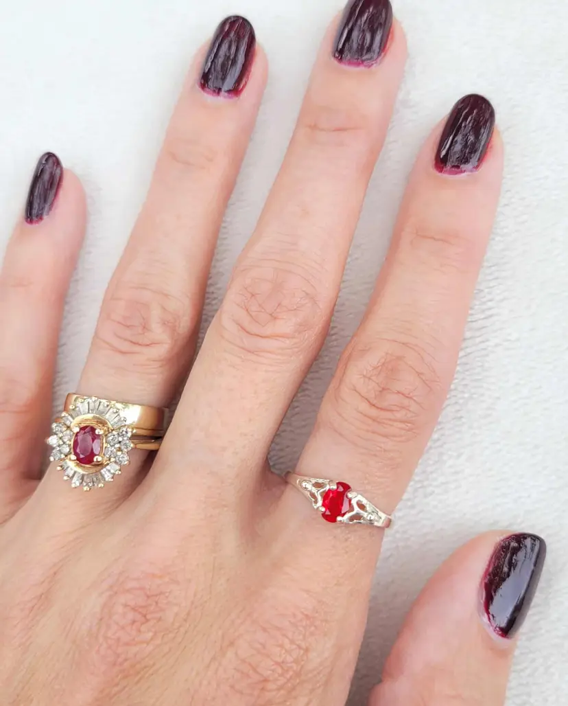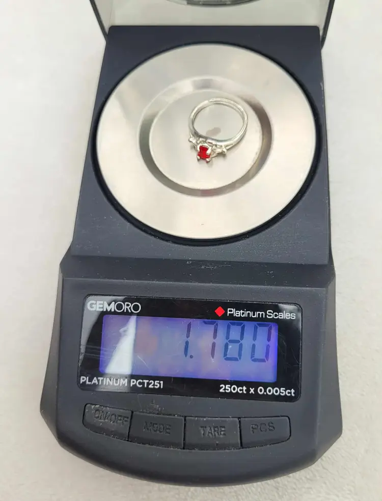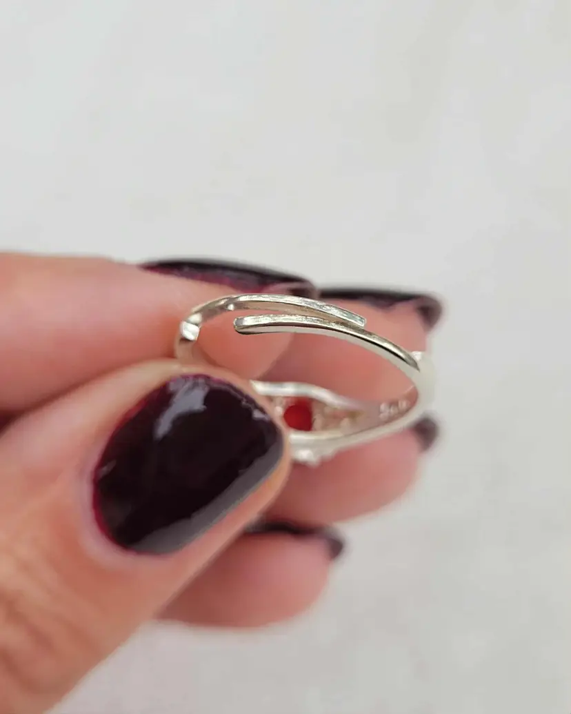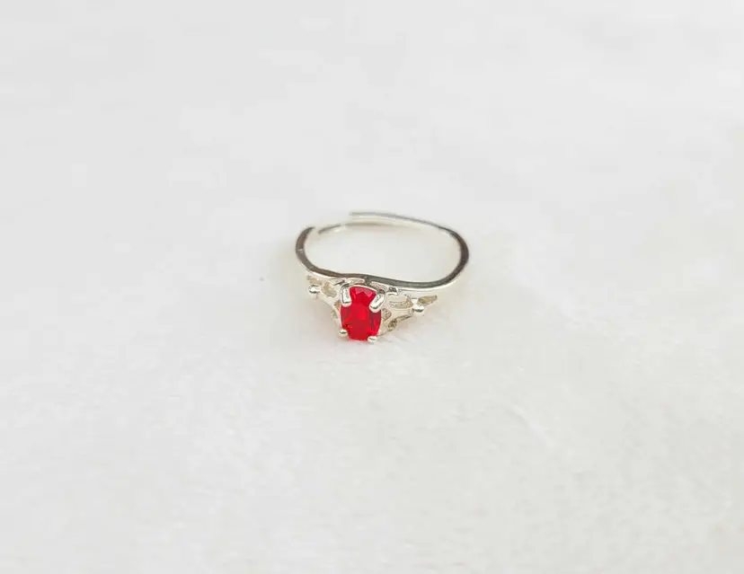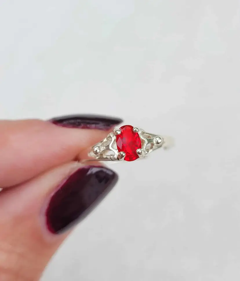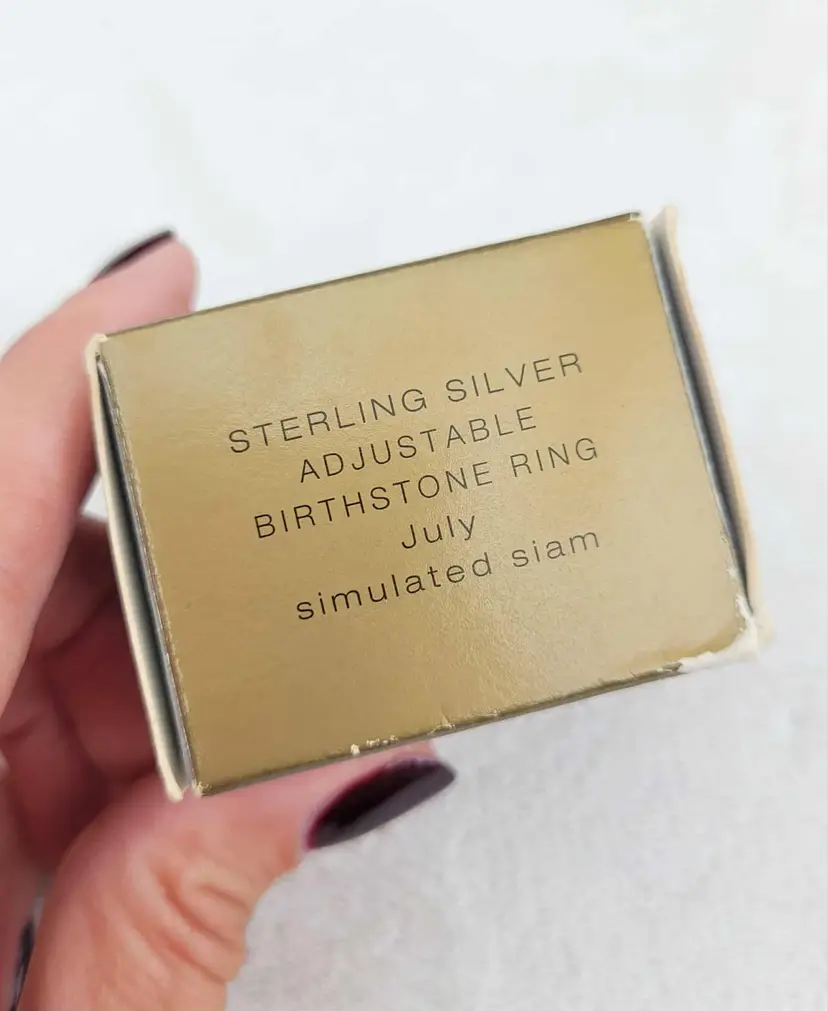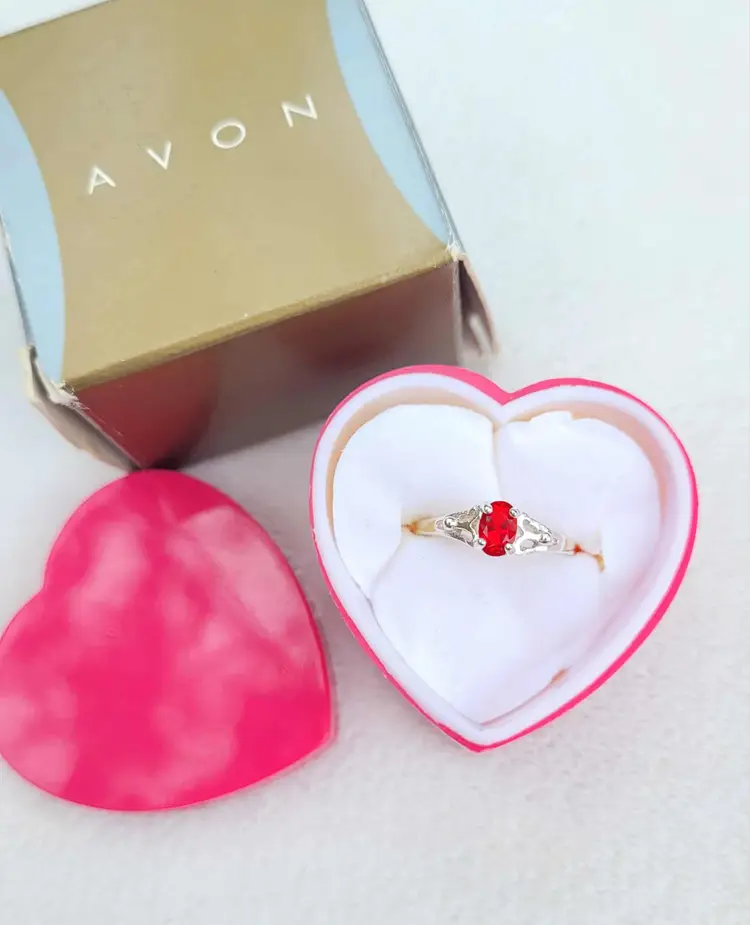 Beautiful sterling Avon birthstone ring, in the original case and box! It is marked sterling and is designed to adjust between about a size 4 and 7. The stone is glass and meant to resemble one of July's birthstones, siam ruby. Please see pictures for details.