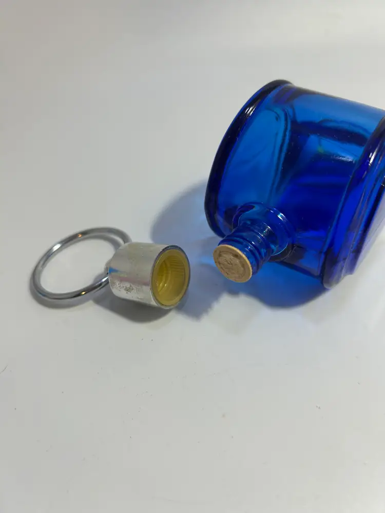 No chips or cracks in glass. Plastic topper in good condition, no cracks, is tarnished. Bottle is empty. Box has common wear from age and use, worn edges, discoloration and residue. Please enlarge all photos to see all defects.