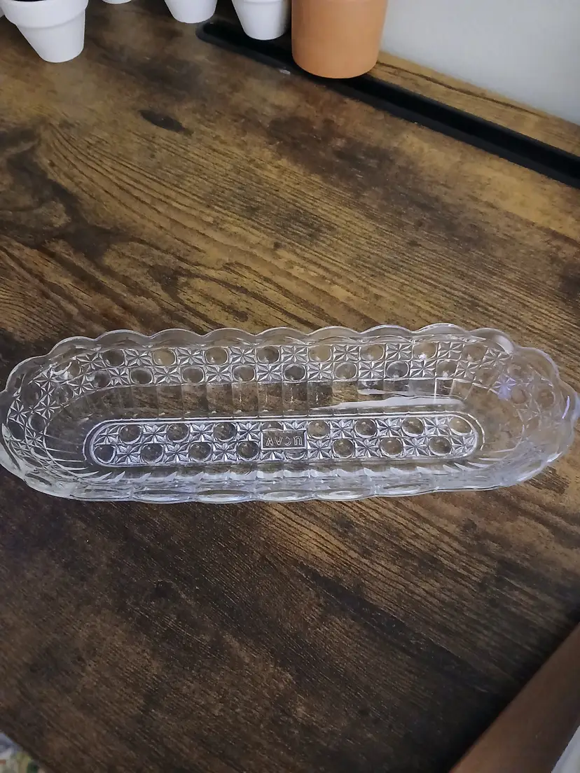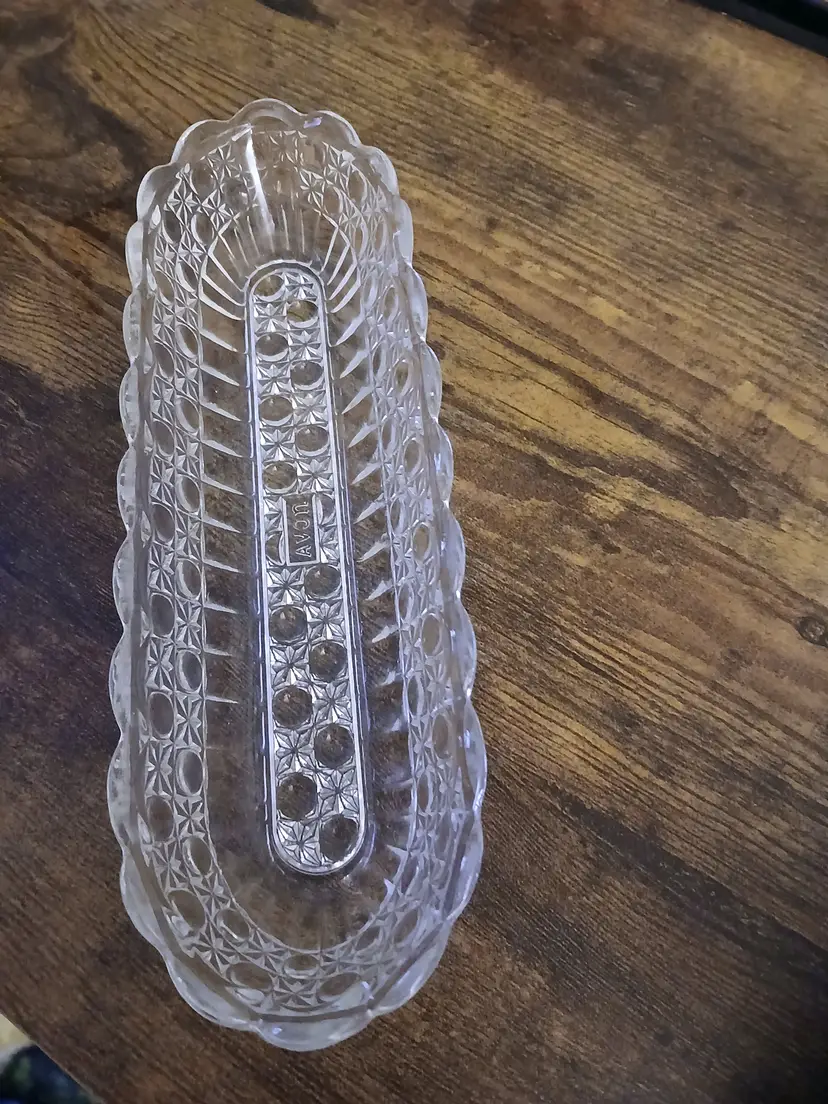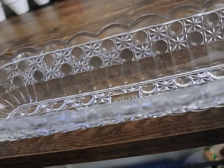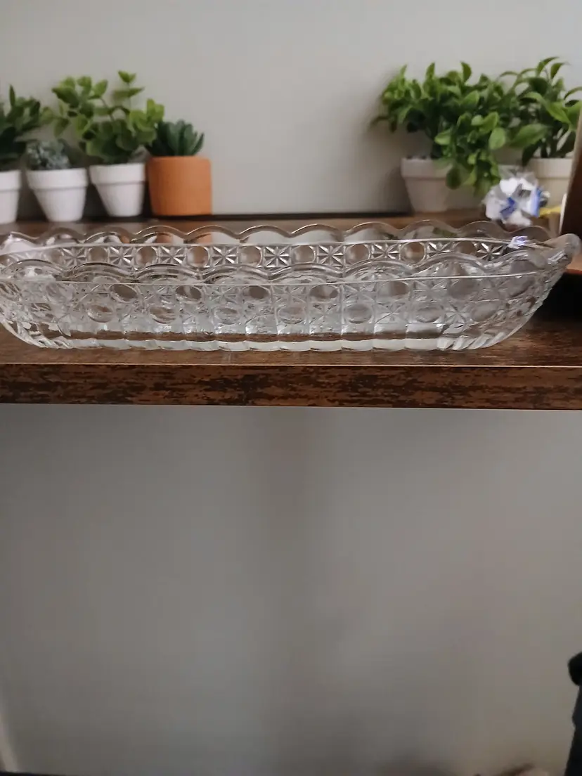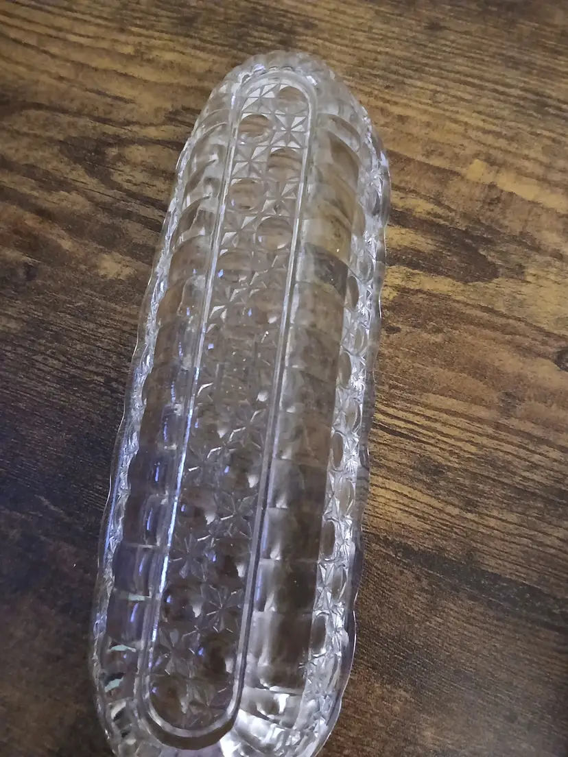 Add a touch of vintage charm to your table with this elegant glass celery dish. Perfect for serving or as a decorative piece, it features a classic pattern that complements any setting. Approximately 8 1/2 inches long × 2 3/4 "