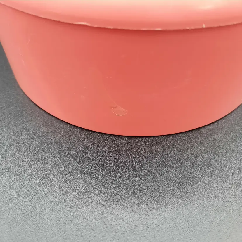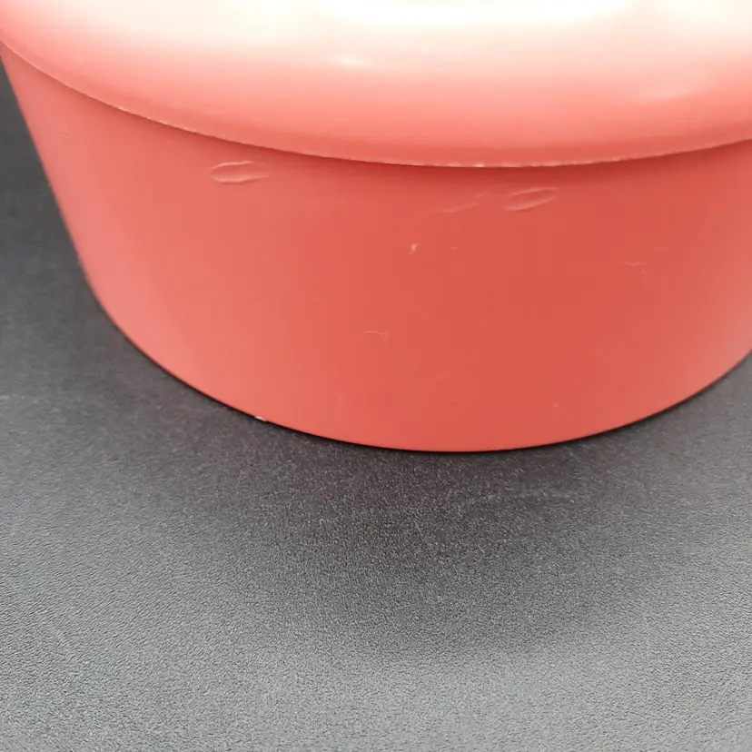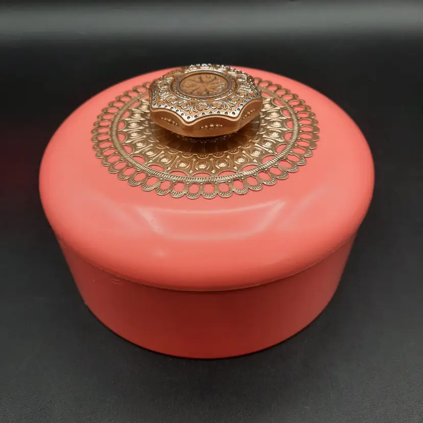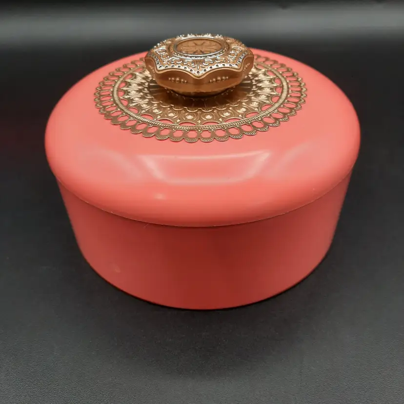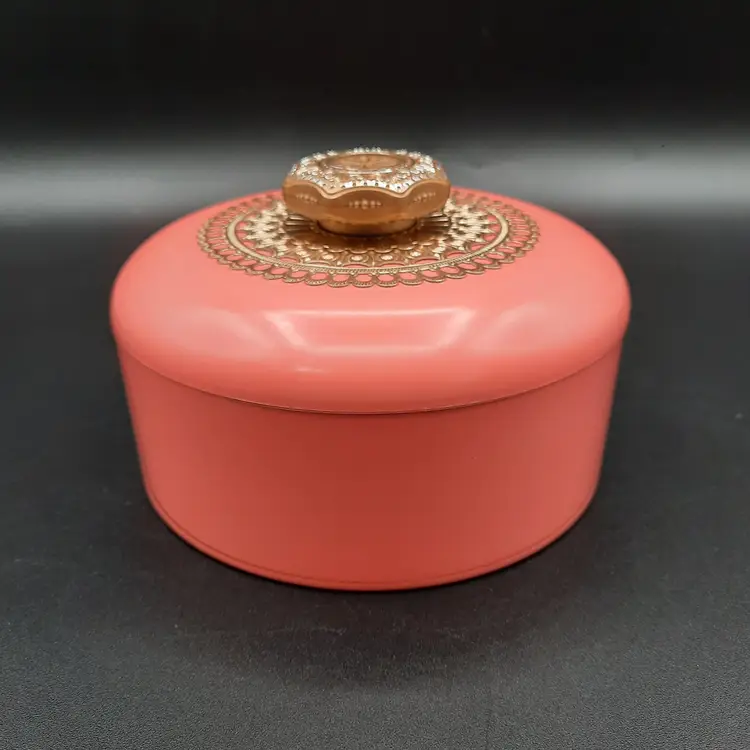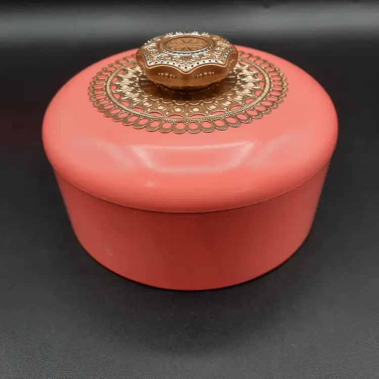 Measures 3 1/2"H to top of handle x 5"W, does have some wear to gold finish on handle as well as wear/scuffs to dish and lid, 2 small areas on dish look like it got too close to something hot.