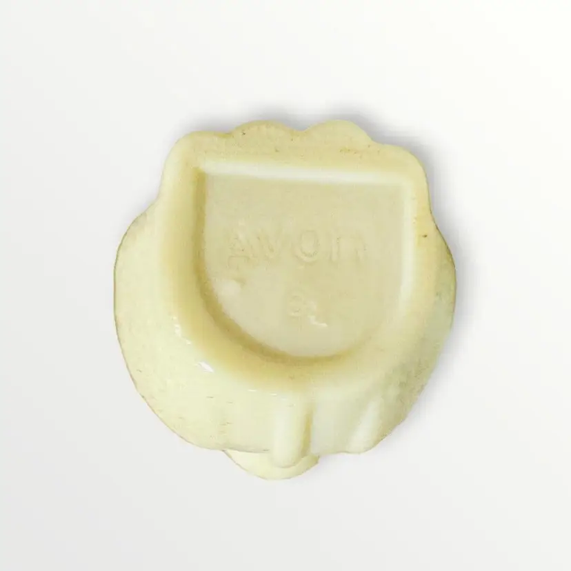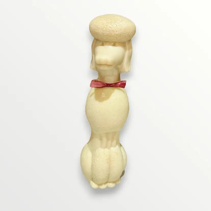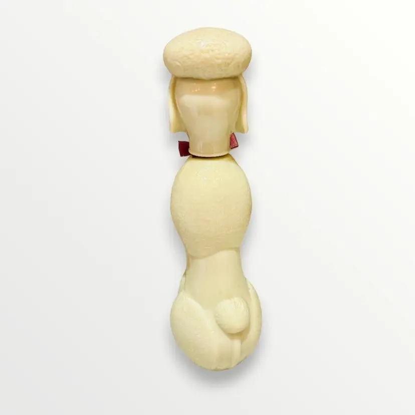 Vintage Avon white poodle empty glass bottle for decor. The poodle has a little pink bow. The glass is a cream colored while the ribbon is a very light pink. No chips or cracks noted. Approximately 8" tall.