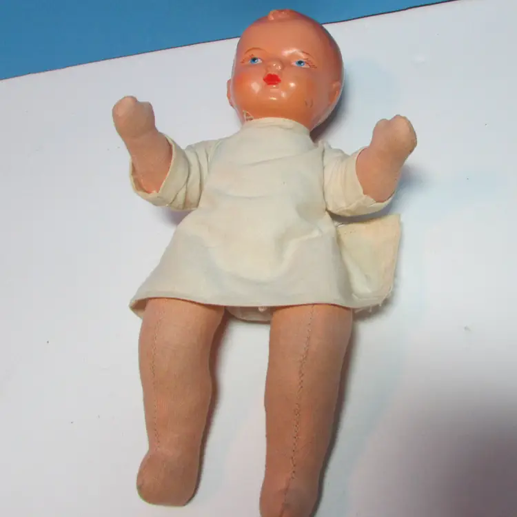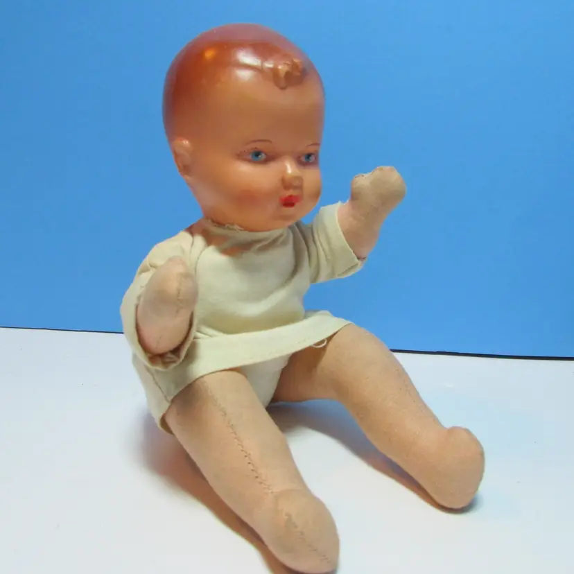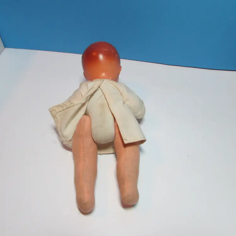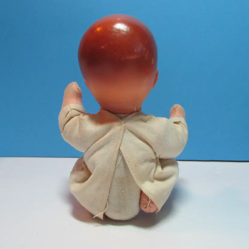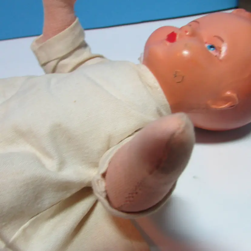 This adorable baby has some wear, he has a spot on his face and stain on his back. Still adorable doll to display, you can move the legs to have him sit or laydown. He is about 8" when laying flat. This is shipped from a smoke free home. Thanks for looking!
