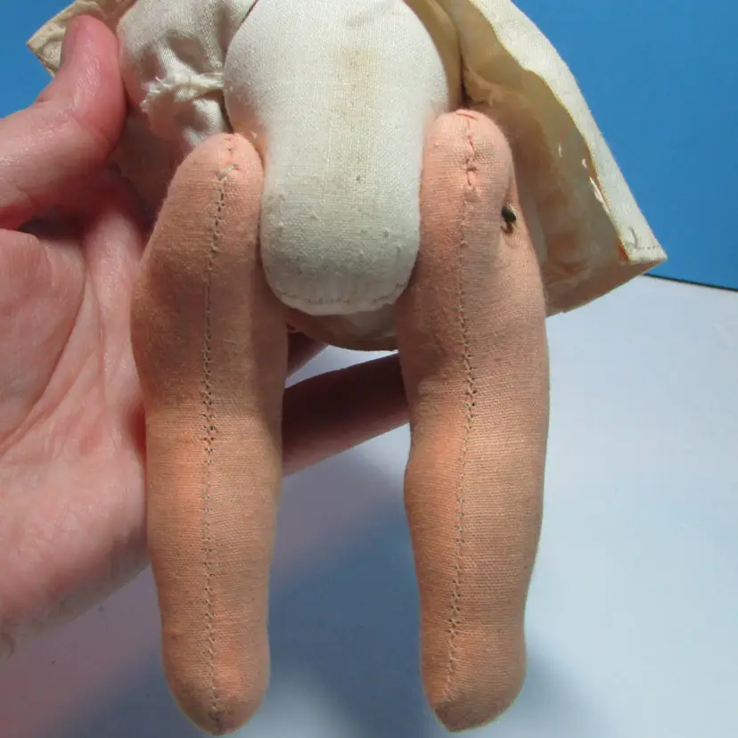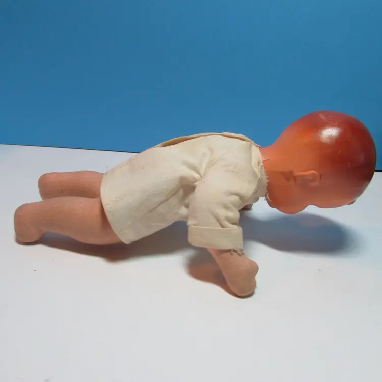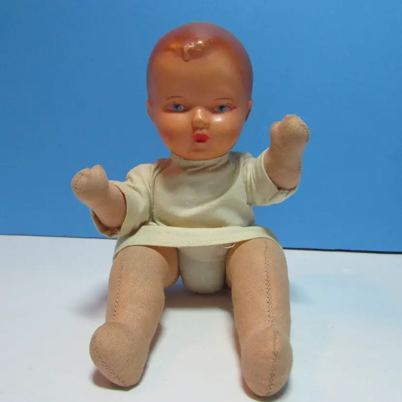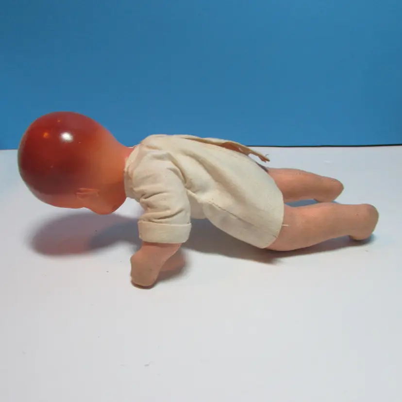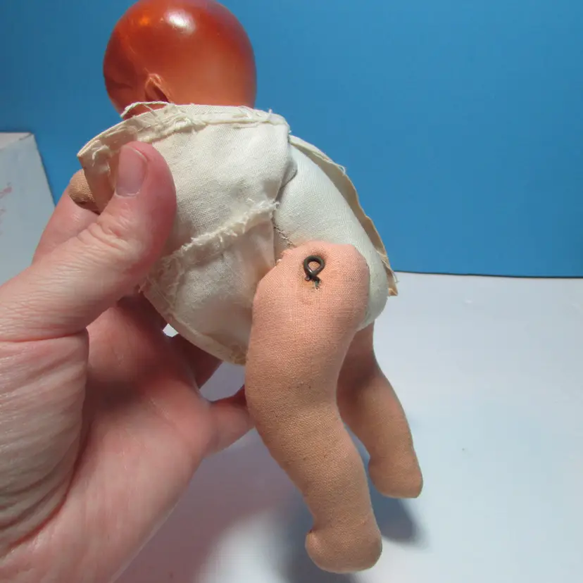 This adorable baby has some wear, he has a spot on his face and stain on his back. Still adorable doll to display, you can move the legs to have him sit or laydown. He is about 8" when laying flat. This is shipped from a smoke free home. Thanks for looking!