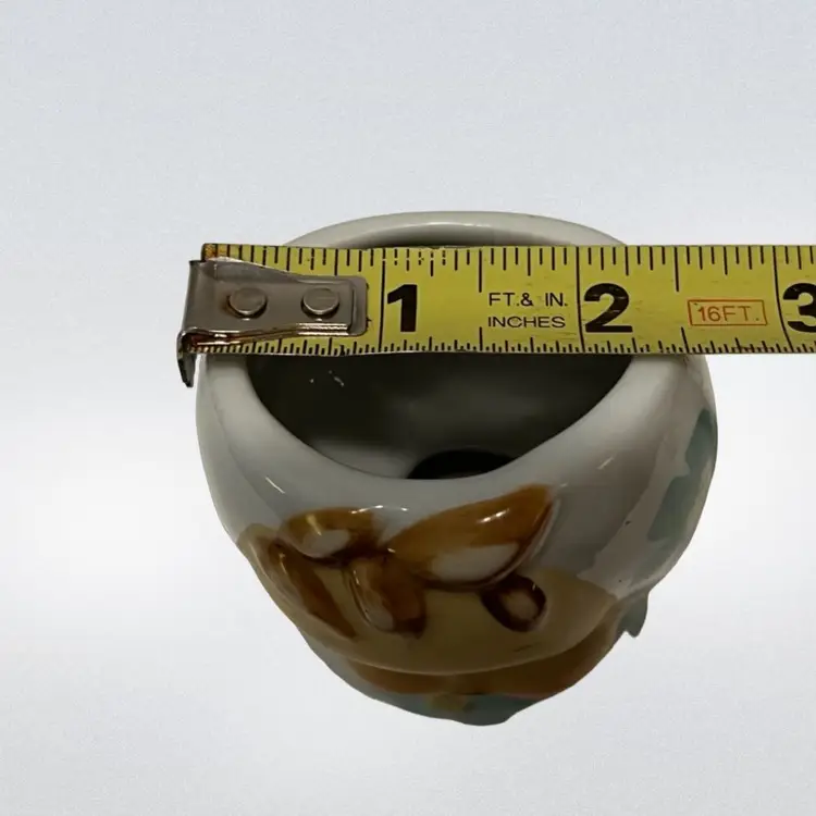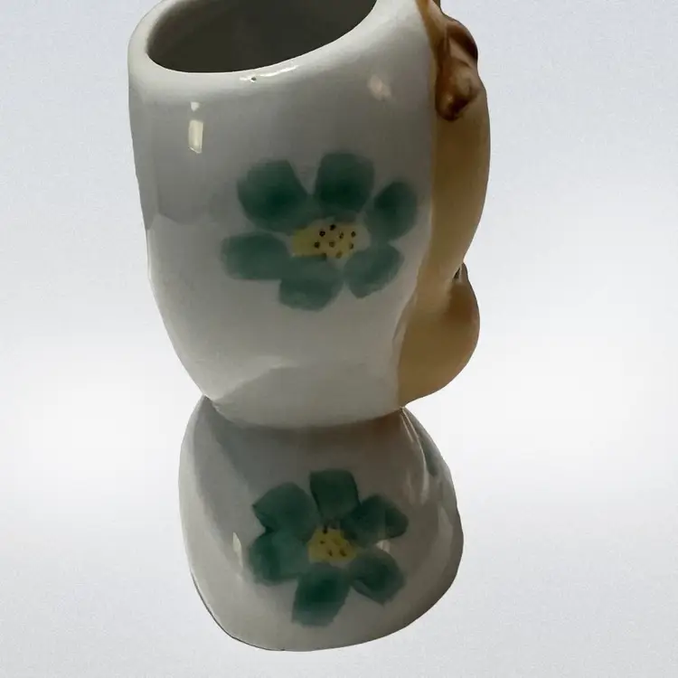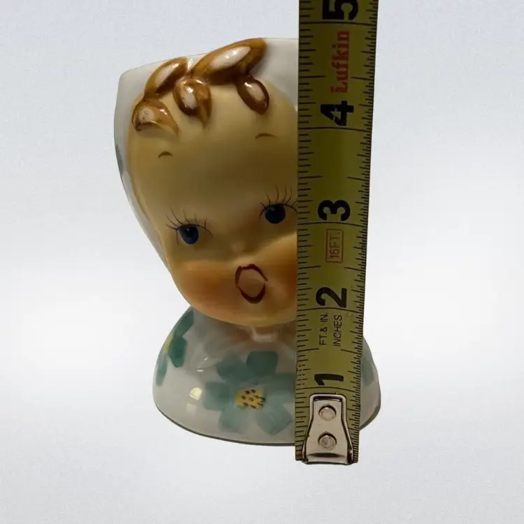 This is an adorable vintage baby head vase with blue and yellow flowers. There is little to no wear on the paint. It would be excellent for a succulent in a baby’s room or whatever you desire. There are no chips or cracks. See photos for exact measurements.
