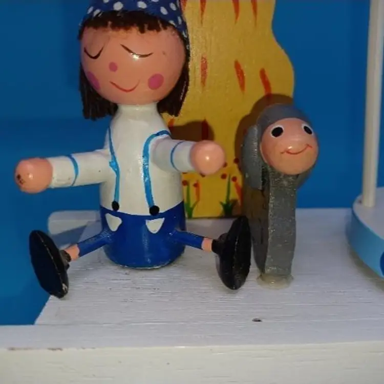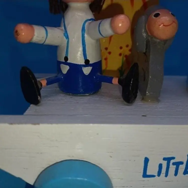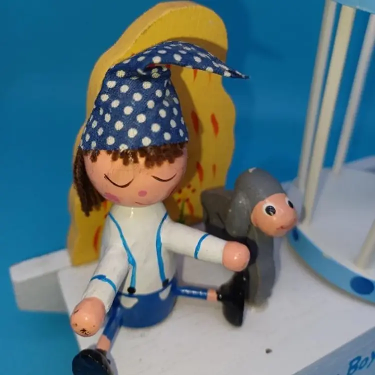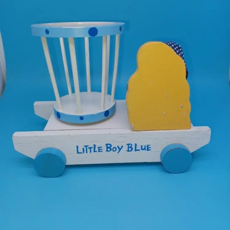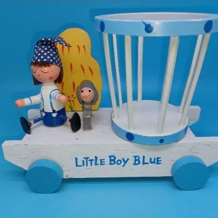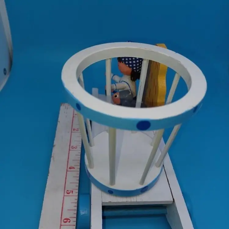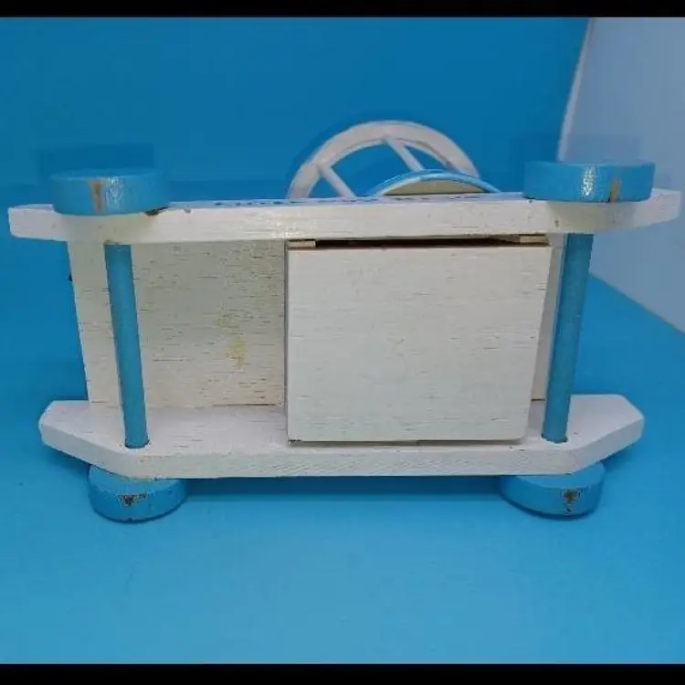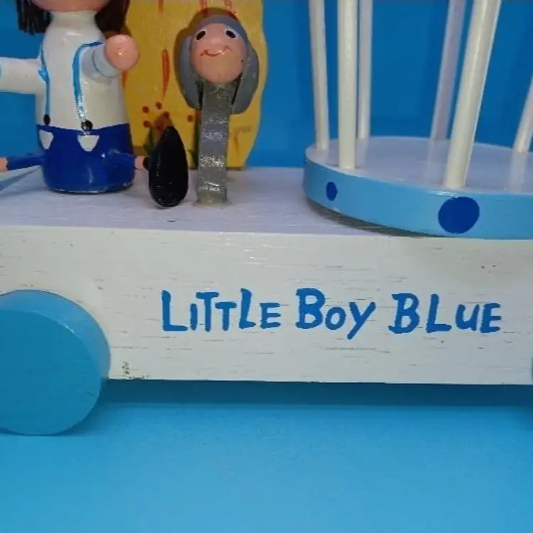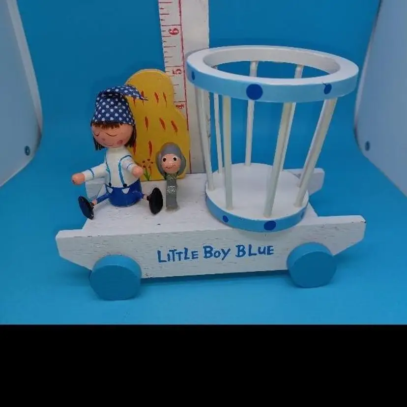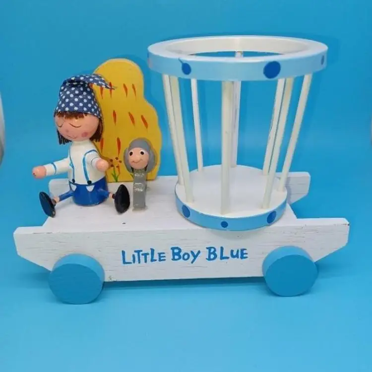 Vintage blue wood Musical music box has a little boy with a hat and a sheep and a rotating basket that when you wind plays go to sleep little one or otherwise known as the Cradle song. I did partially restore this box as it was coming apart and did get the music box working I think it has a nice Tempo and is tuned pretty well I did leave the extra glue on the sheep that was there from its original manufacturer but all in all I've tried to restore this vintage box to Great usable condition please see all pictures and listen to the video and watch the video to discern condition before purchase all items from a smoke-free home with pets experienced fragile shipper