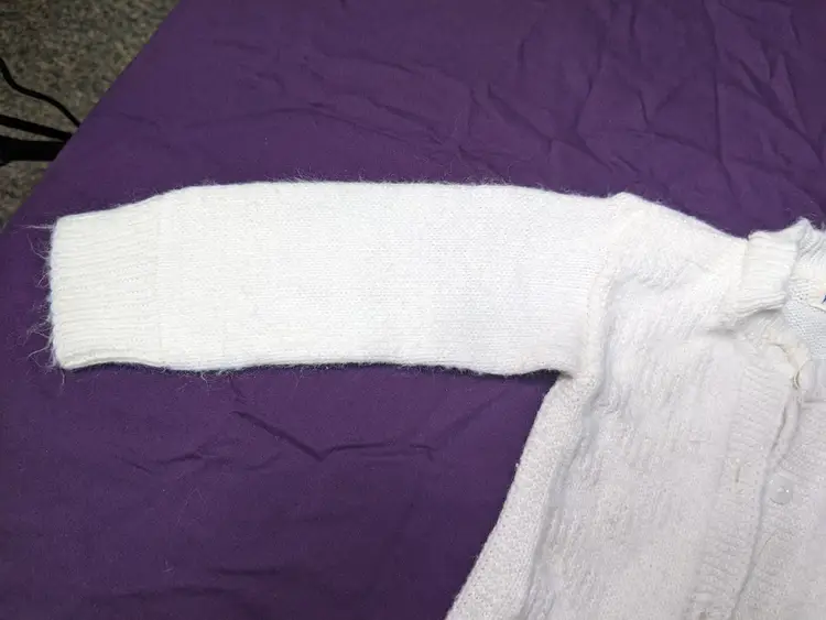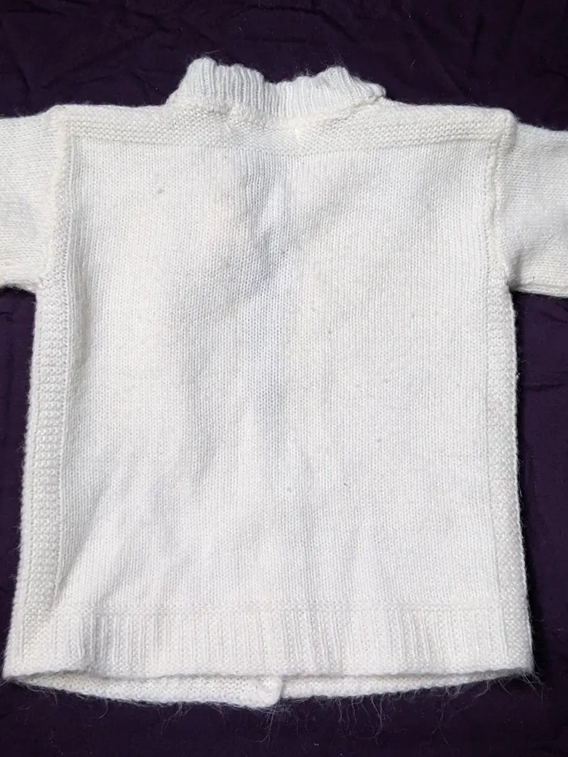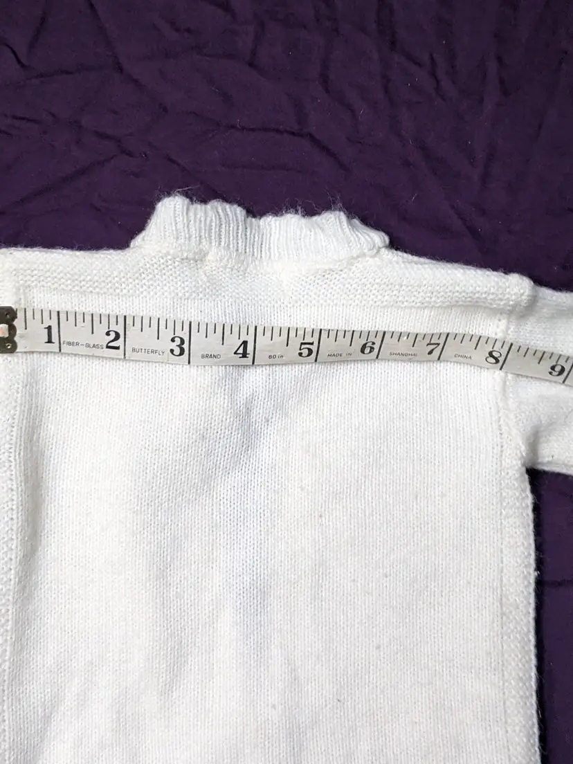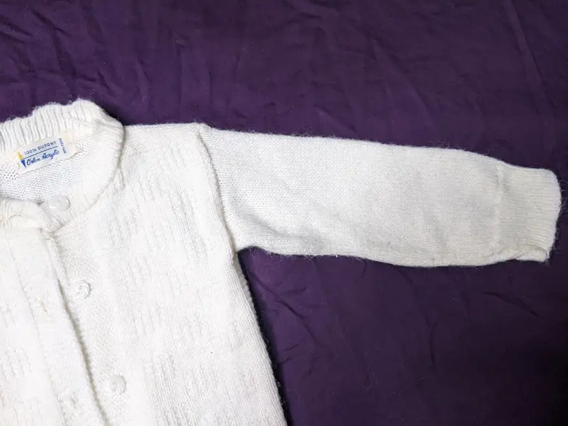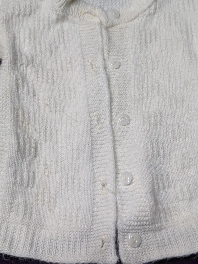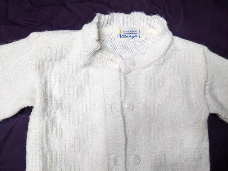 Vintage Baby Sweater White Dupont Orlon Acrylic Button Up Cardigan Off white ivory color Can Be used as Doll Cloths for a vintage baby doll. The sweater measures 9 in across and 11in long. I think it is from the 1950s. Good condition no holes or stains. the buttons are secure There are a couple of sweater nubs minor. Please check the photos for details. Comes from a Smoke free home. We do have pets.