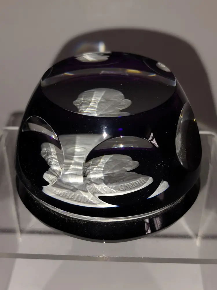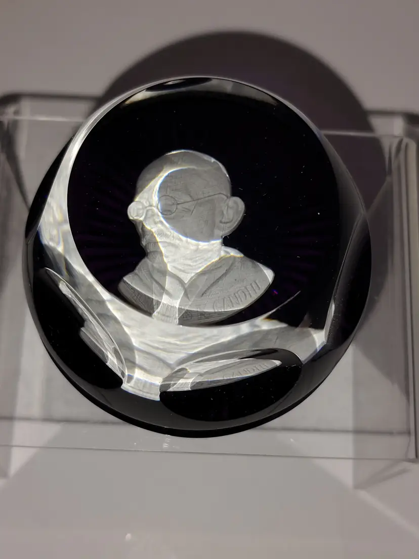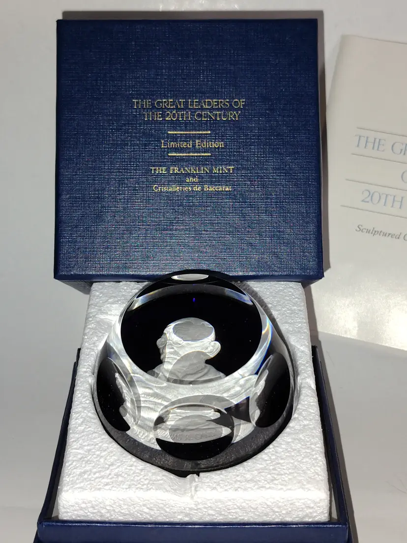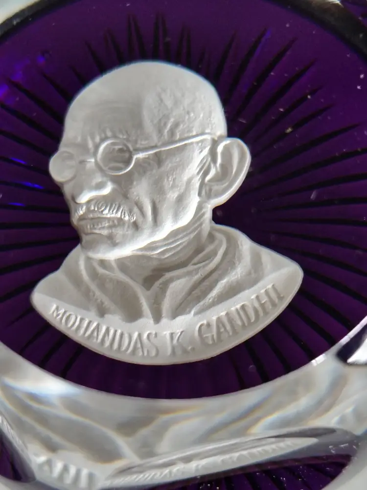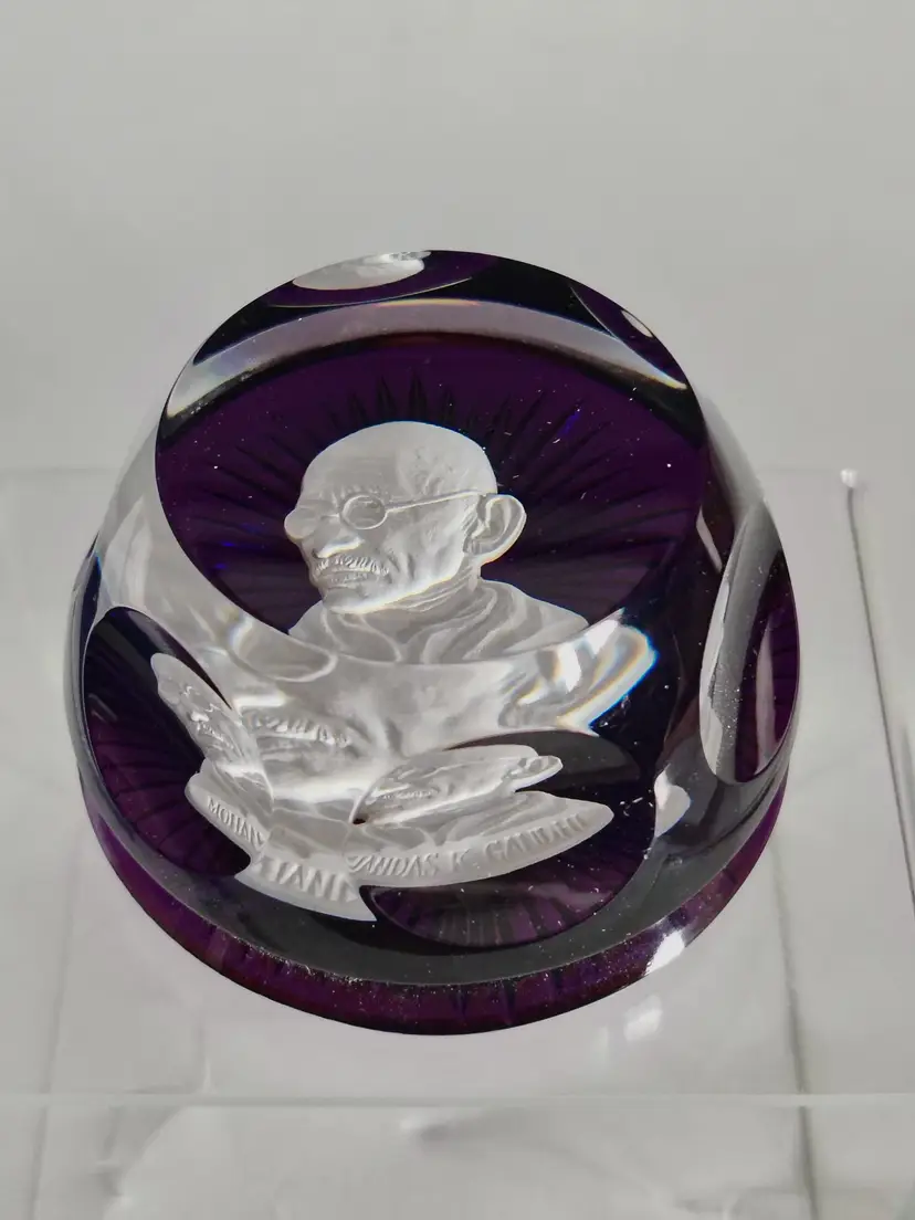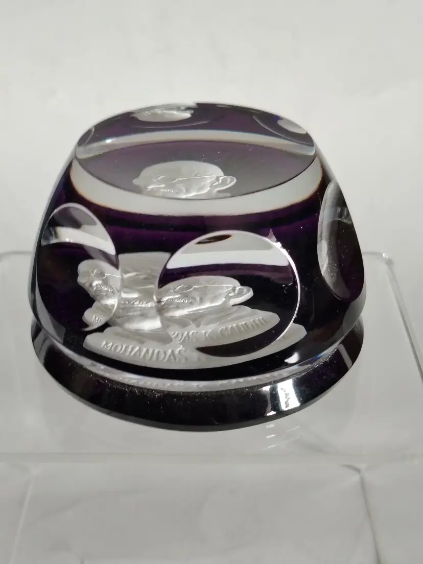 This Baccarat series, 'The Great Leaders of History', is well known, and produced late 20th C, with the sulfides entrapped in the fine clear, faceted and polished crystal with a purple colored bottom. I have the first 12 of the series and each are sold separately. These are all in PERFECT CONDITION and were in the original inner box and shipping boxes since purchased, but removed now to take pics. This is 10 and is Mohamdas K Gandhi, and was made in 1980. Measures Approx: 2.90" Wide x 1.80" Tall.