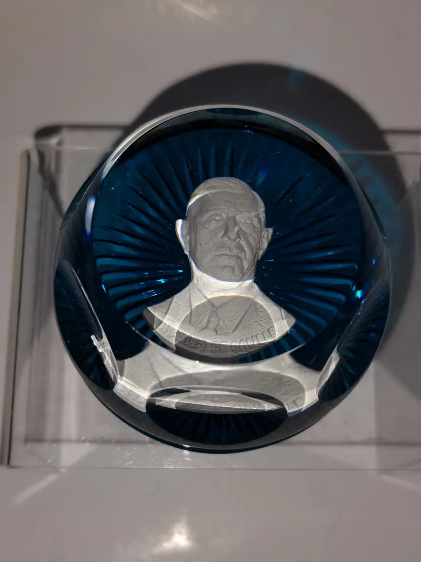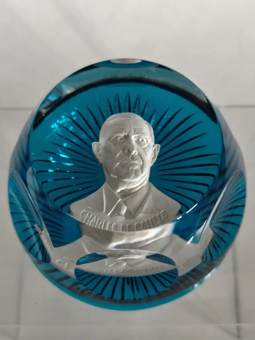 This Baccarat series, 'The Great Leaders of History', is well known, and produced late 20th C, with the sulfides entrapped in the fine clear, faceted and polished crystal with a teal colored bottom. I have the first 12 of the series and each are sold separately. These are all in PERFECT CONDITION and were in the original inner box and shipping boxes since purchased, but removed now to take pics. This is #12 and is Charles de Gaulle. Measures Approx: 2.90" Wide x 1.80" Tall.