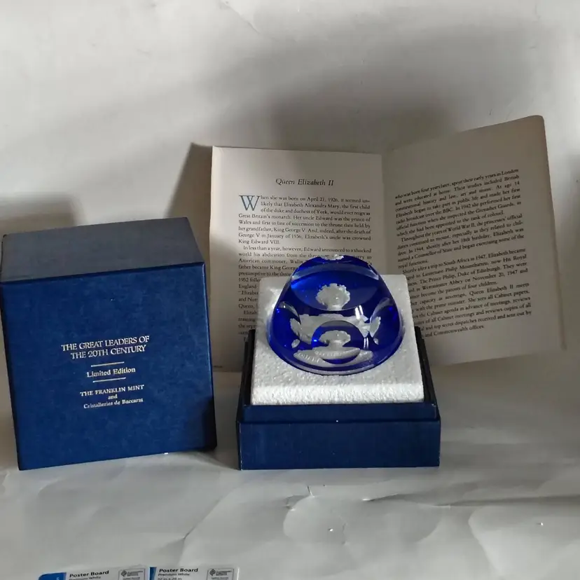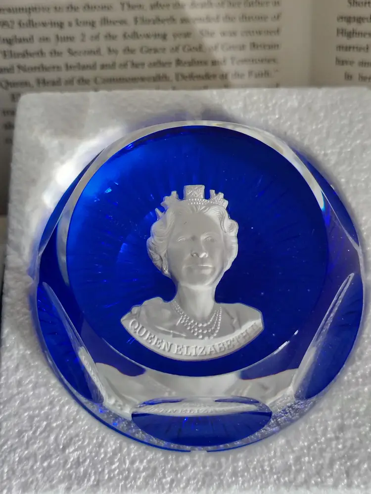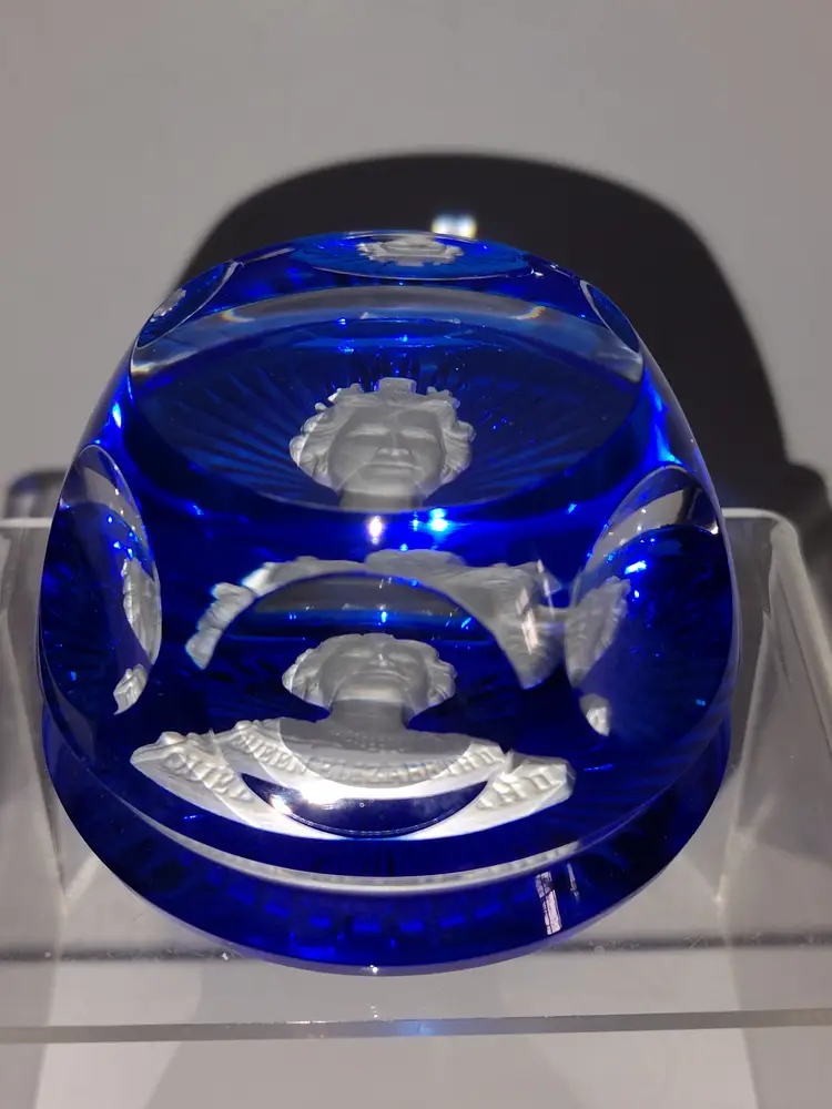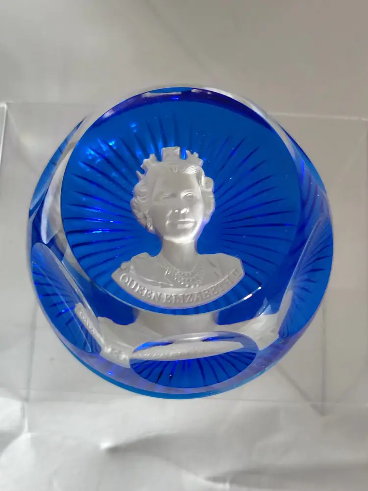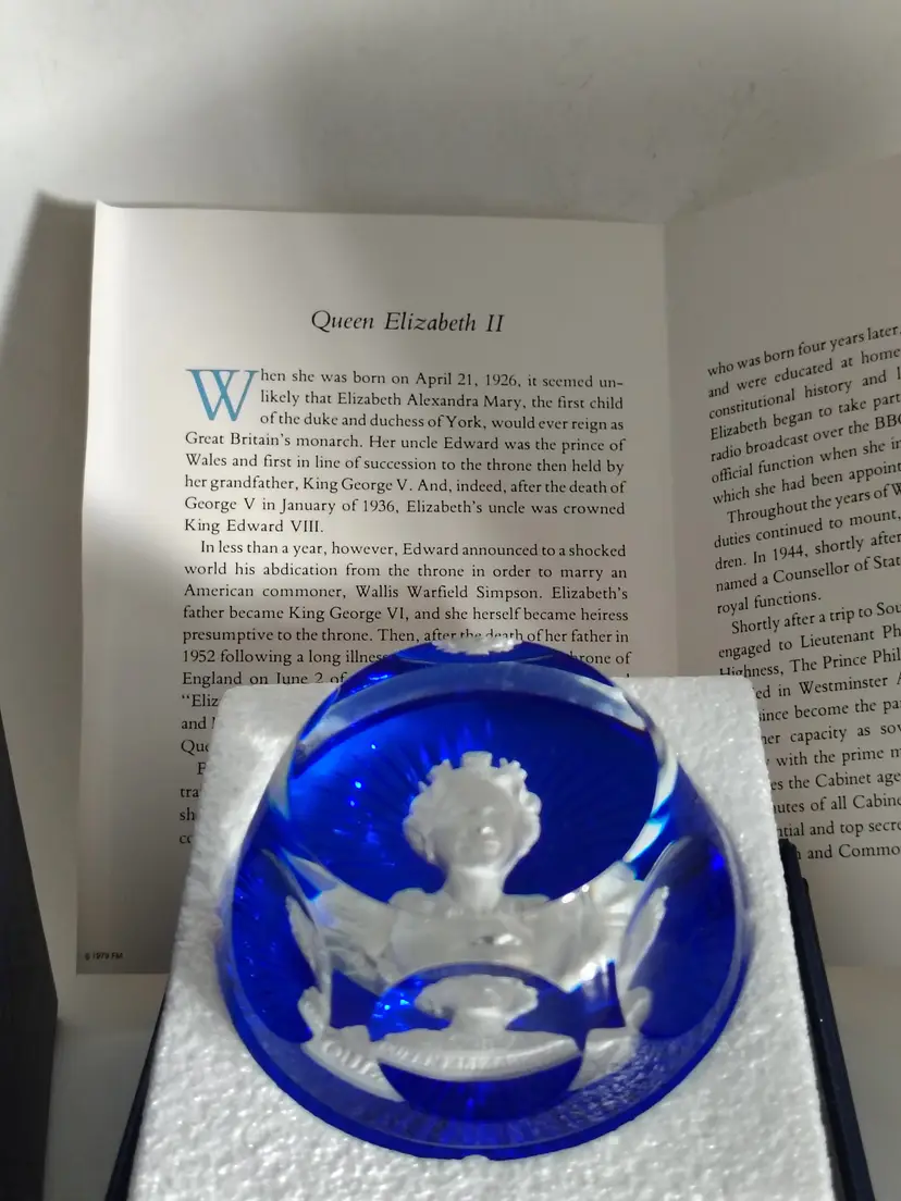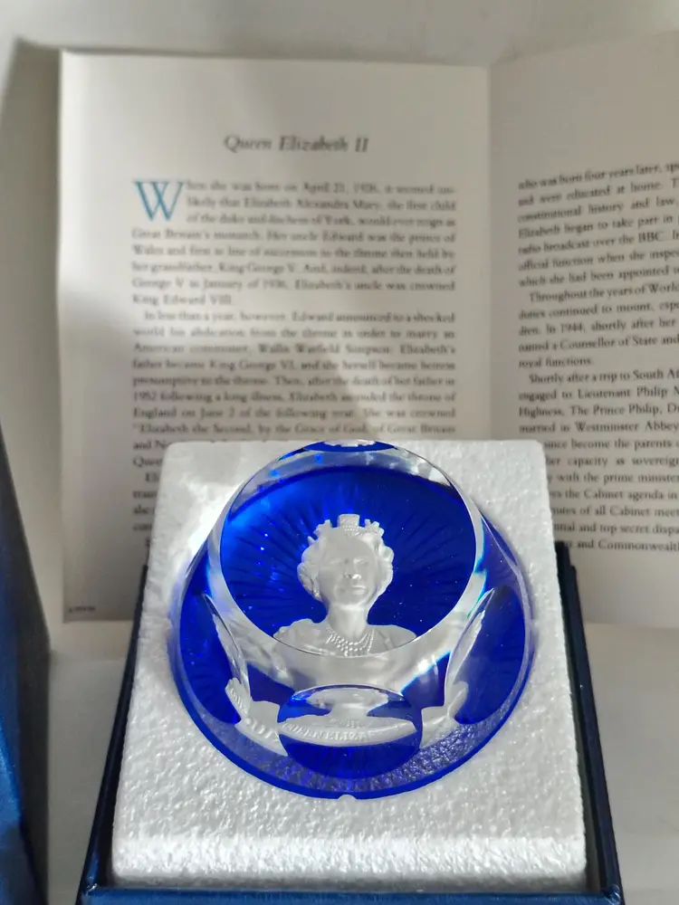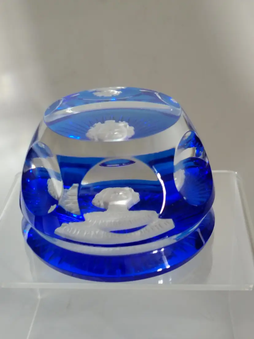 This Baccarat series, 'The Great Leaders of History', is well known, and produced late 20th C, with the sulfides entrapped in the fine clear, faceted and polished crystal with a teal colored bottom. I have the first 12 of the series and each are sold separately. These are all in PERFECT CONDITION and were in the original inner box and shipping boxes since purchased, but removed now to take pics. This is #3 and is QUEEN ELIZABETH II, circa 1976 and is a RARE BLUE VERSION!. Measures Approx: 2.90" Wide x 1.80" Tall.