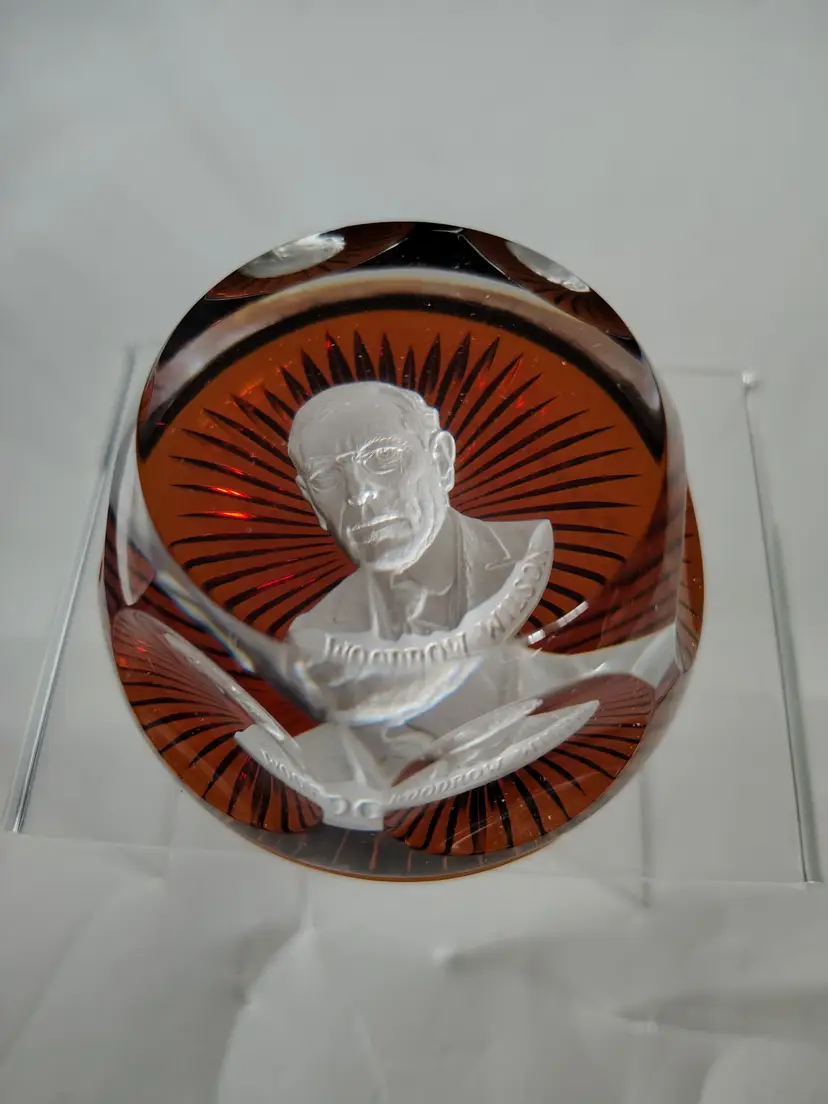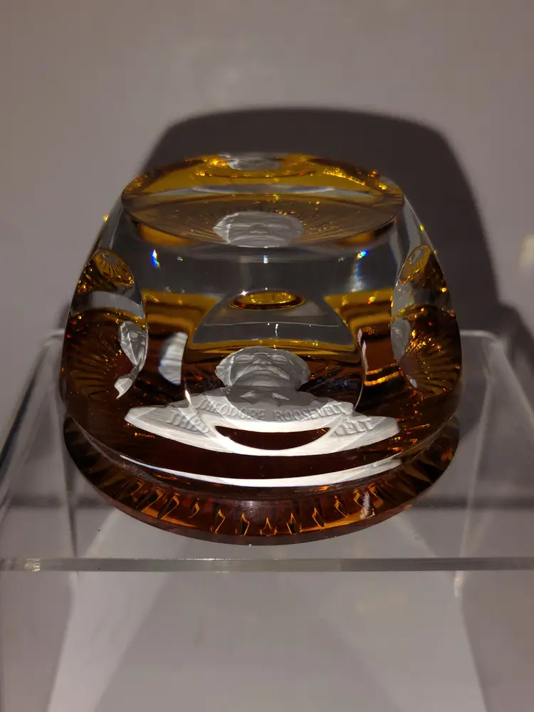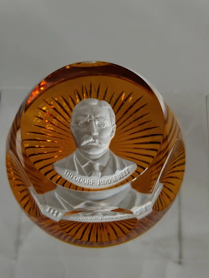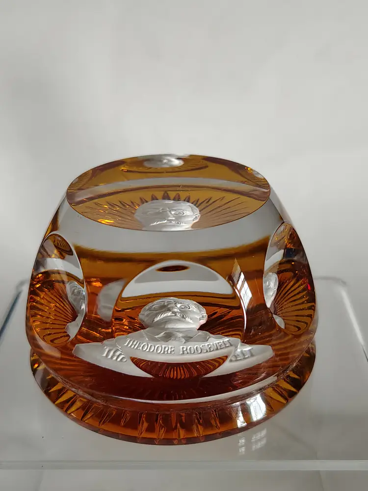 This Baccarat series, 'The Great Leaders of History', is well known, and produced late 20th C, with the sulfides entrapped in the fine clear, faceted and polished crystal with a honey amber colored bottom that is UV reactive/glows! I have the first 12 of the series and each are sold separately. These are all in PERFECT CONDITION and were in the original inner box and shipping boxes since purchased, but removed now to take pics. This is number 11 and is Theodore Roosevelt and was made in 1980. Measures Approx: 2.90" Wide x 1.80" Tall.
