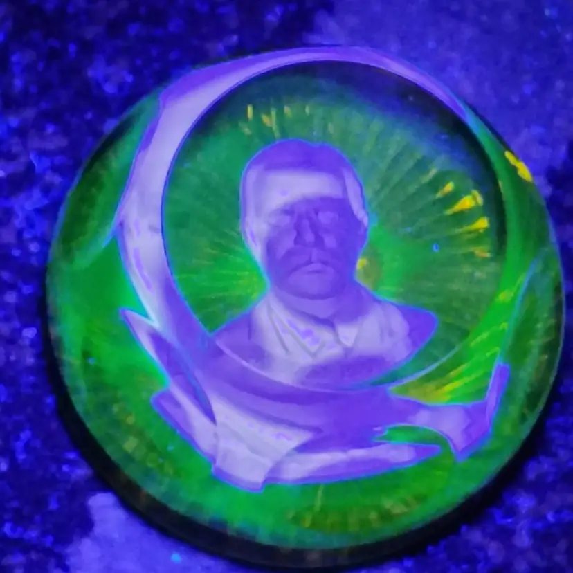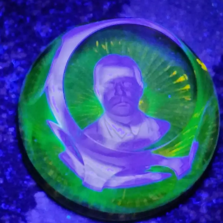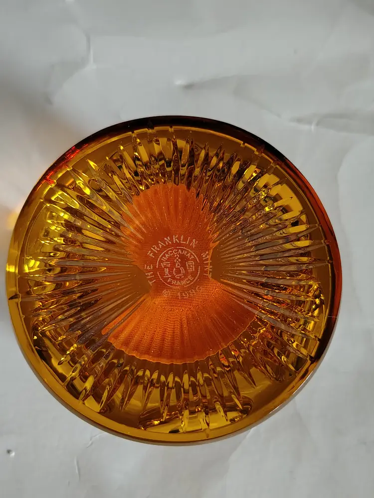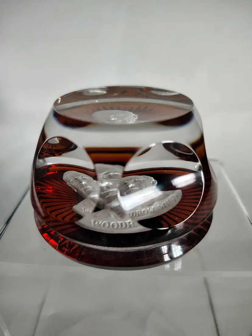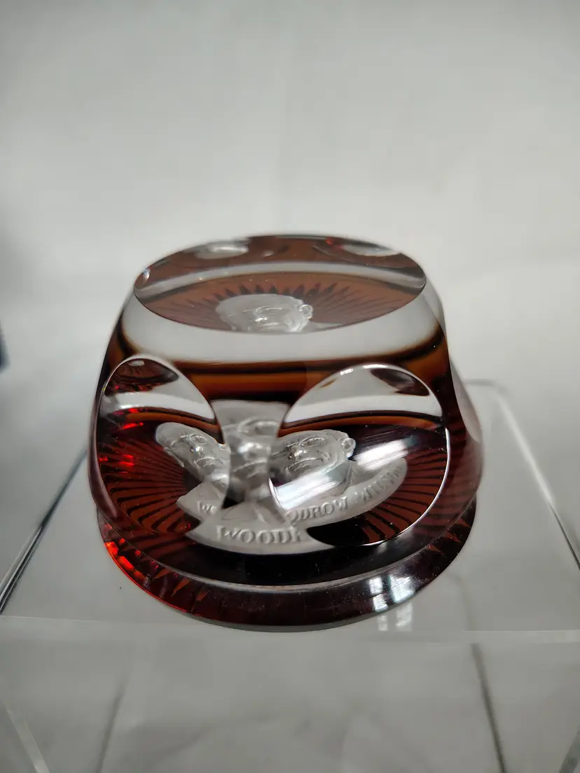 This Baccarat series, 'The Great Leaders of History', is well known, and produced late 20th C, with the sulfides entrapped in the fine clear, faceted and polished crystal with a honey amber colored bottom that is UV reactive/glows! I have the first 12 of the series and each are sold separately. These are all in PERFECT CONDITION and were in the original inner box and shipping boxes since purchased, but removed now to take pics. This is number 11 and is Theodore Roosevelt and was made in 1980. Measures Approx: 2.90" Wide x 1.80" Tall.