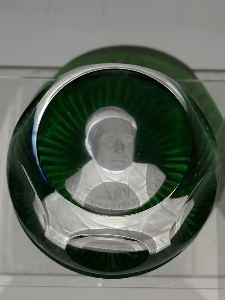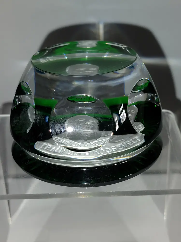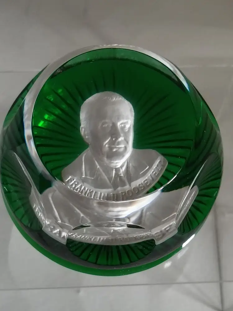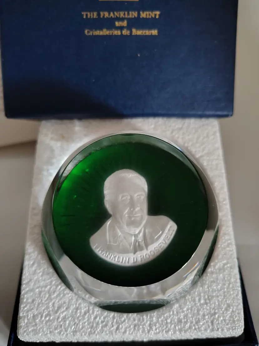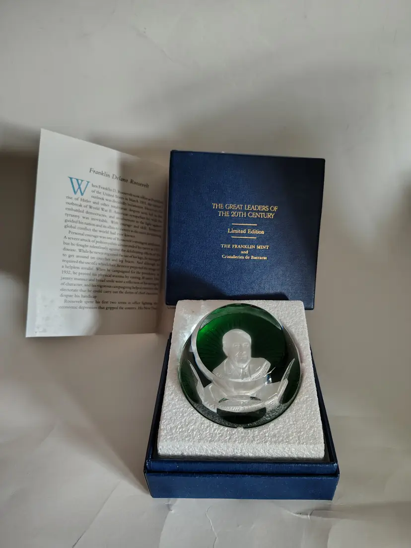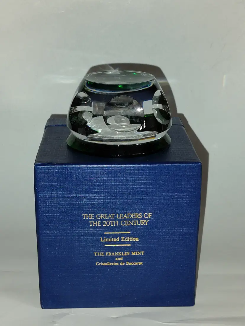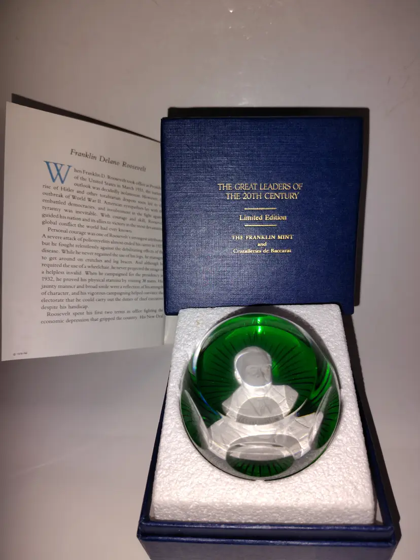 This Baccarat series, 'The Great Leaders of History', is well known, and produced late 20th C, with the sulfides entrapped in the fine clear, faceted and polished crystal with a green colored bottom. I have the first 12 of the series and each are sold separately. These are all in PERFECT CONDITION and were in the original inner box and shipping boxes since purchased, but removed now to take pics. This is #1 and is FDR, Franklin Delano Roosevelt and was made in 1979. Measures Approx: 2.90" Wide x 1.80" Tall.