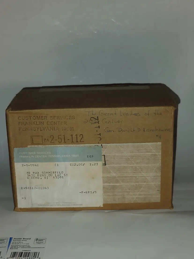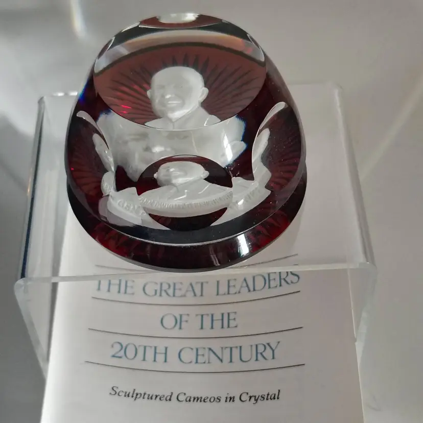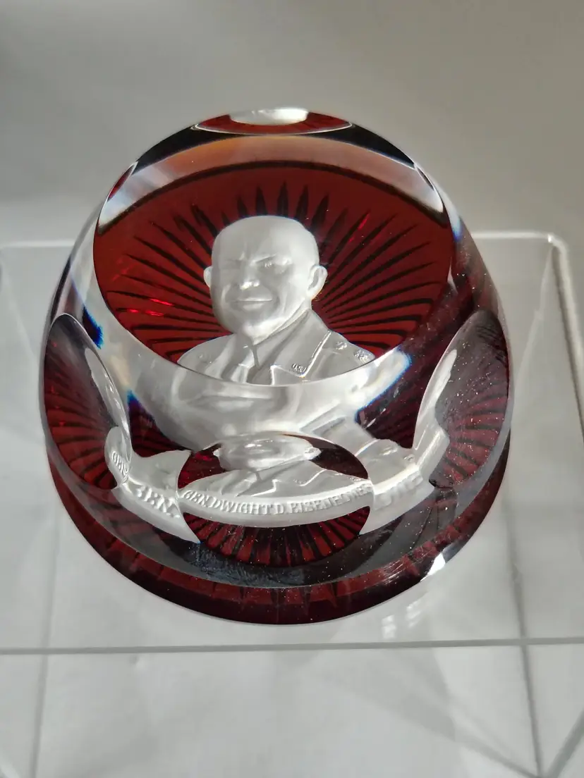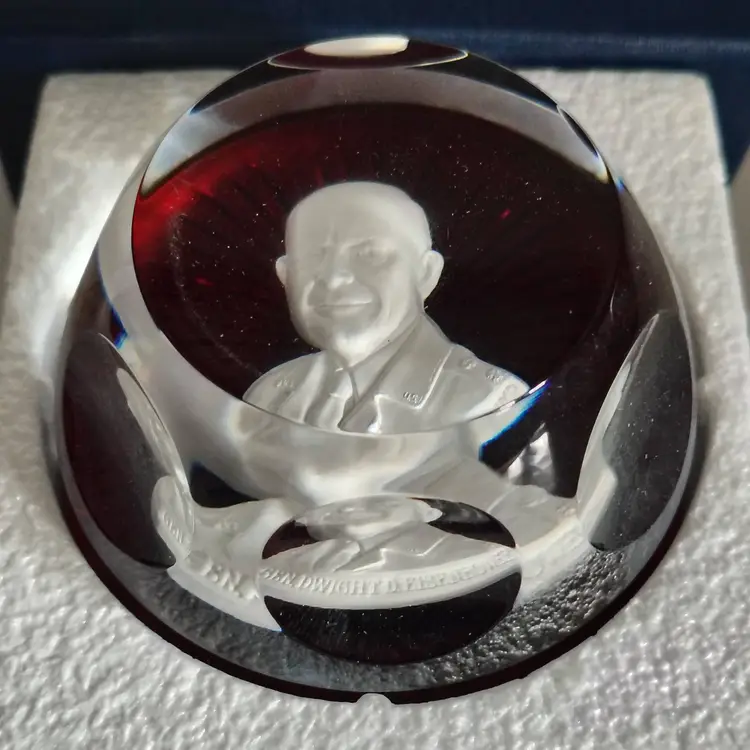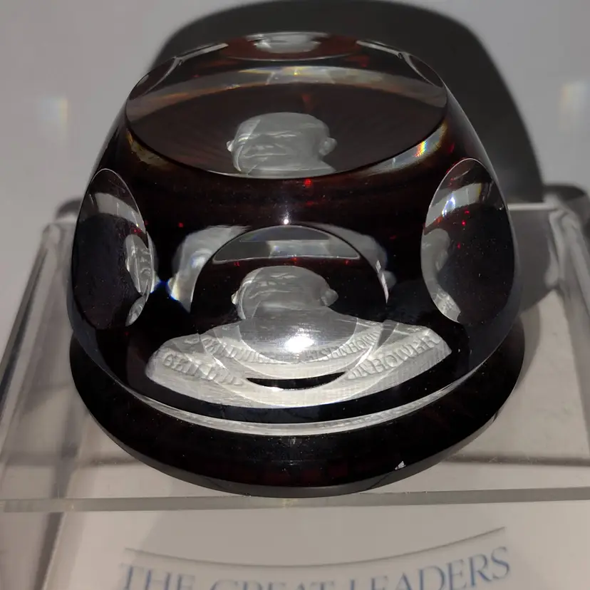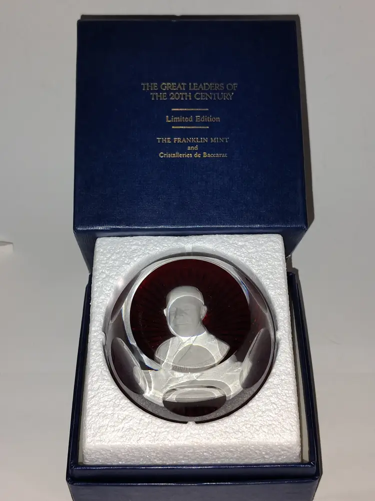 This Baccarat series, 'The Great Leaders of History', is well known, and produced late 20th C, with the sulfides entrapped in the fine clear, faceted and polished crystal with a teal colored bottom. I have the first 12 of the series and each are sold separately. These are all in PERFECT CONDITION and were in the original inner box and shipping boxes since purchased, but removed now to take pics. This is #4 and is General Dwight D. Eisenhower, circa 1979. Measures Approx: 2.90" Wide x 1.80" Tall.