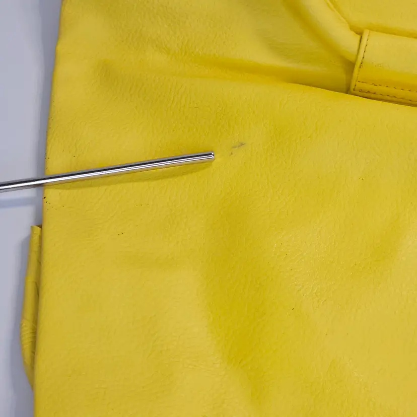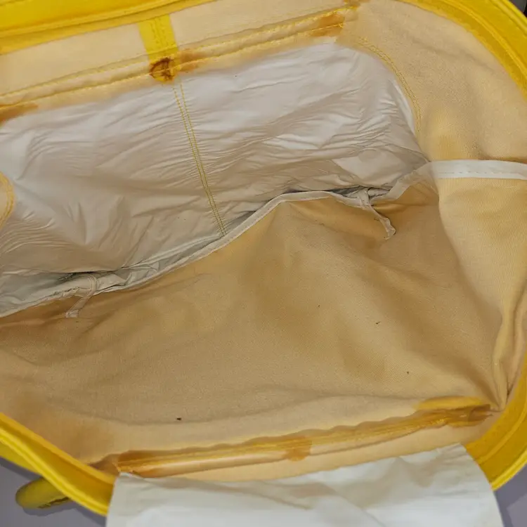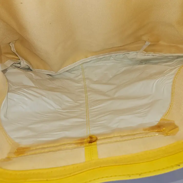 This is a Bag Bazaar yellow vinyl handbag featuring an embossed abstract pattern on the front. The bag has rounded handles and a spacious interior lined with a light-colored fabric. The interior includes a sewn-in label "Bag Bazaar Made in Taiwan R.O.C." and shows minor signs of age with discoloration and staining. The handbag closes with a zipper at the top.