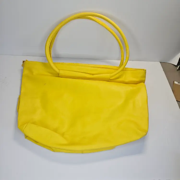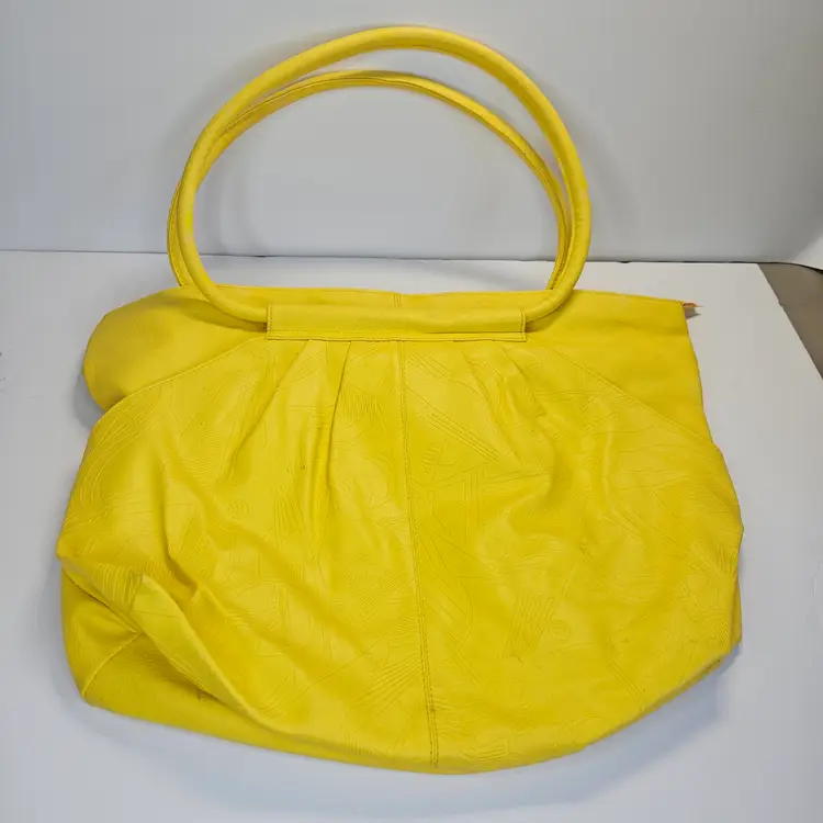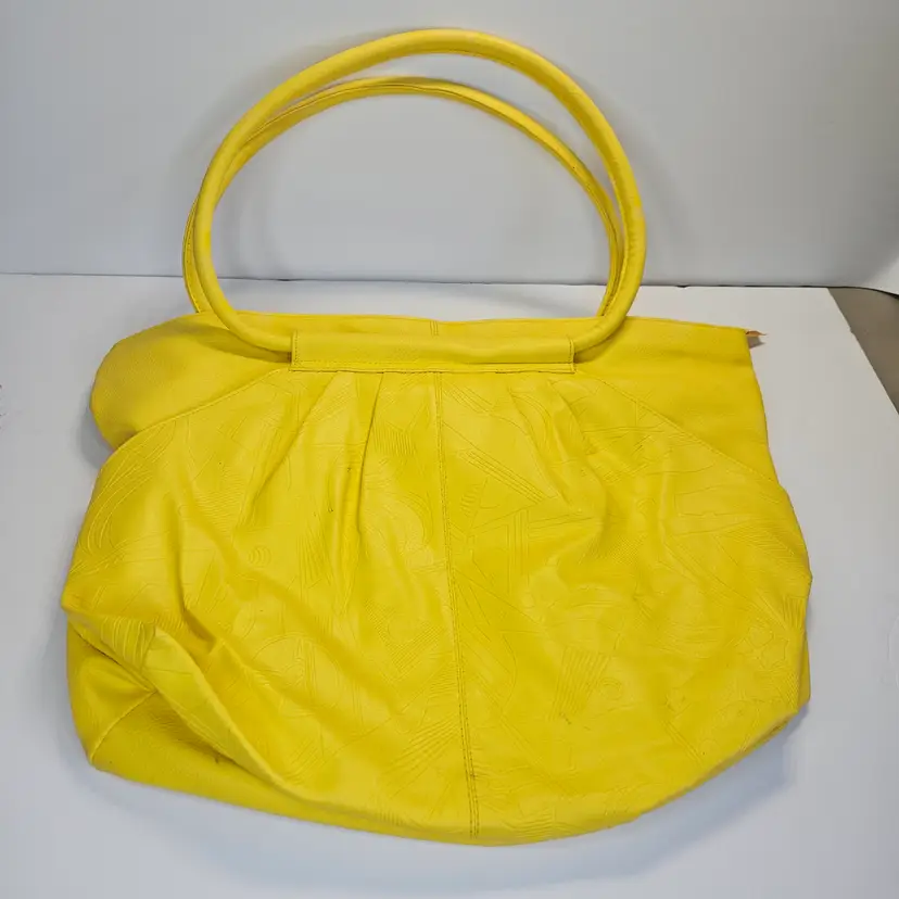 The handbag is made of leather with embossed detailing and fabric lining. This listing includes the main bag with double handles and zipper closure as pictured. A versatile tote style handbag perfect for everyday use or vintage accessory collections.