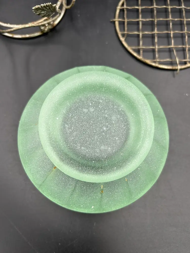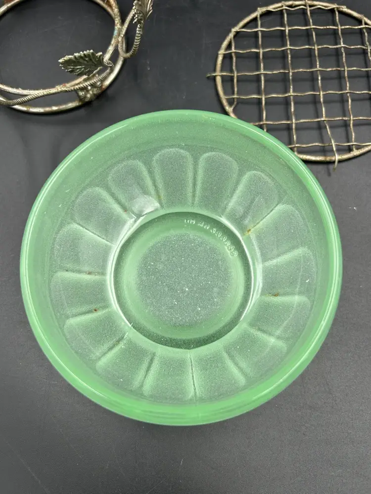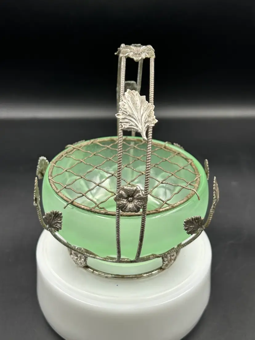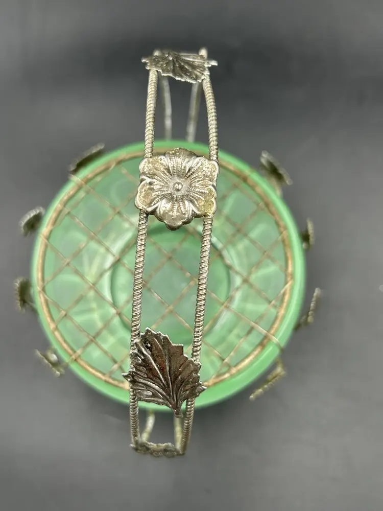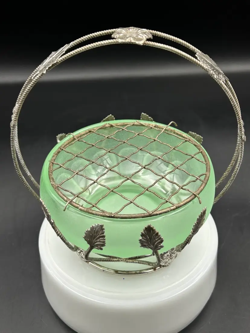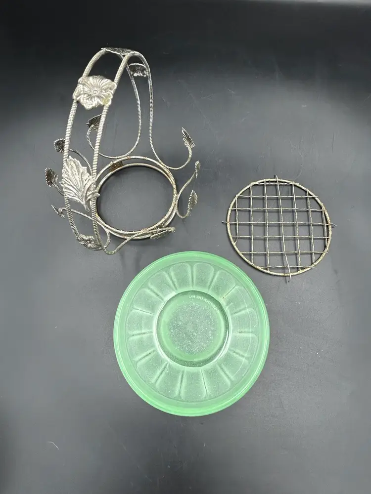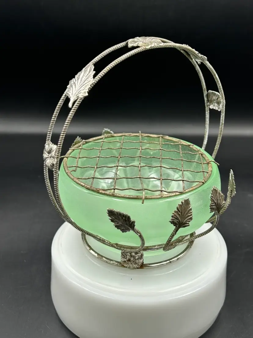 Age related wear on basket mainly around bottom metal ring, see pictures. No chips or cracks on bowl. Flower frog perfect. Basket – 5.5 H X 5.5 W. Bowl – 4W.X 2H. Flower frog – 3.75.”