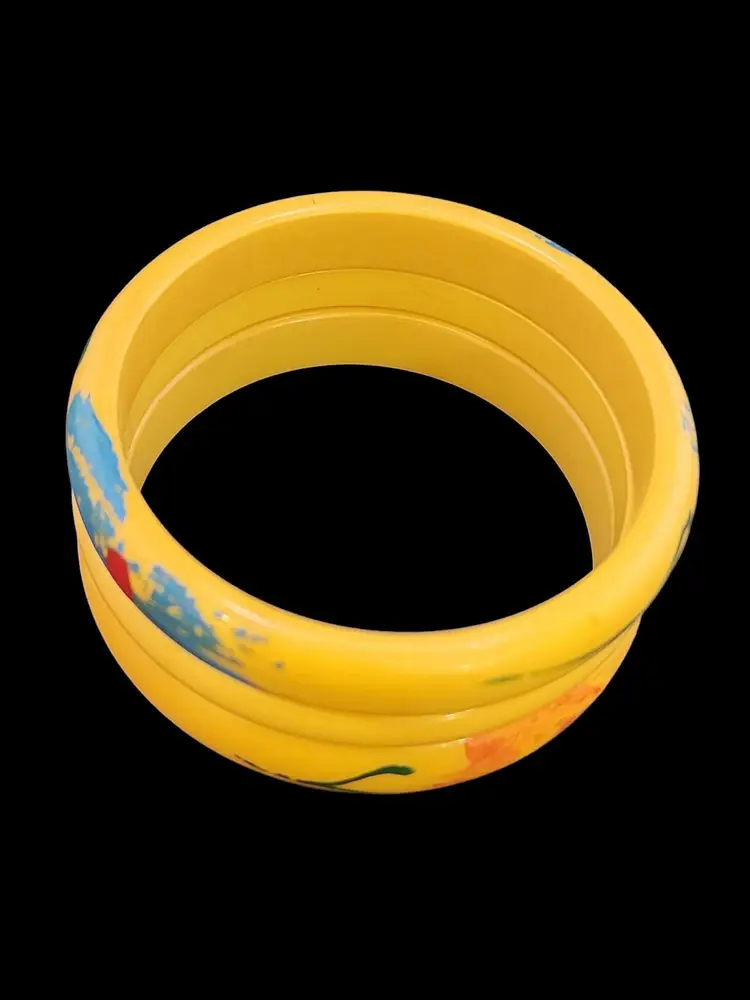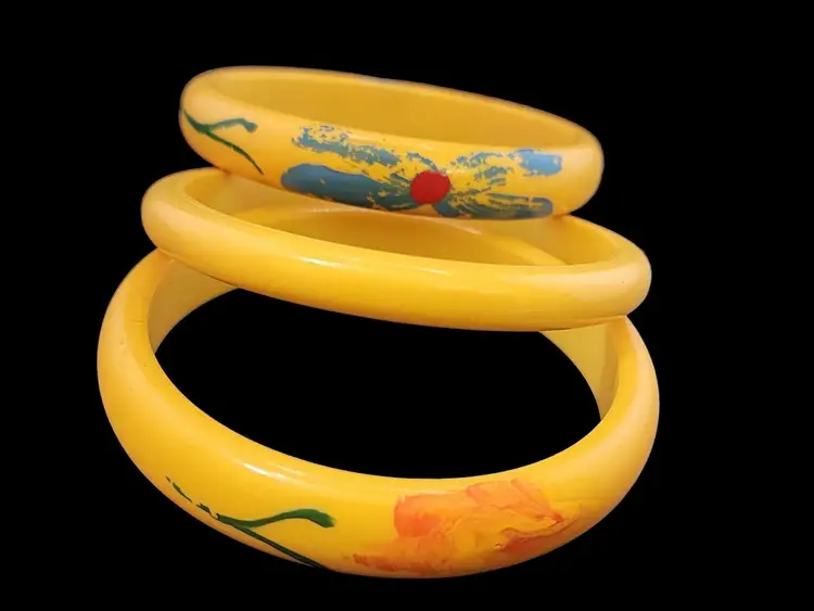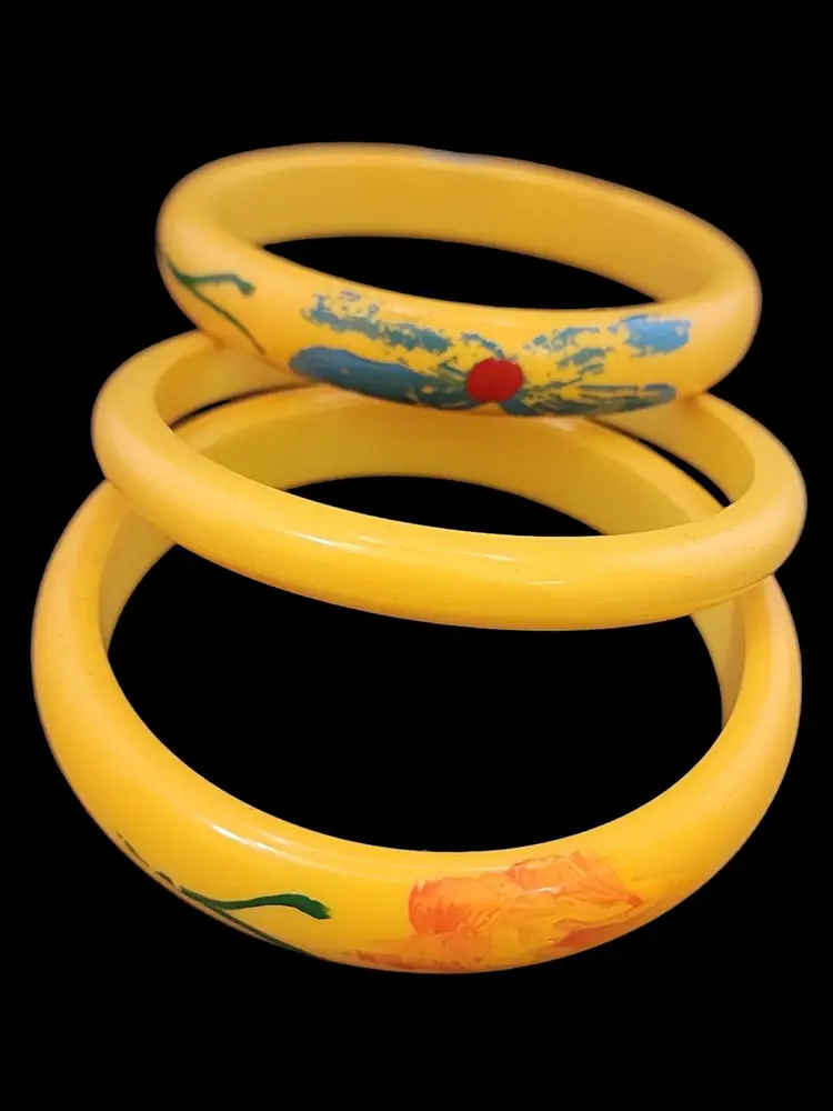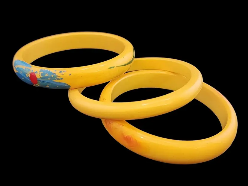 Size: 2.75" inner circumference Color: Yellow Condition: Good vintage; paint is wearing off Signed: None Details: 2 are painted. The plain one is bakelite, and the other ones might be. When tested with Simi chrome they hold faintly.