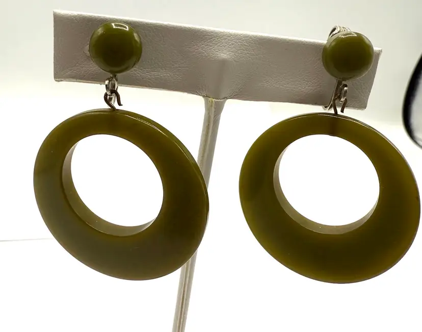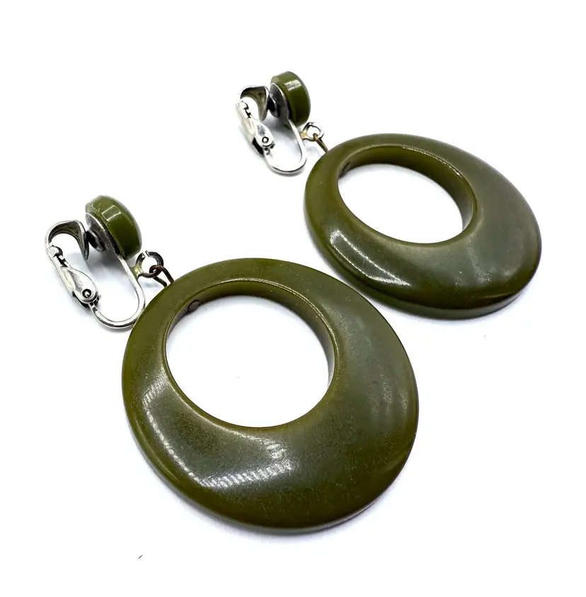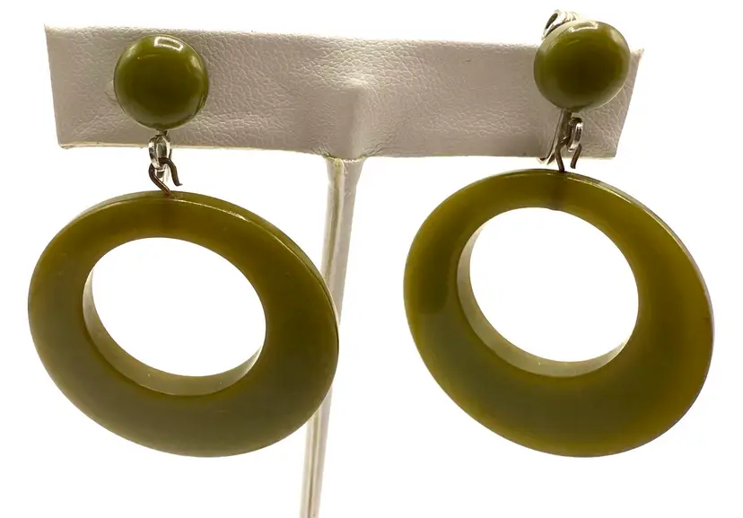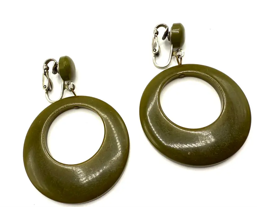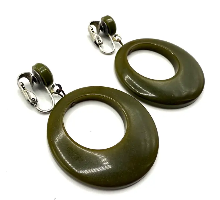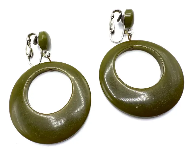These bakelite green hoop dangle earrings are right out of the 60’s with clip on backs. Such a trendy pair of earrings featuring a green that is ever so popular today. Everyone must have one pair of these gorgeous style of earrings. 2 1/2 inches long by 1 inch in diameter Excellent vintage - remarkable to find them in such great condition