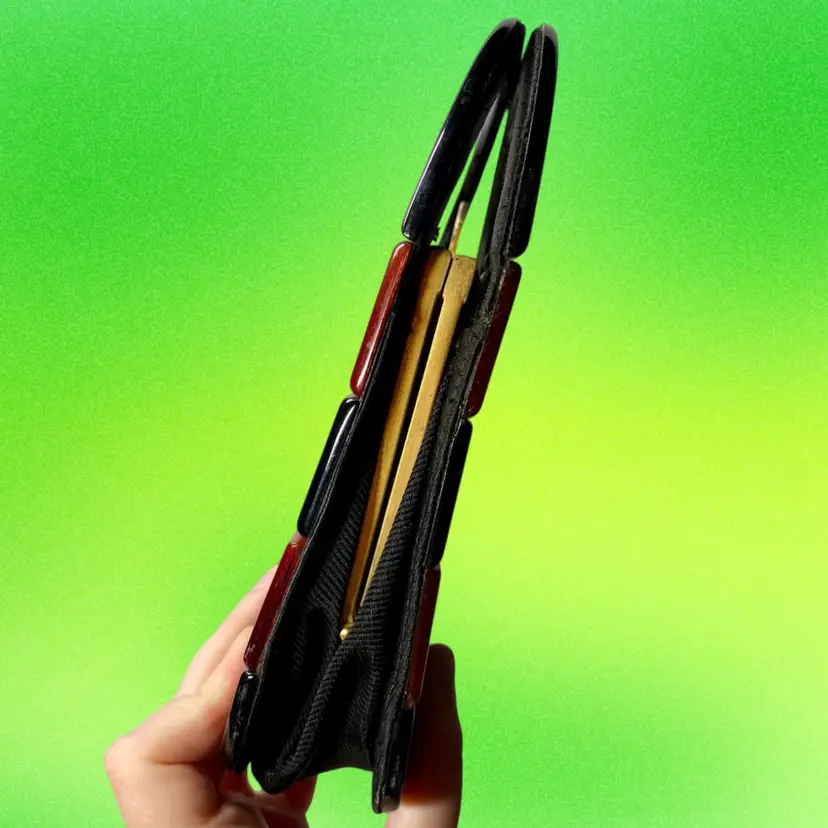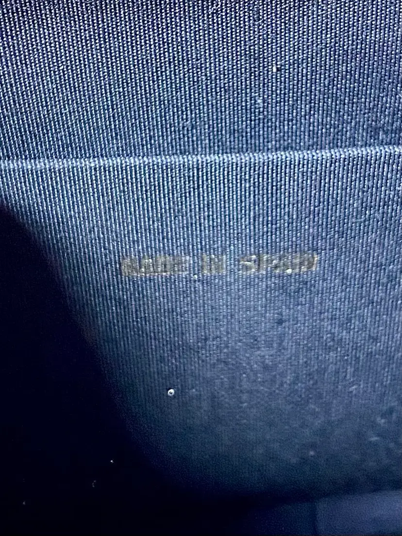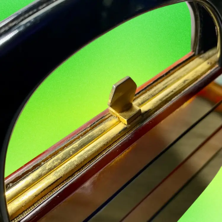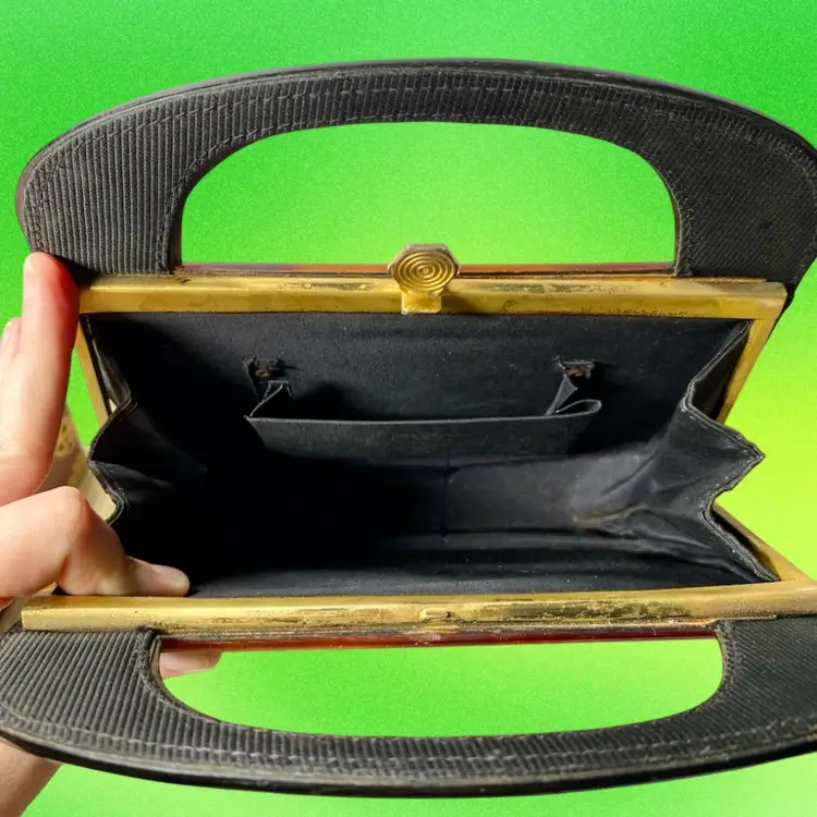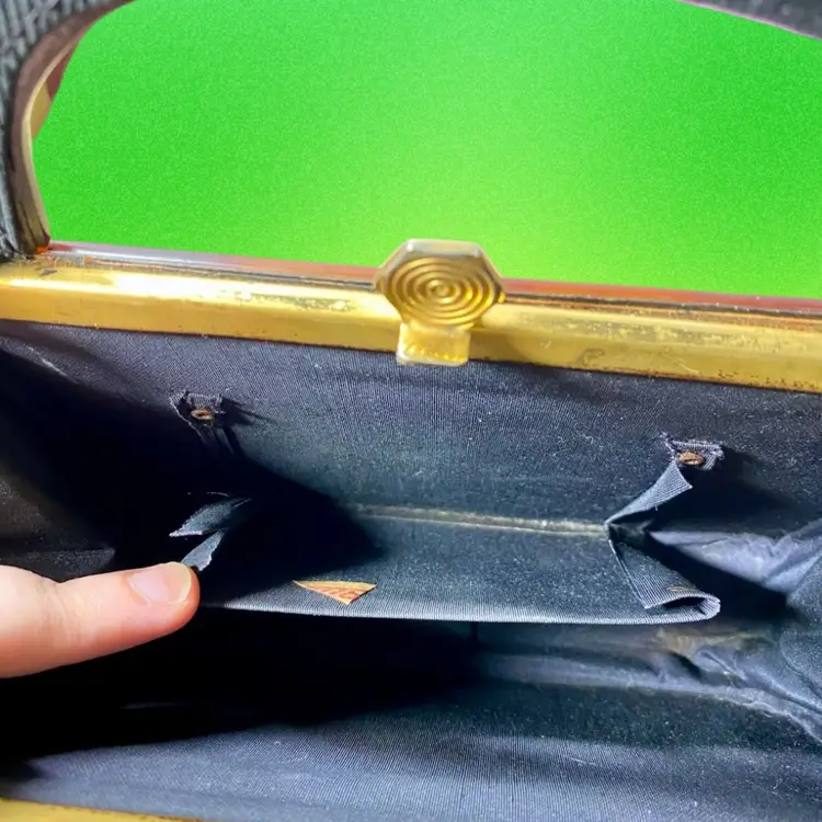 8.25”x8.25”x1.5” (closed). Made in Spain - stamped on pocket. Sides of inner pocket are disconnected from wall of purse. Gold tone on edge of purse opening is a bit worn. Clasp mechanism works well. Clean overall.
