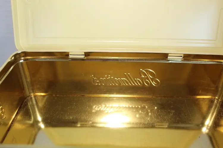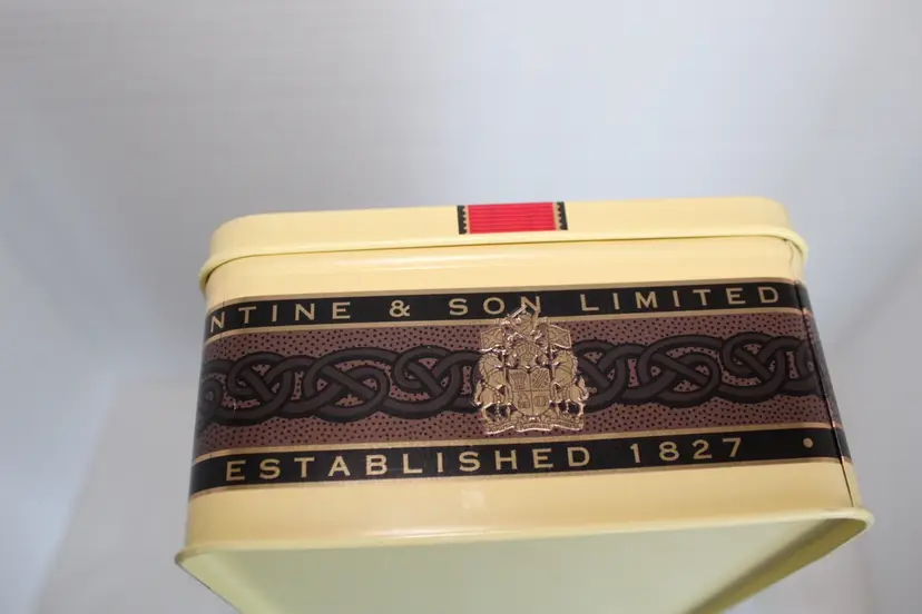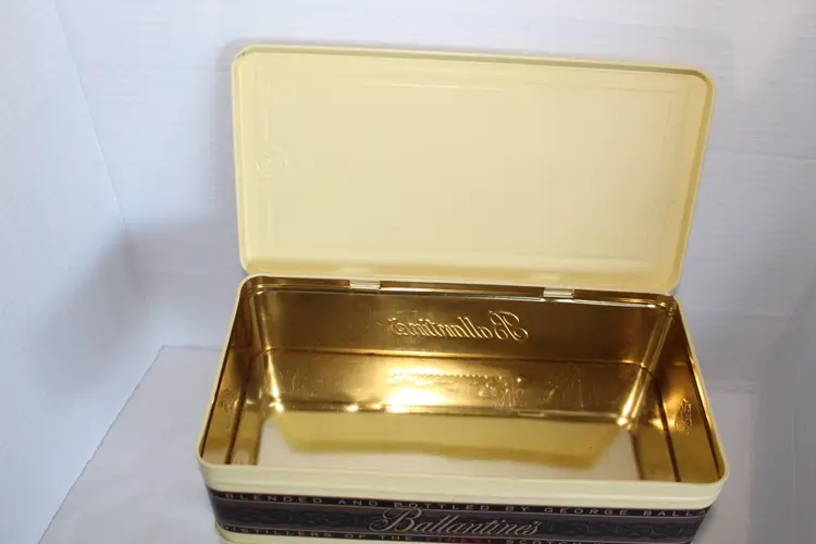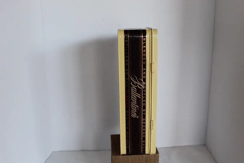 The Vintage Ballantine's Scotch Whisky metal box from 1990 is a unique collectible item featuring a hinged tin with multi-color advertising. This original piece represents the distillery's theme and is a rare find from the United Kingdom, showcasing the iconic Ballantine's brand along with its Scotch Whisky drink type. Perfect for collectors of vintage distillery memorabilia, this item captures a piece of whisky history from the 1990s. No scratches or dents. Excellent condition. Tin measures 9.75 in length, 5 inches in width and 2.75 inches high.