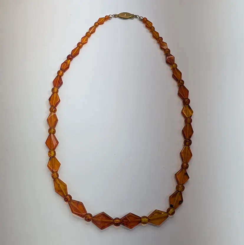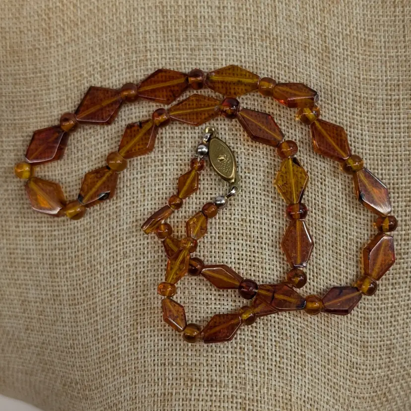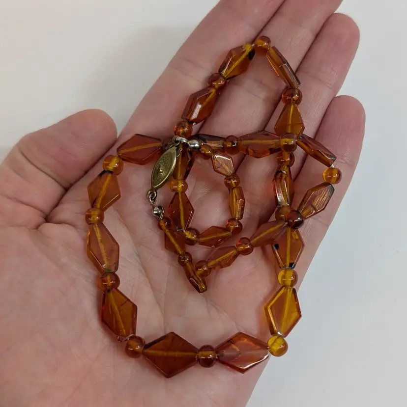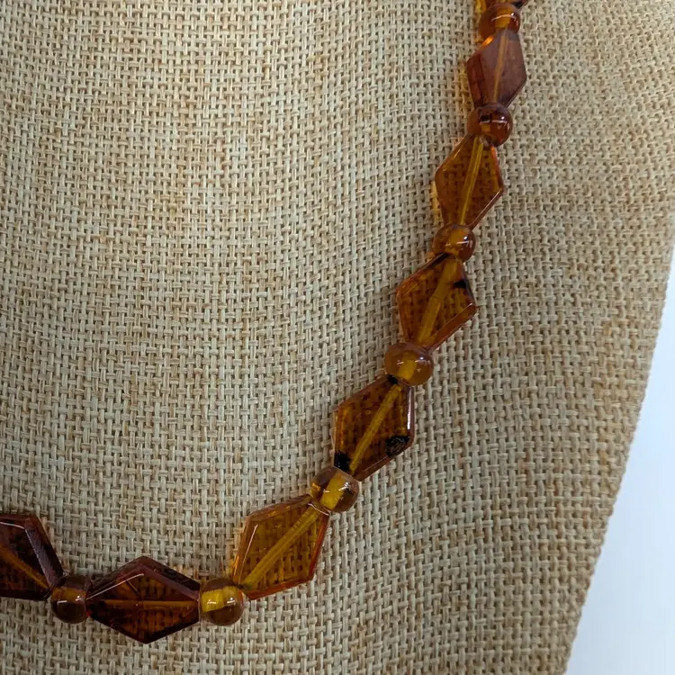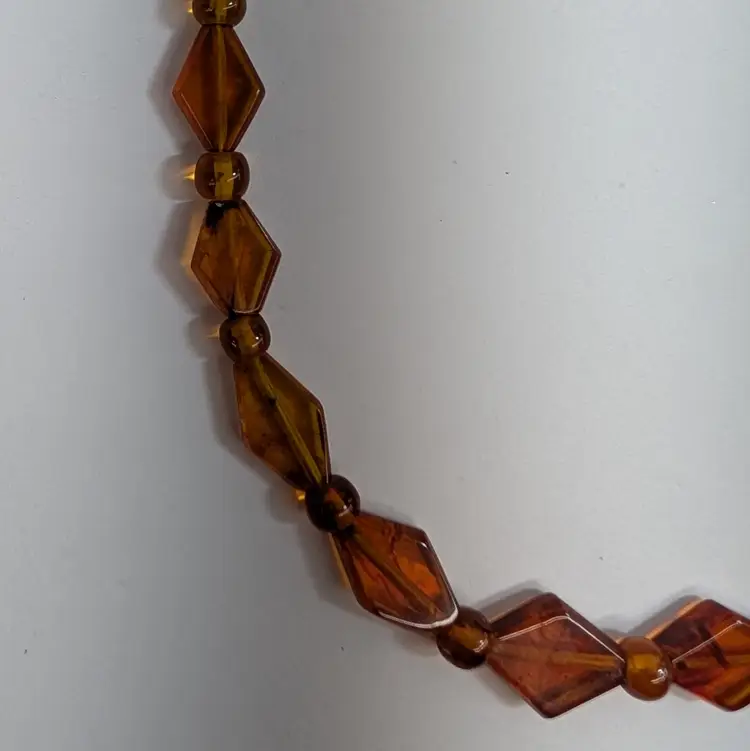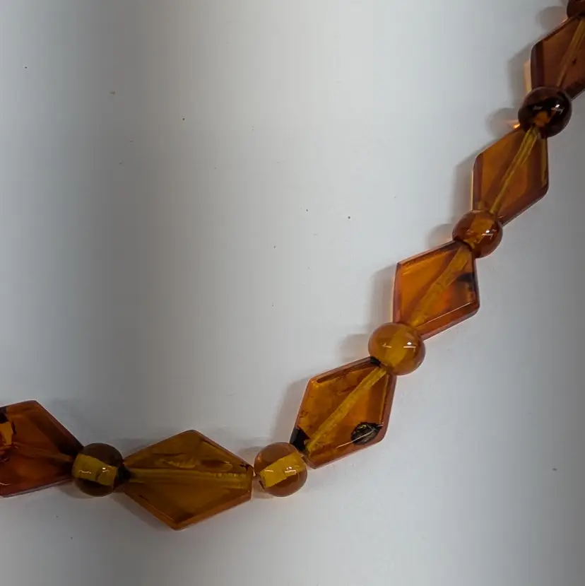 Lovely amber necklace with graduated beads that are diamond shaped with faceted edges and round spacer beads. They glow under UV light and have some inclusions (see pictures). There are two beads that are a little broken so the string pulls through which you may be able to fix with some resin or super glue to keep the current necklace layout (see pictures). Measurements ~ 18.5" long and 10 grams