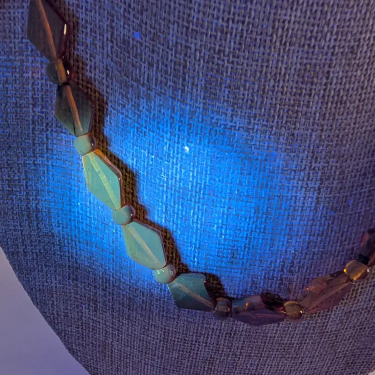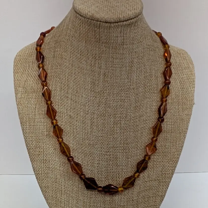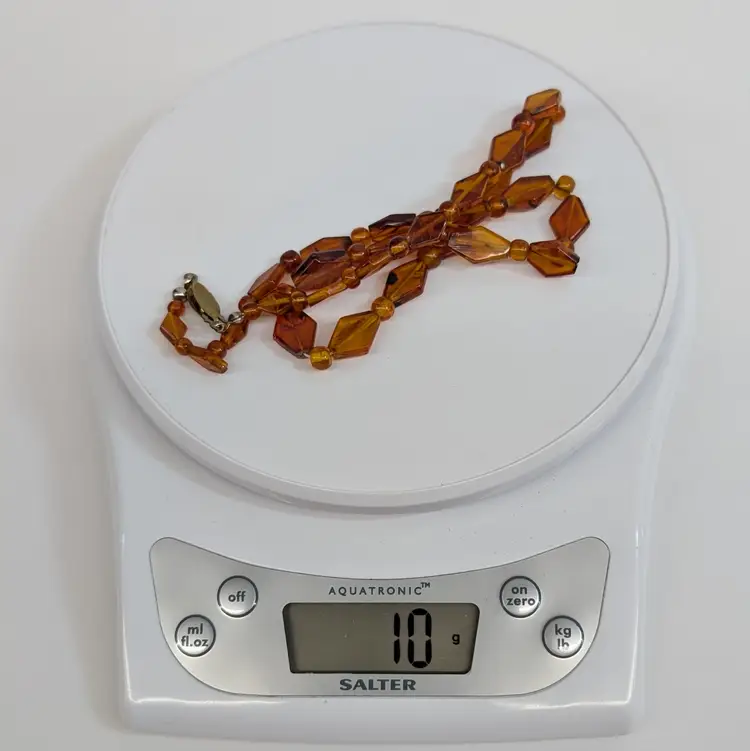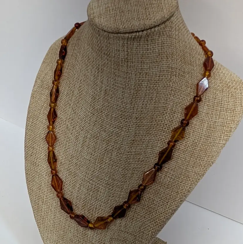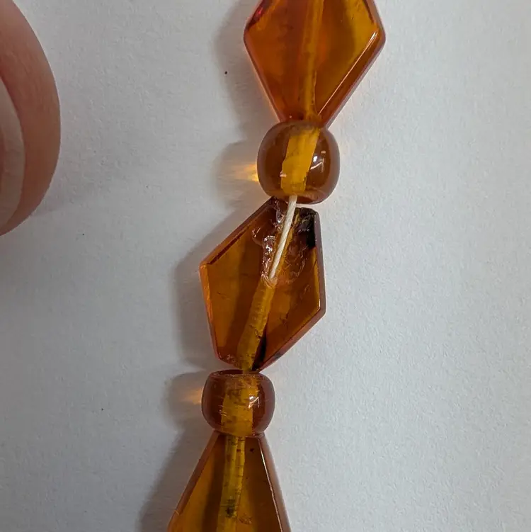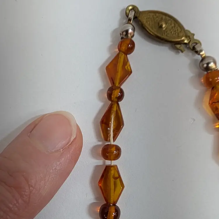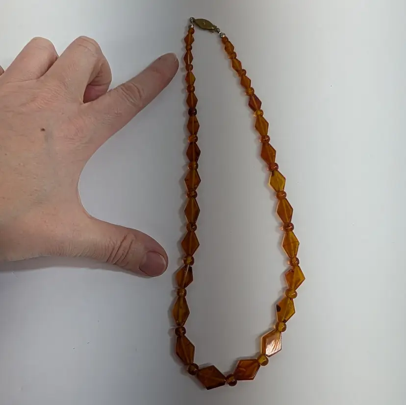 Lovely amber necklace with graduated beads that are diamond shaped with faceted edges and round spacer beads. They glow under UV light and have some inclusions (see pictures). There are two beads that are a little broken so the string pulls through which you may be able to fix with some resin or super glue to keep the current necklace layout (see pictures). Measurements ~ 18.5" long and 10 grams