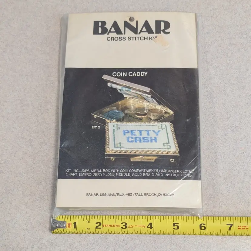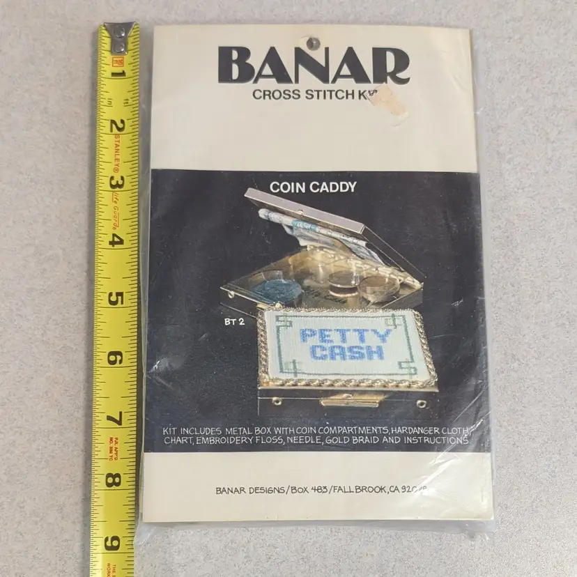 Make your own custom cross stitch coin caddy, petty cash compact or money clip! You can use the cross stitch chart or make up your own. The kit has never been opened. Kit includes: metal box with coin compartments, hardanger cloth, chart, embroidery floss, needle, gold braid and instructions.