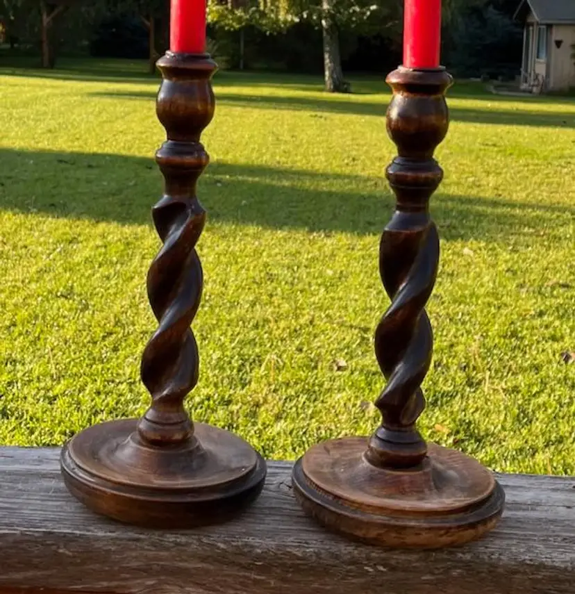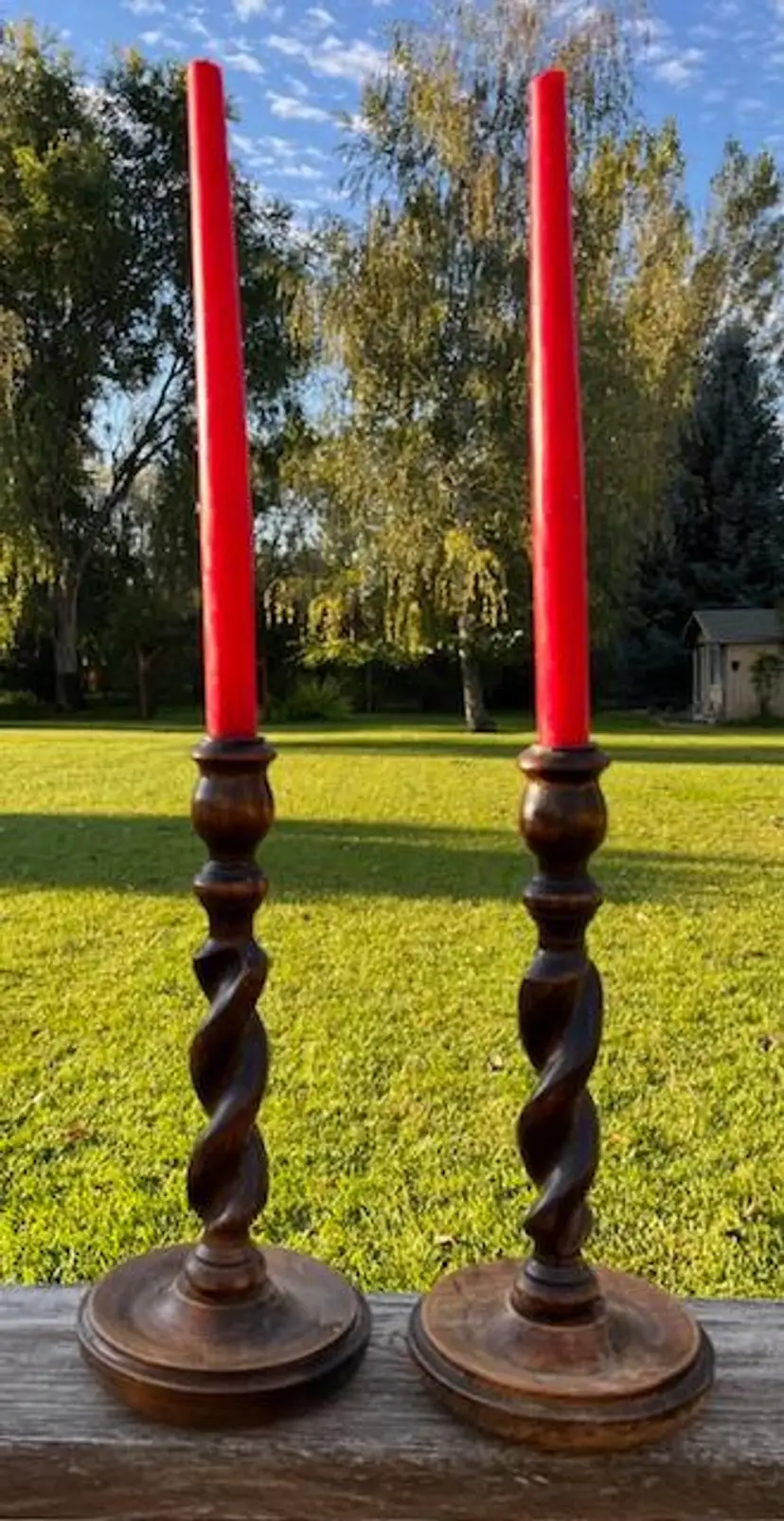 A nice medium sized set of wooden candle holders. I believe the wood is oak. Approximately 11 1/4" Tall and 5 1/4" Wide at the base.