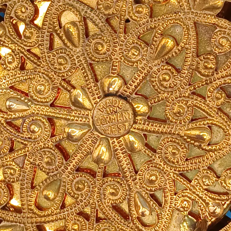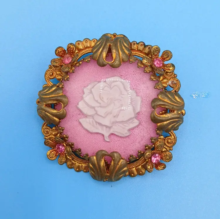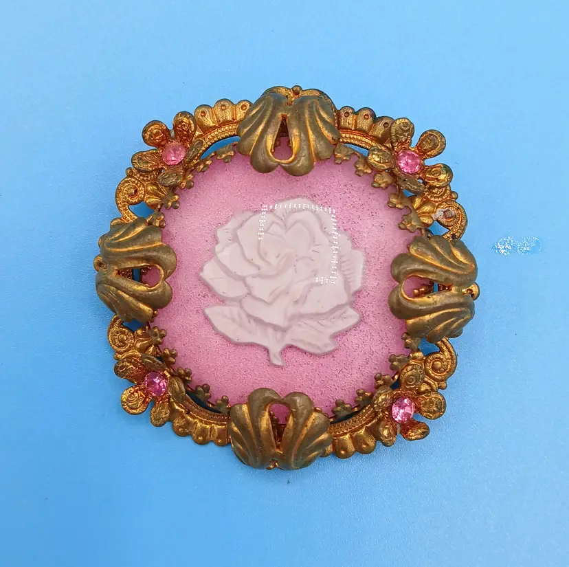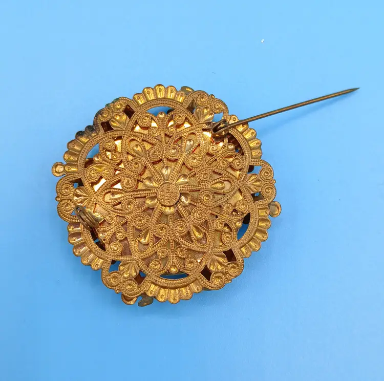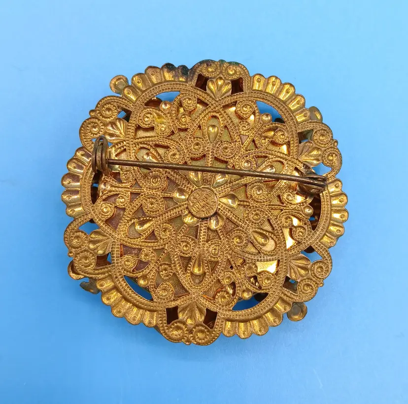 Glass on this brooch has a couple of scratches. All the stones are present and clasp works. Measures approx 2" x 2". Thanks for looking!