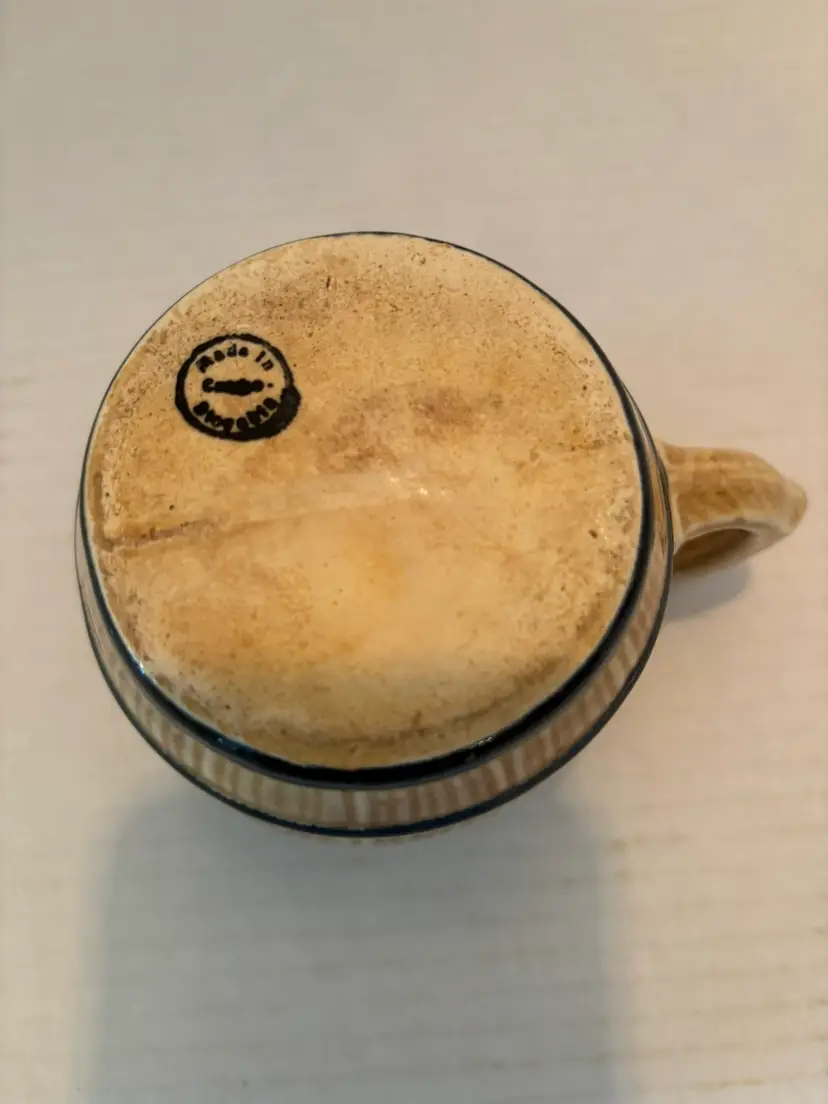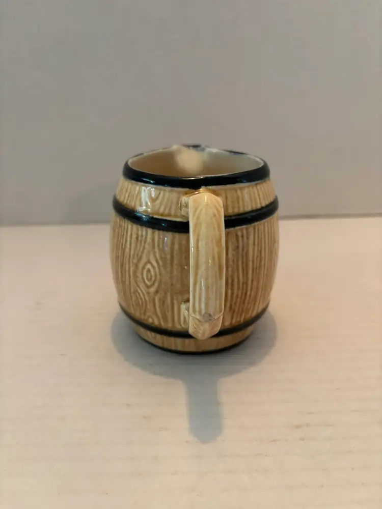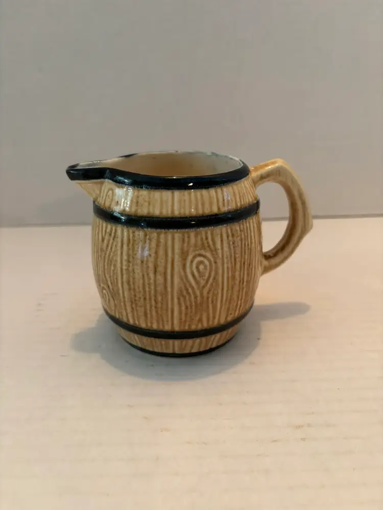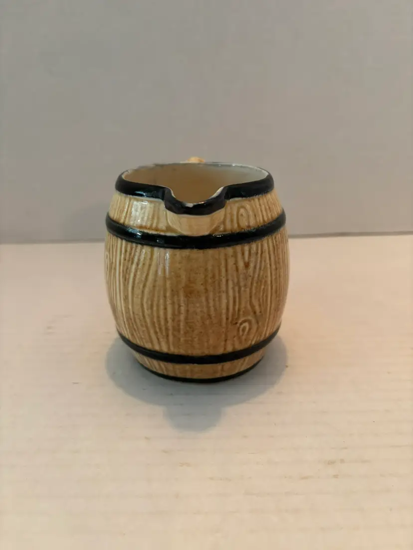 This vintage creamer is a charming addition to any collection, featuring a unique barrel shape and a light tan color made in Czechoslovakia. The ceramic material and glossy finish add to its elegance, while the printed backstamp indicates its authenticity. Standing at 3.5 inches tall, this original piece from the Czech Republic is a testament to the craftsmanship and artistry of pottery production. Perfect for serving cream or milk at the dinner table or as a decorative piece in a kitchen or dining room.